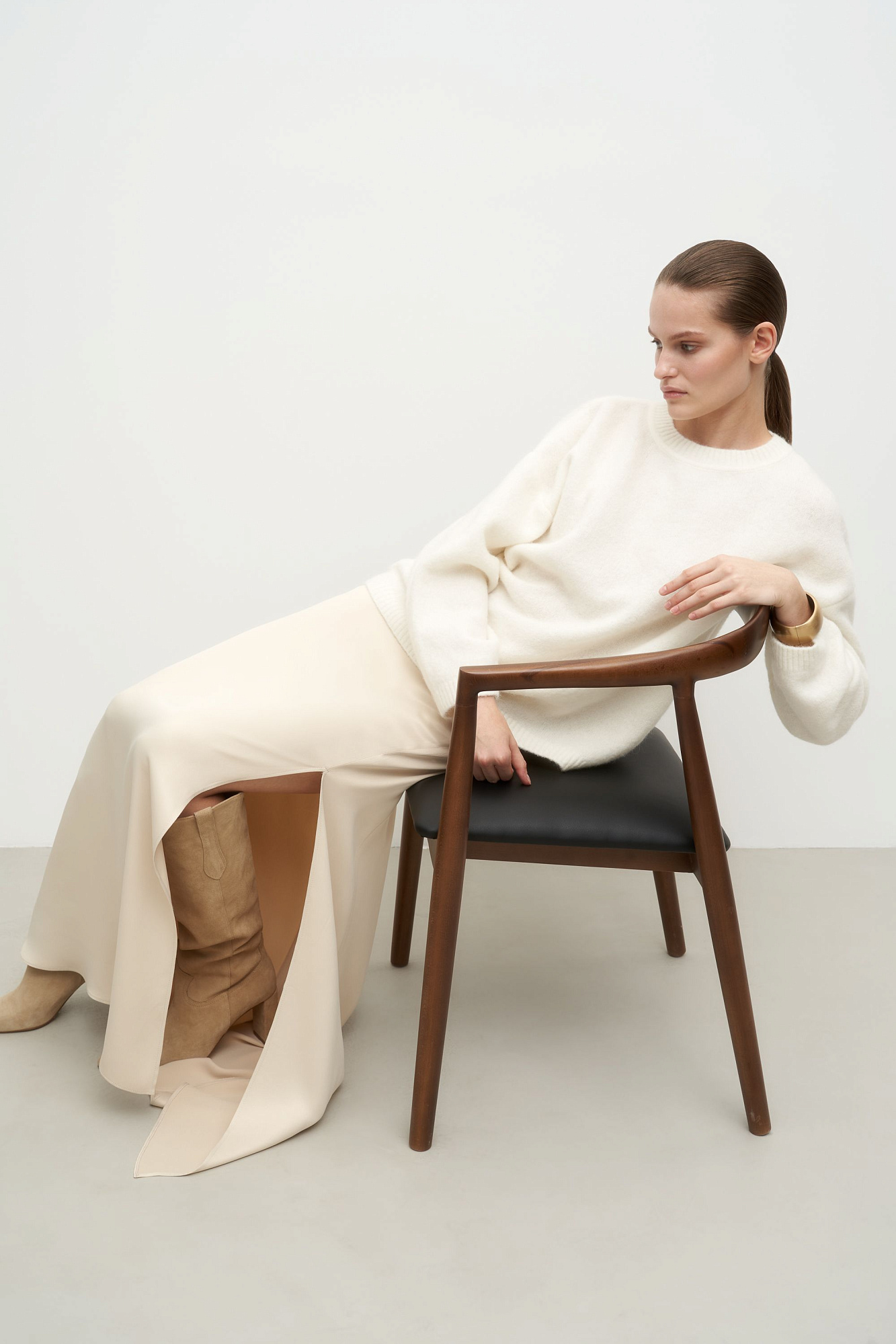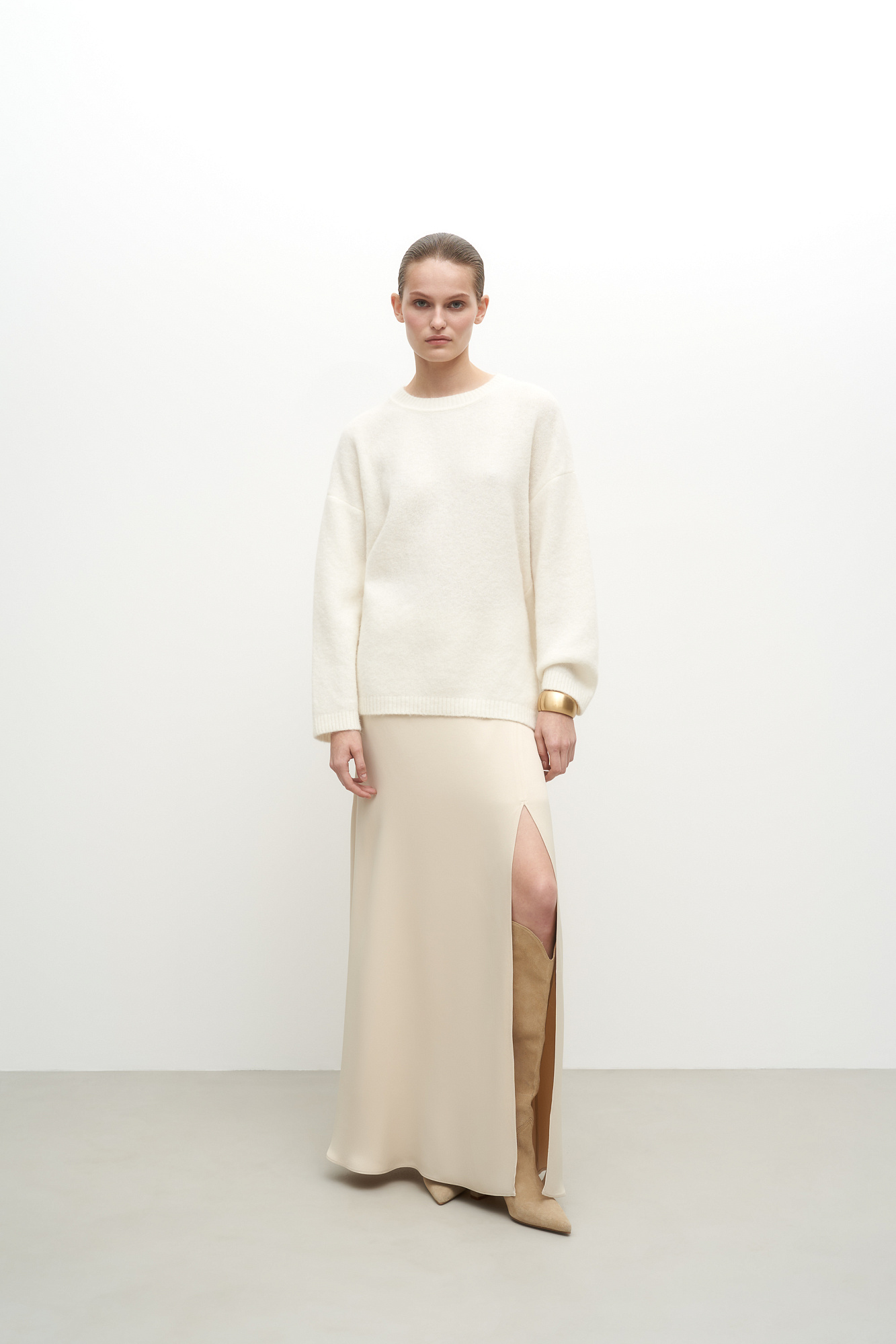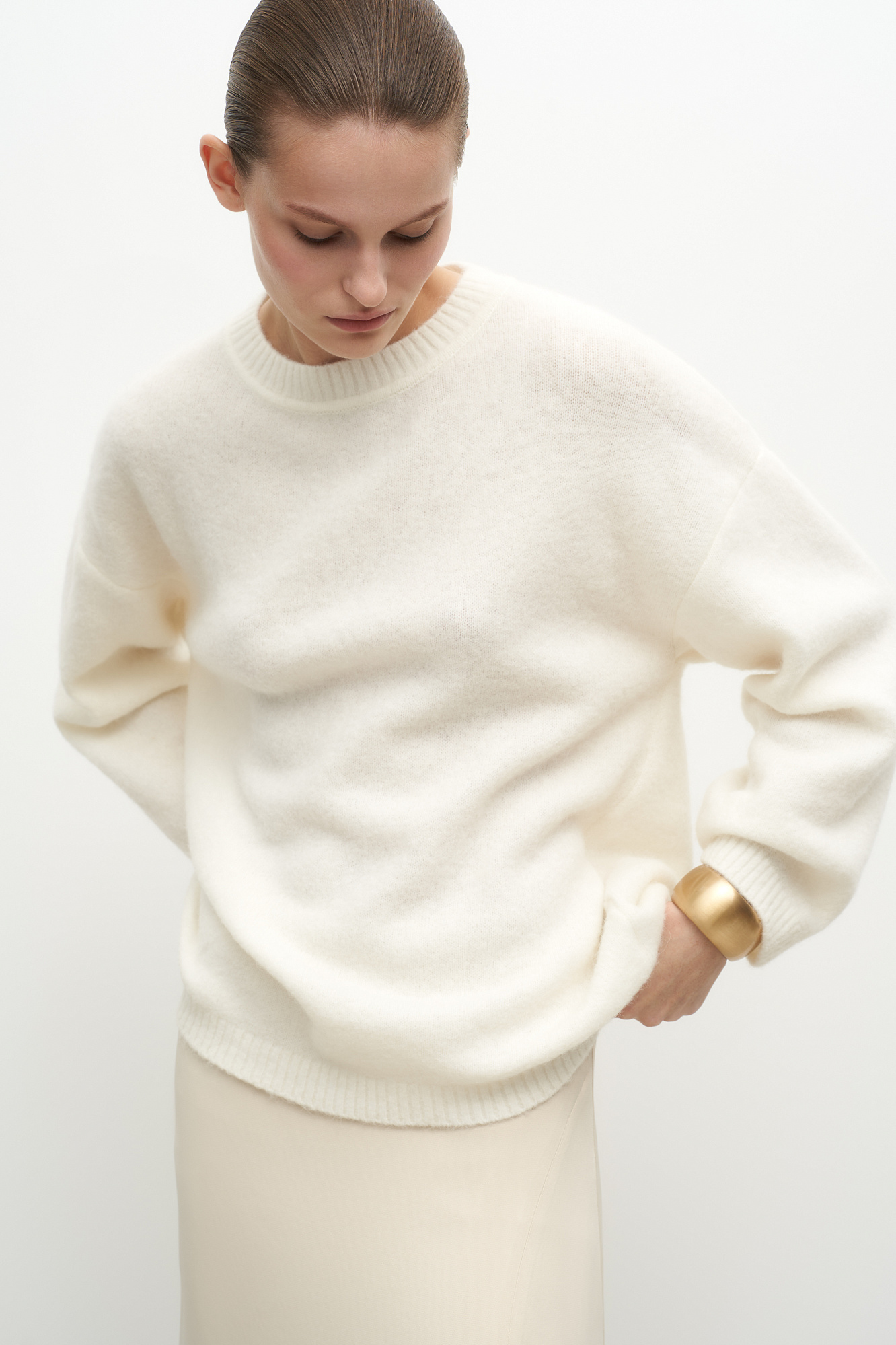 Трикотажный джемпер c шерстью альпака. Модель свободного силуэта со спущенной линией плеча и открытой спиной с кулиской. Края изделия в рубчик.