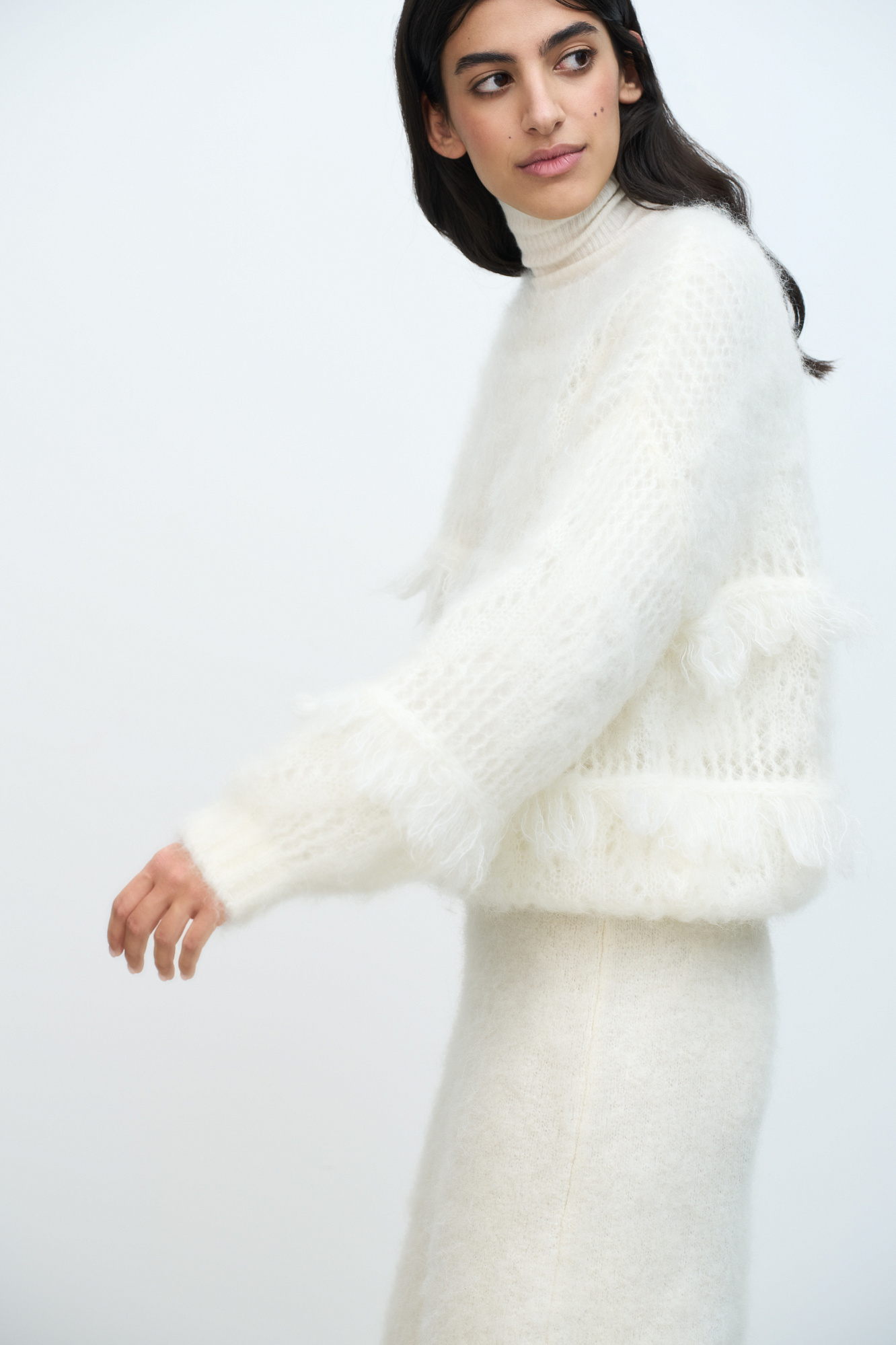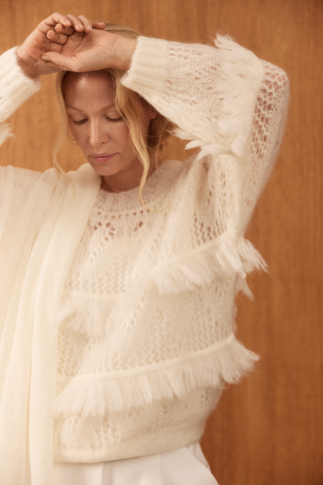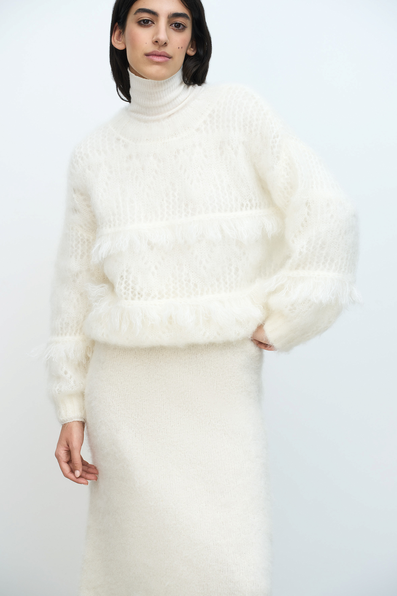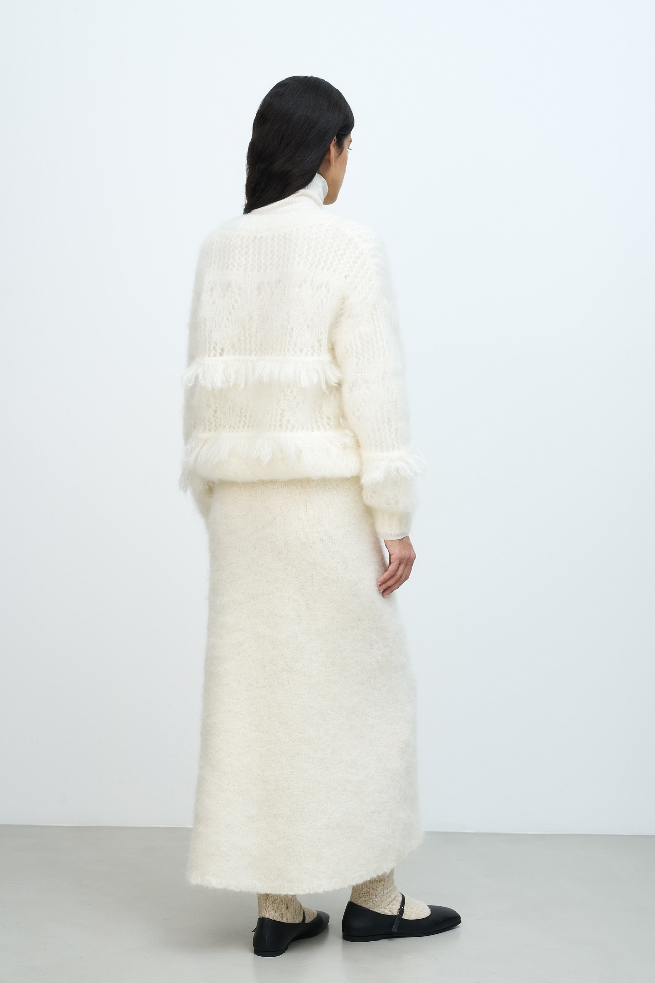 Ажурный джемпер с вывязанным узором и бахромой. Модель свободного силуэта со спущенной линией плеч и круглым вырезом горловины. Края изделия выполнены в рубчик.