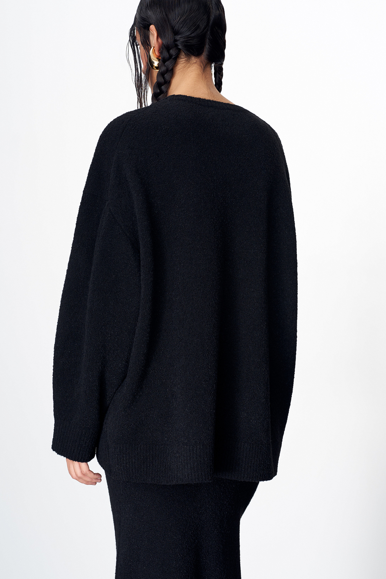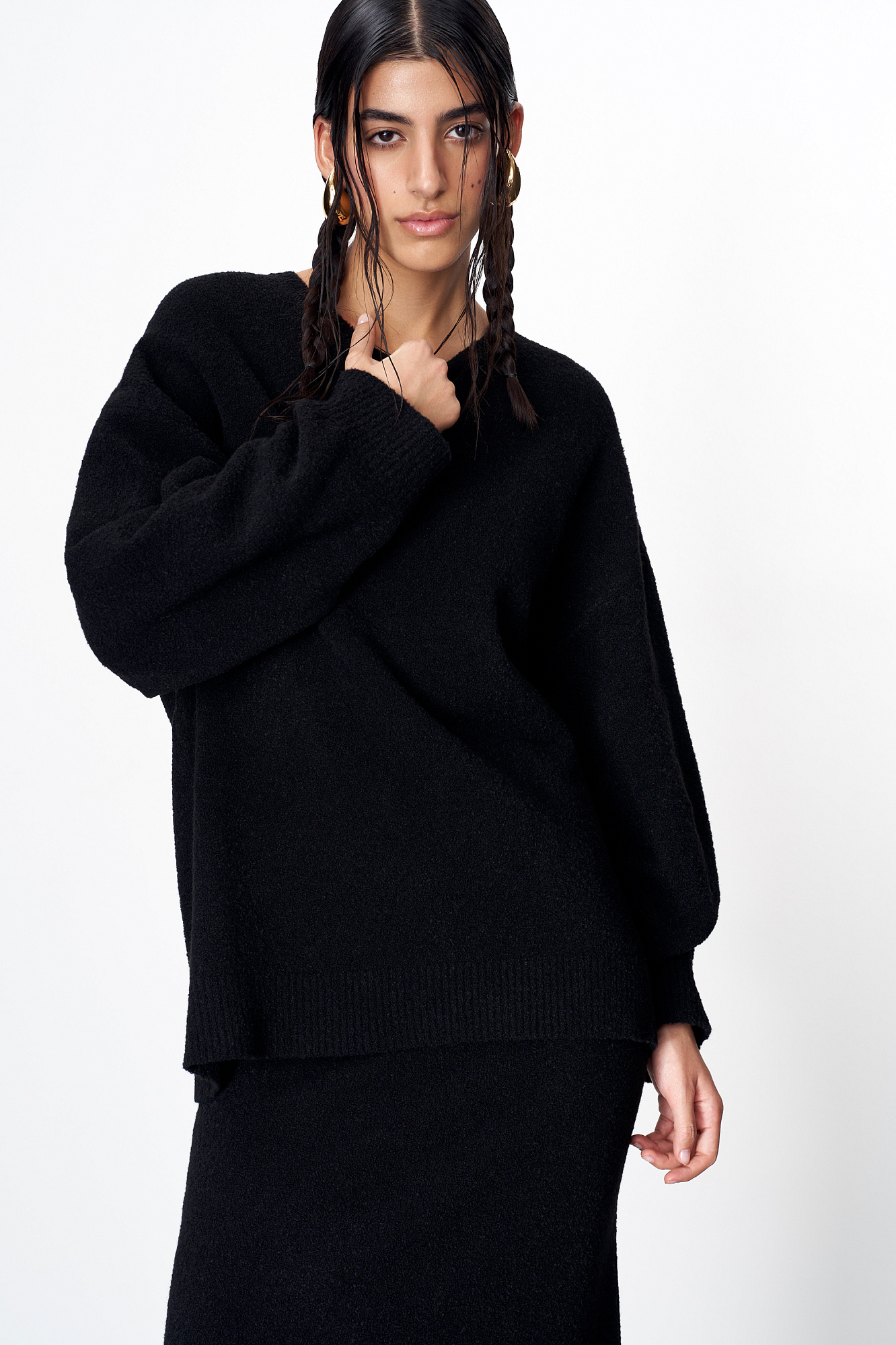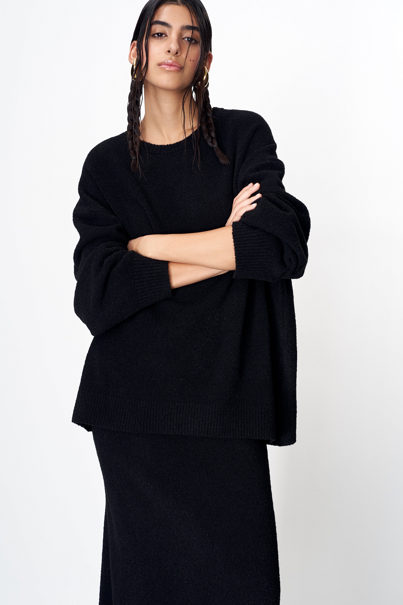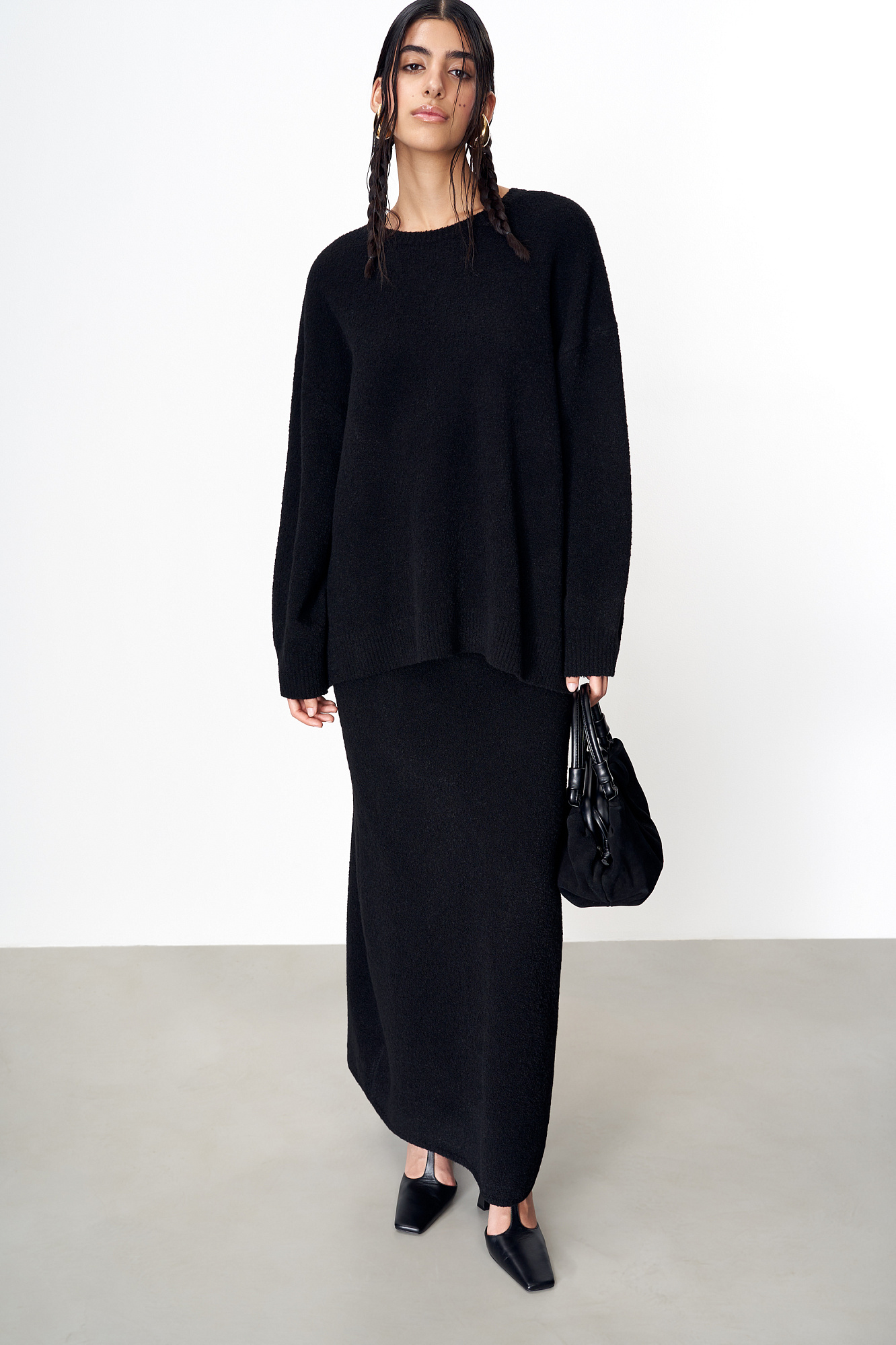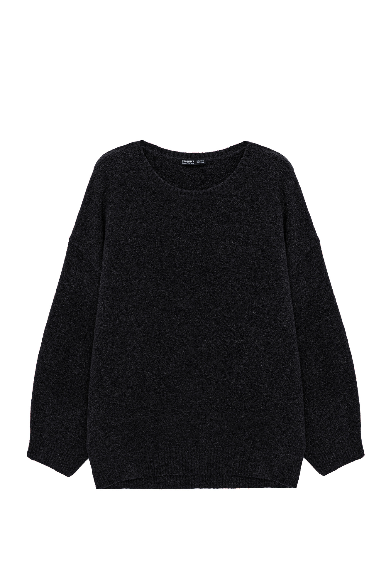 Трикотажный джемпер из смесовой шерсти со свободным силуэтом и спущенной линией плеча. Края изделия связаны в рубчик. Дополнить образ можно юбкой такого же стиля.