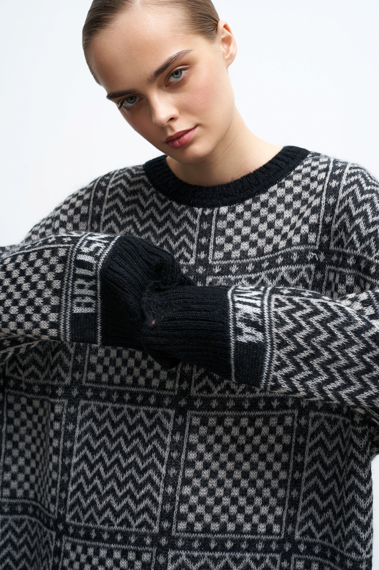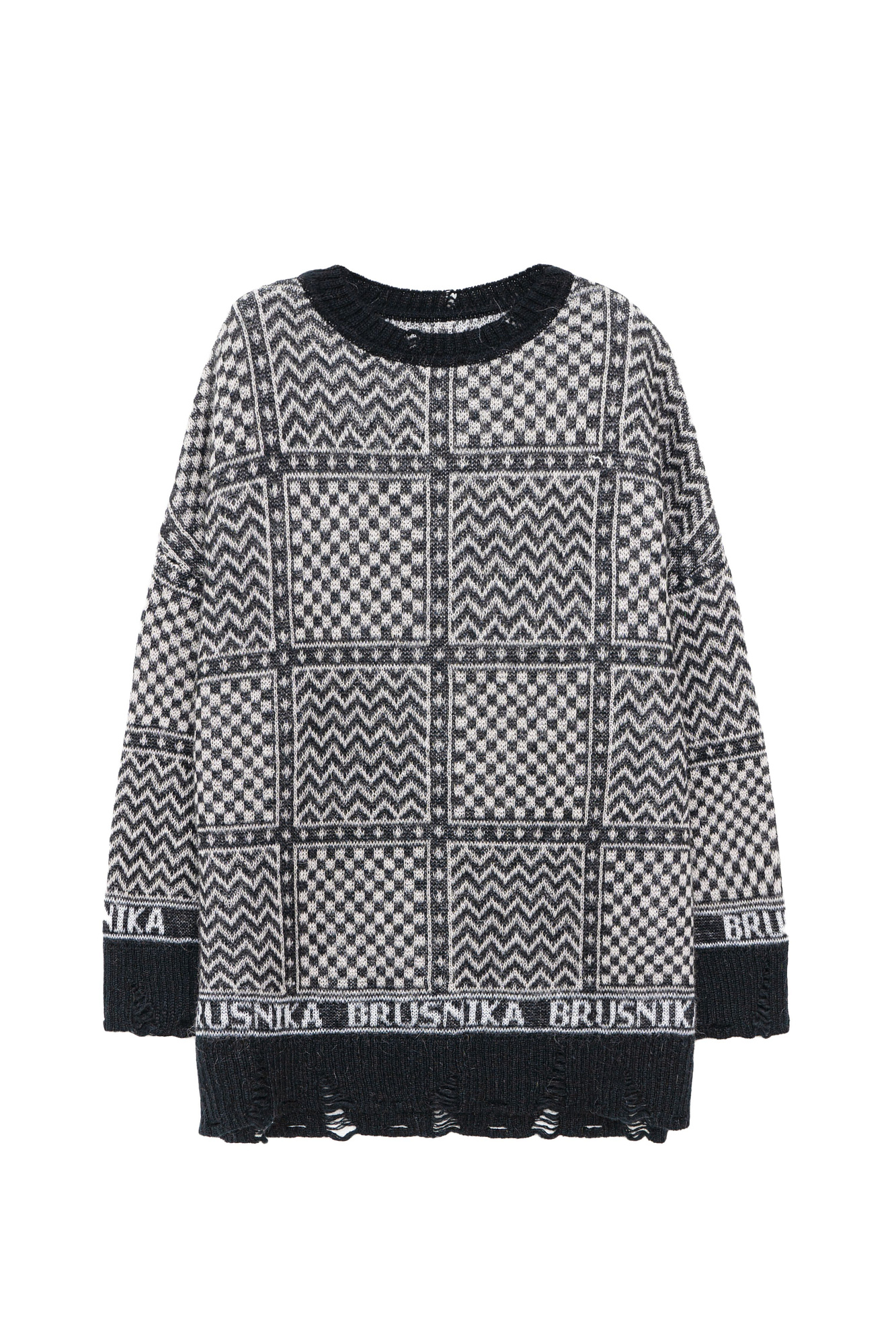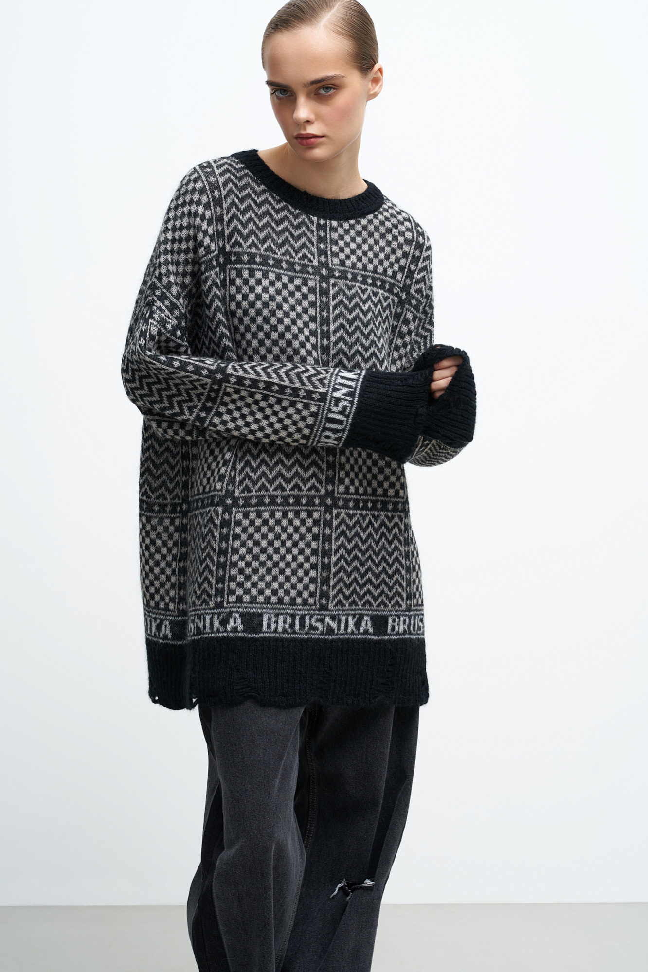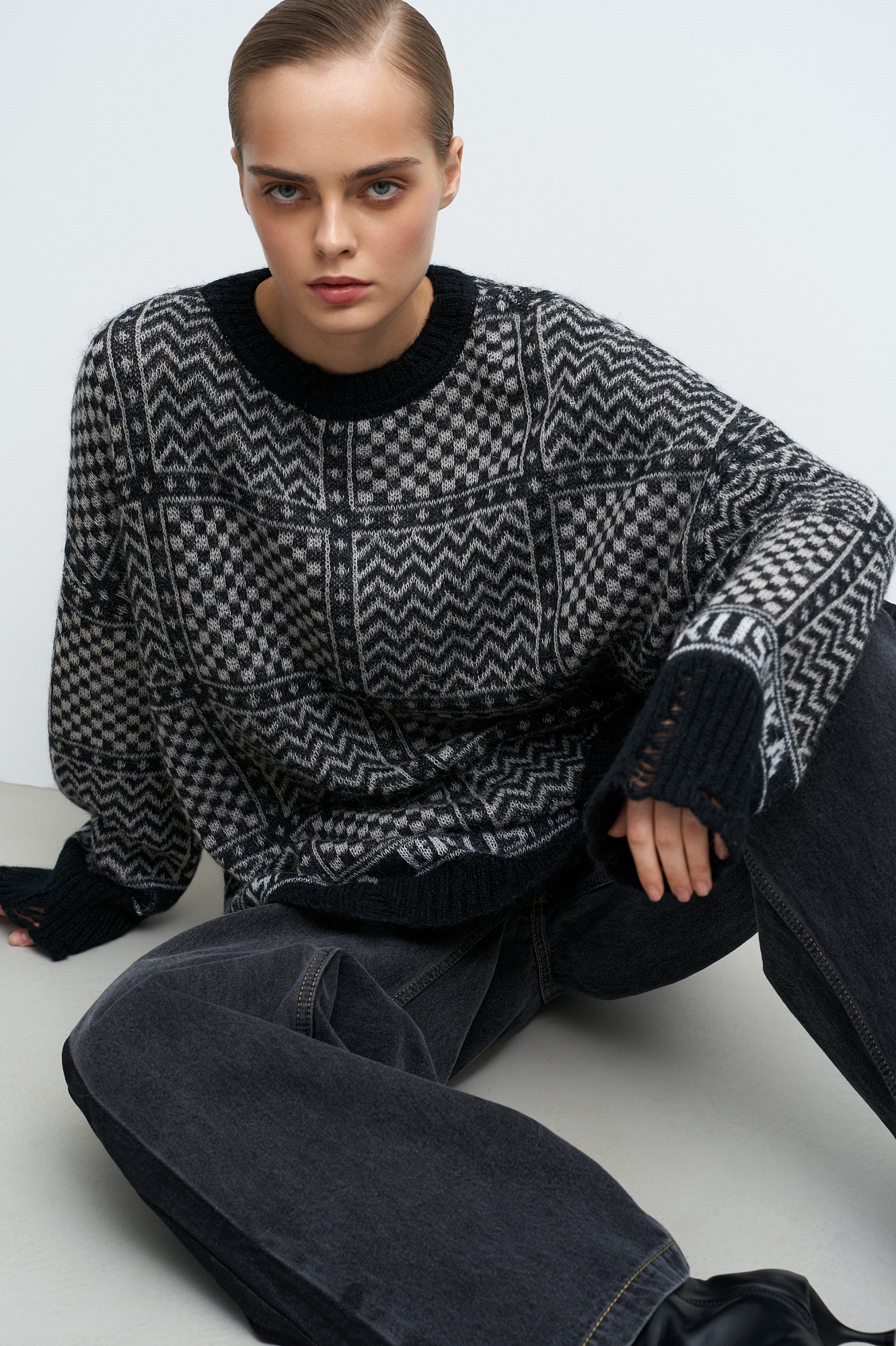 Трикотажный джемпер с жаккардовым узором "Шахматная доска". Модель свободного силуэта, выполнена из шерсти с добавлением мохера, со спущенным плечом и необработанным низом.