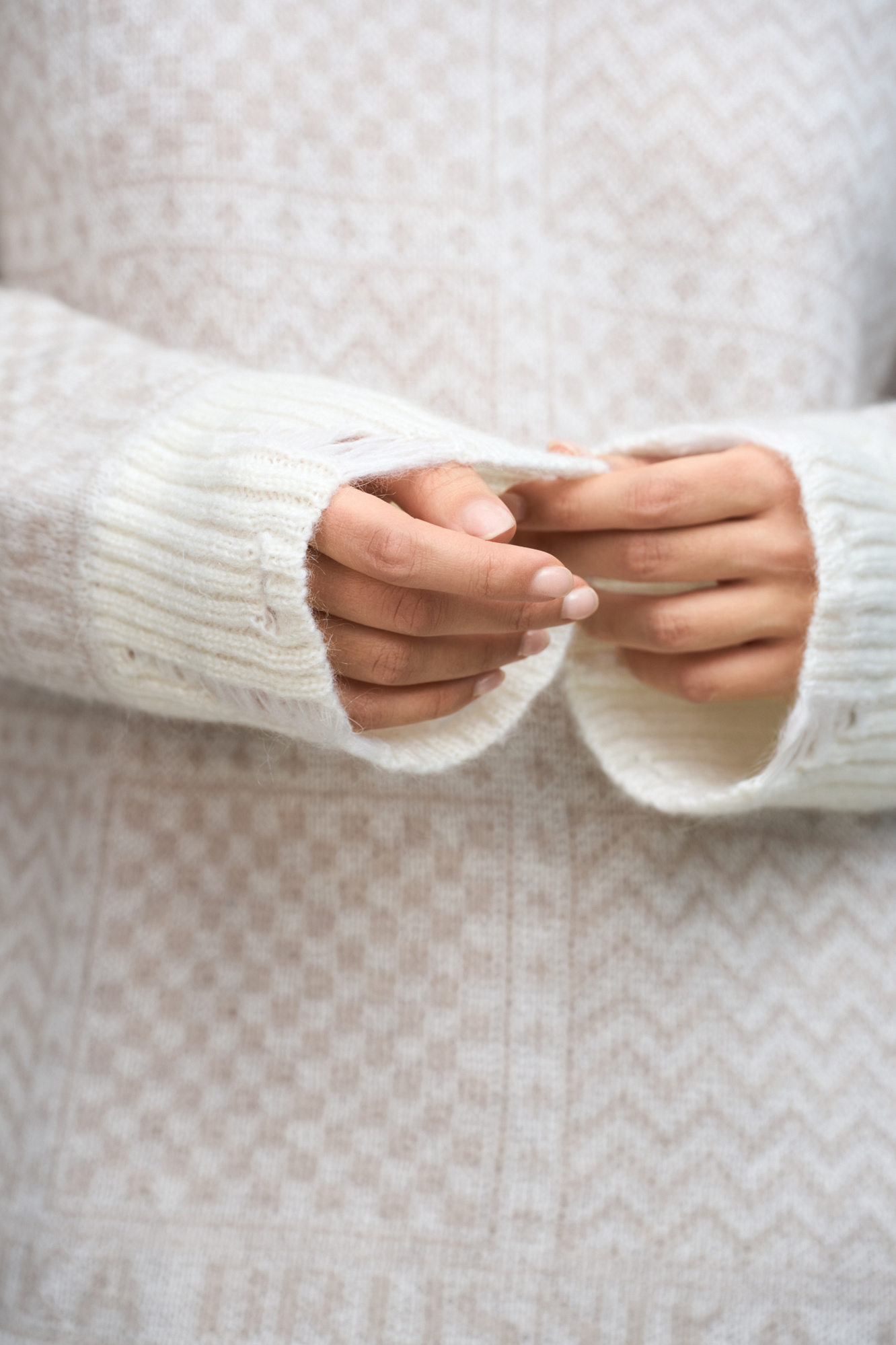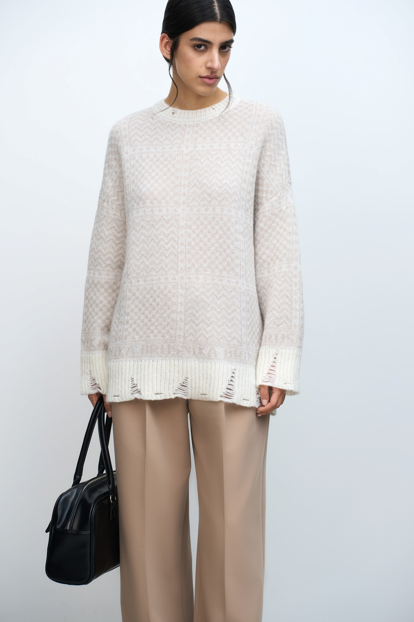 Трикотажный джемпер с жаккардовым узором "Шахматная доска". Модель свободного силуэта, выполнена из шерсти с добавлением мохера, со спущенным плечом и необработанным низом.
