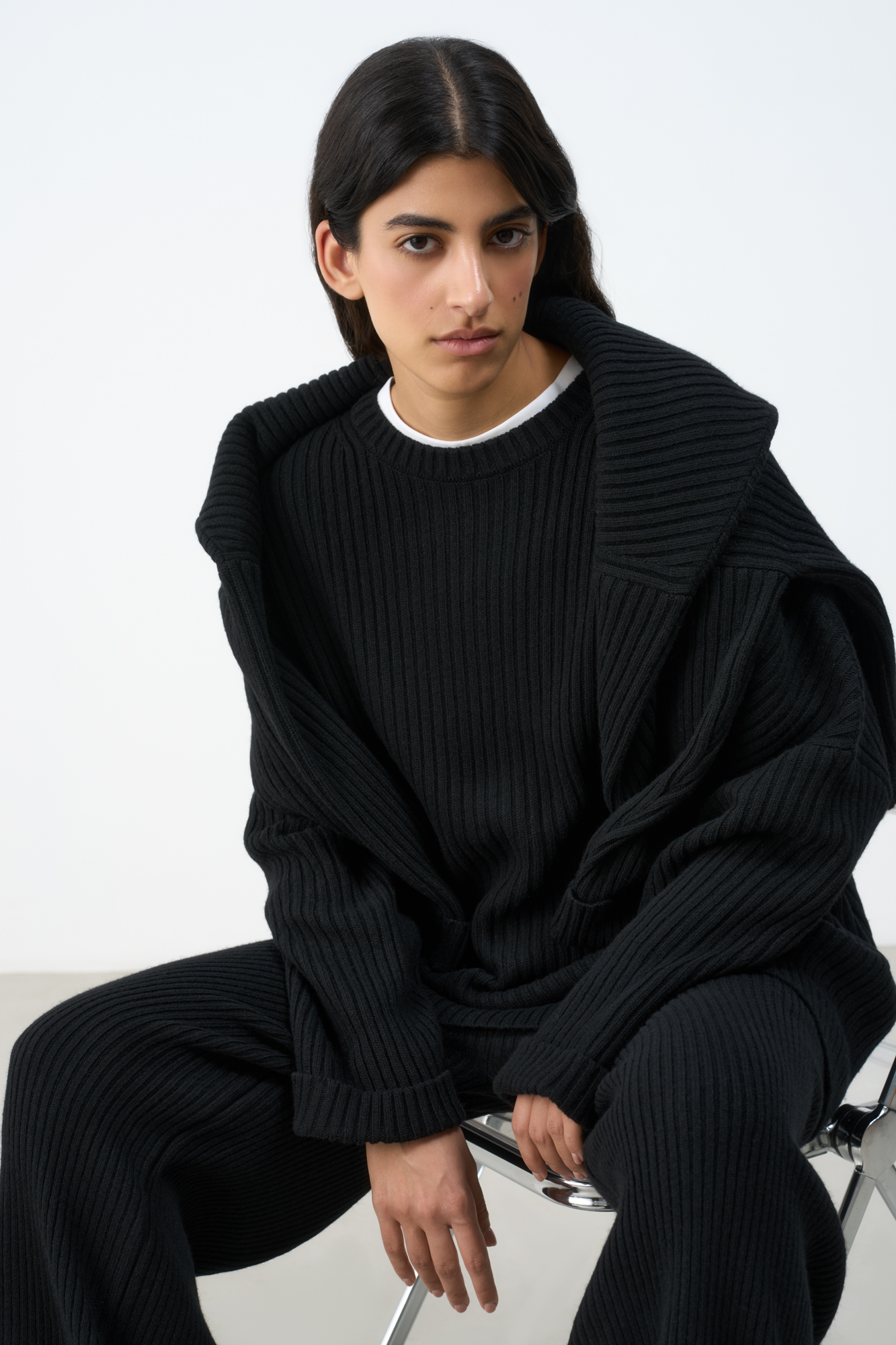 Трикотажный джемпер из шерсти с добавлением кашемира. Модель свободного силуэта со спущенной линией плеча, отворотами на манжетах и круглым вырезом горловины. Изделие выполнено в широкий рубчик.