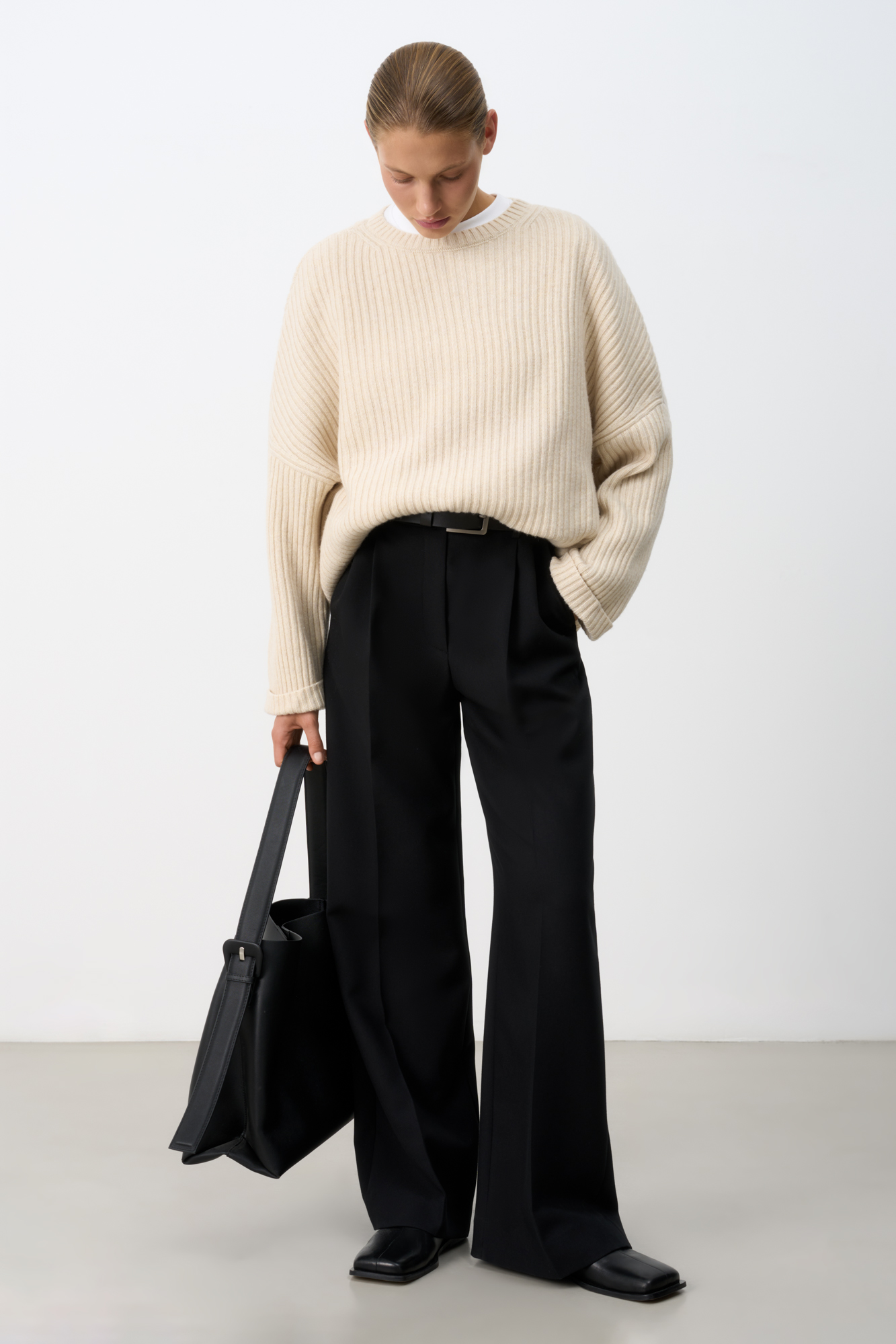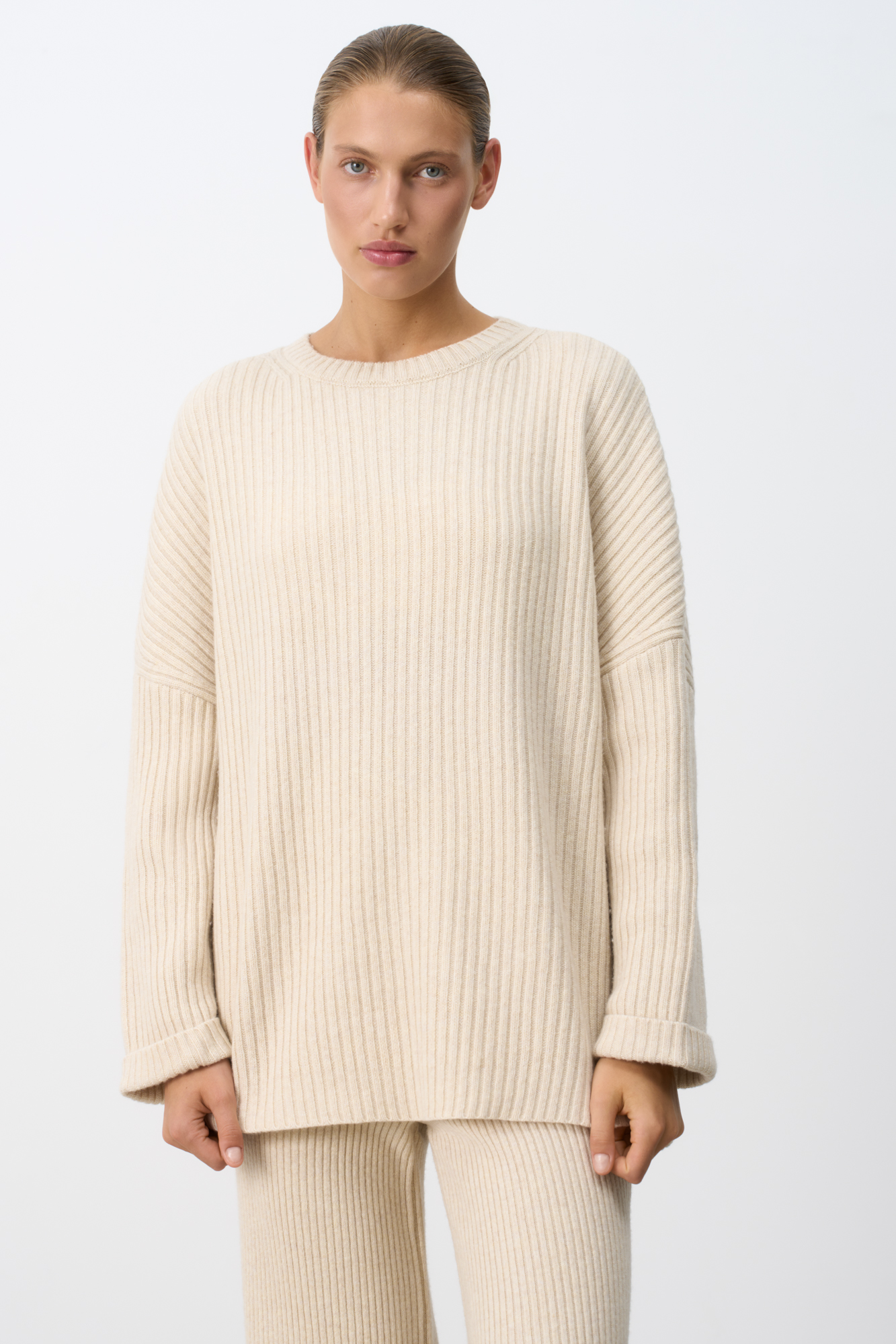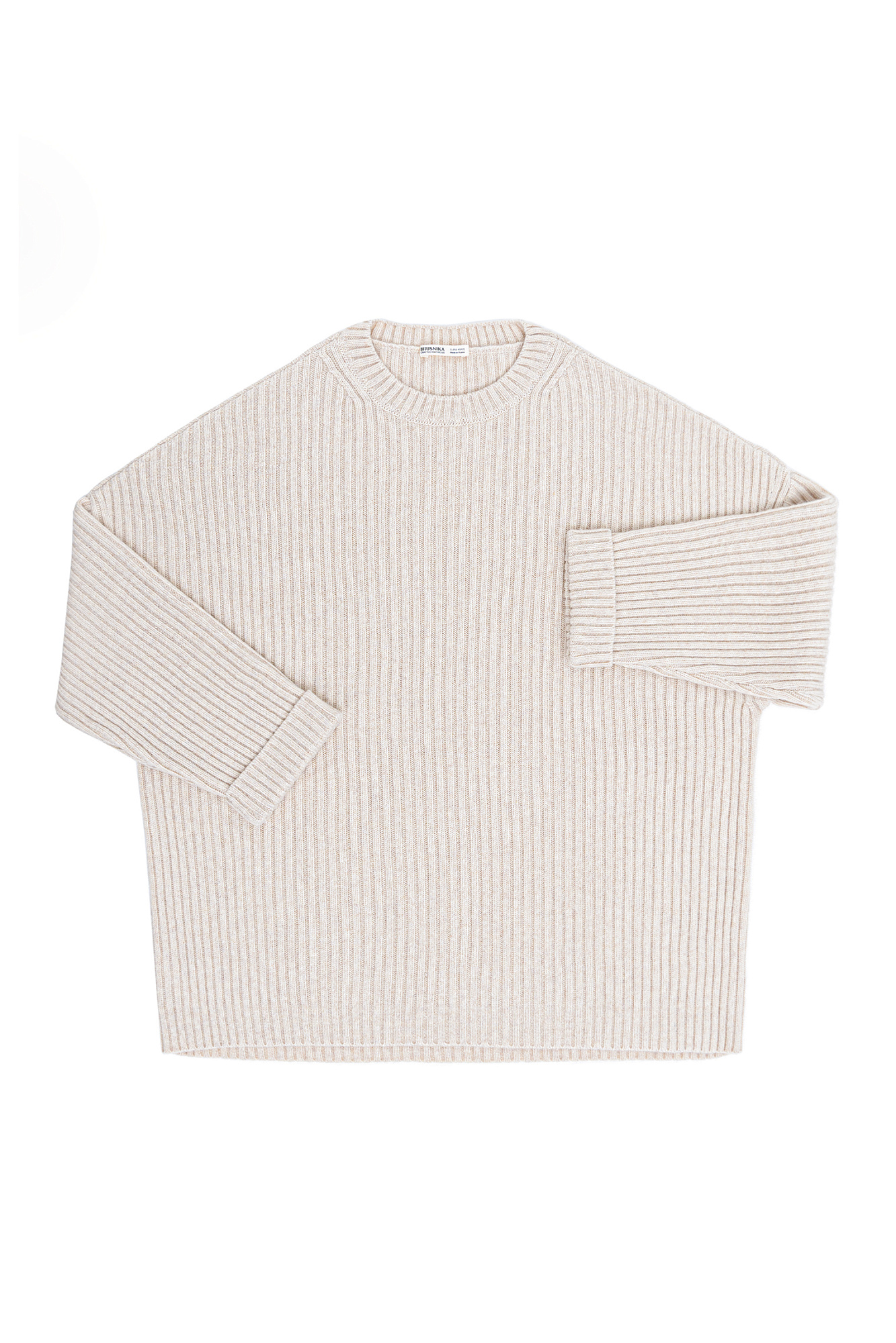 Трикотажный джемпер из шерсти с добавлением кашемира. Модель свободного силуэта со спущенной линией плеча, отворотами на манжетах и круглым вырезом горловины. Изделие выполнено в широкий рубчик.