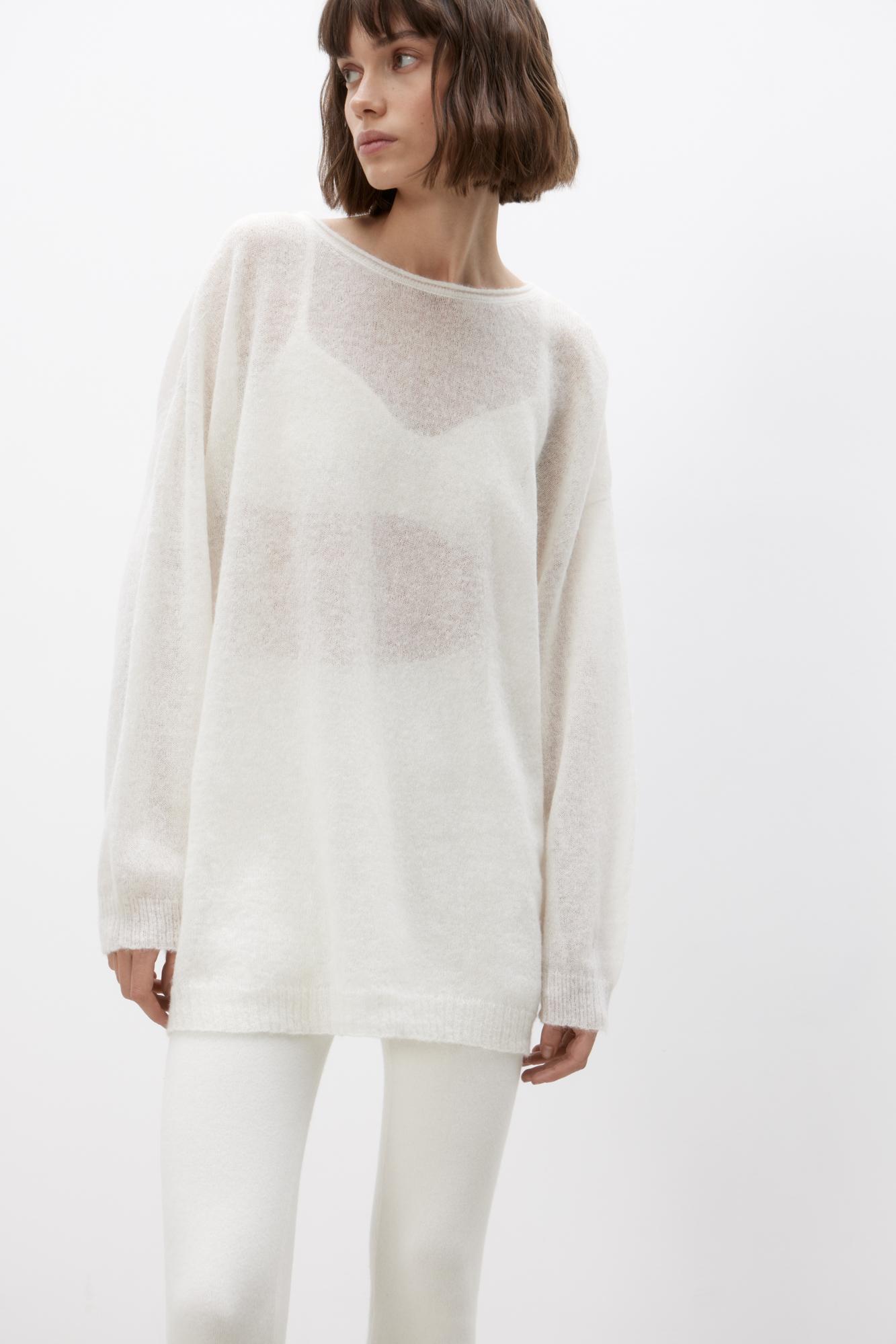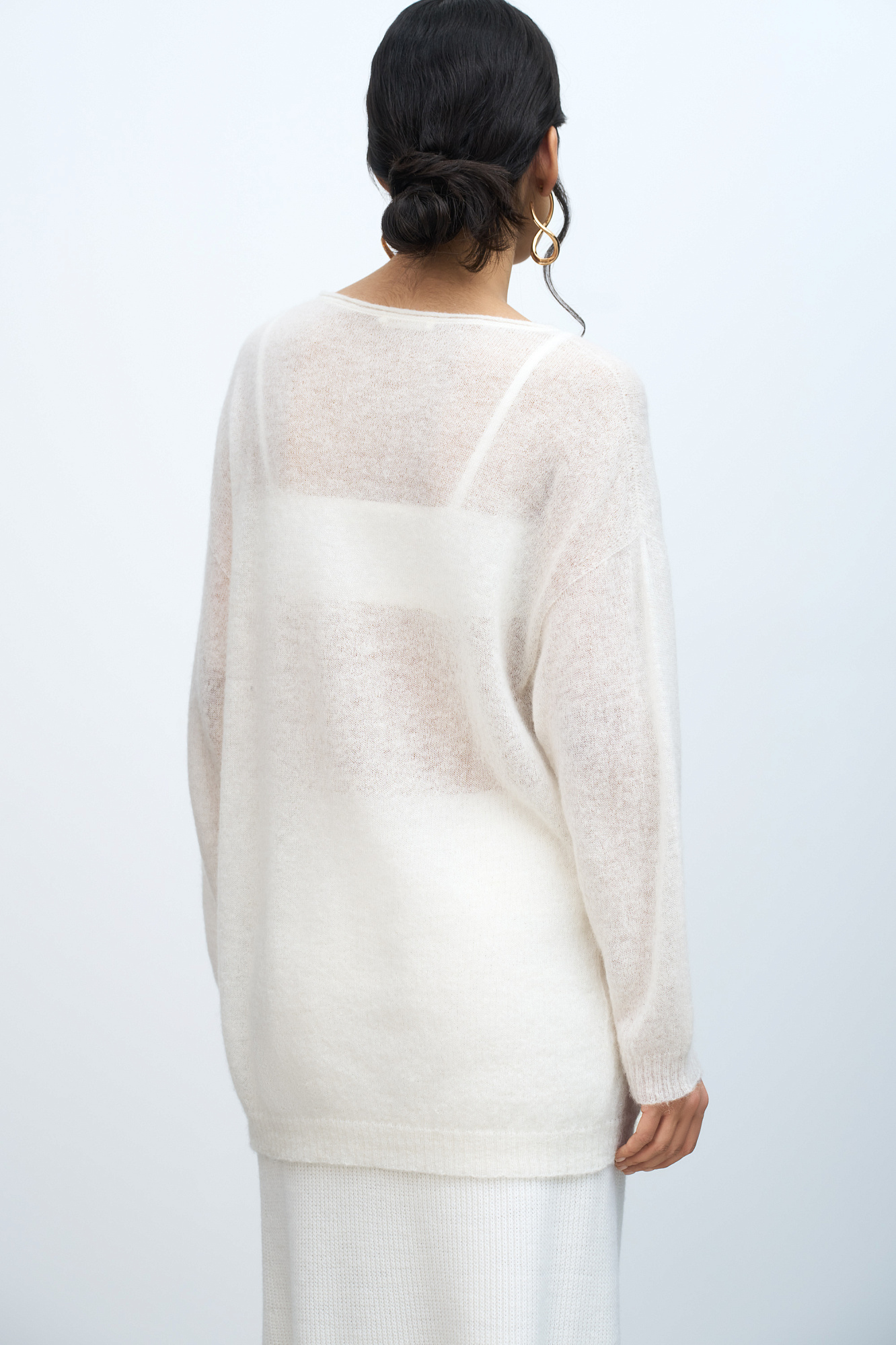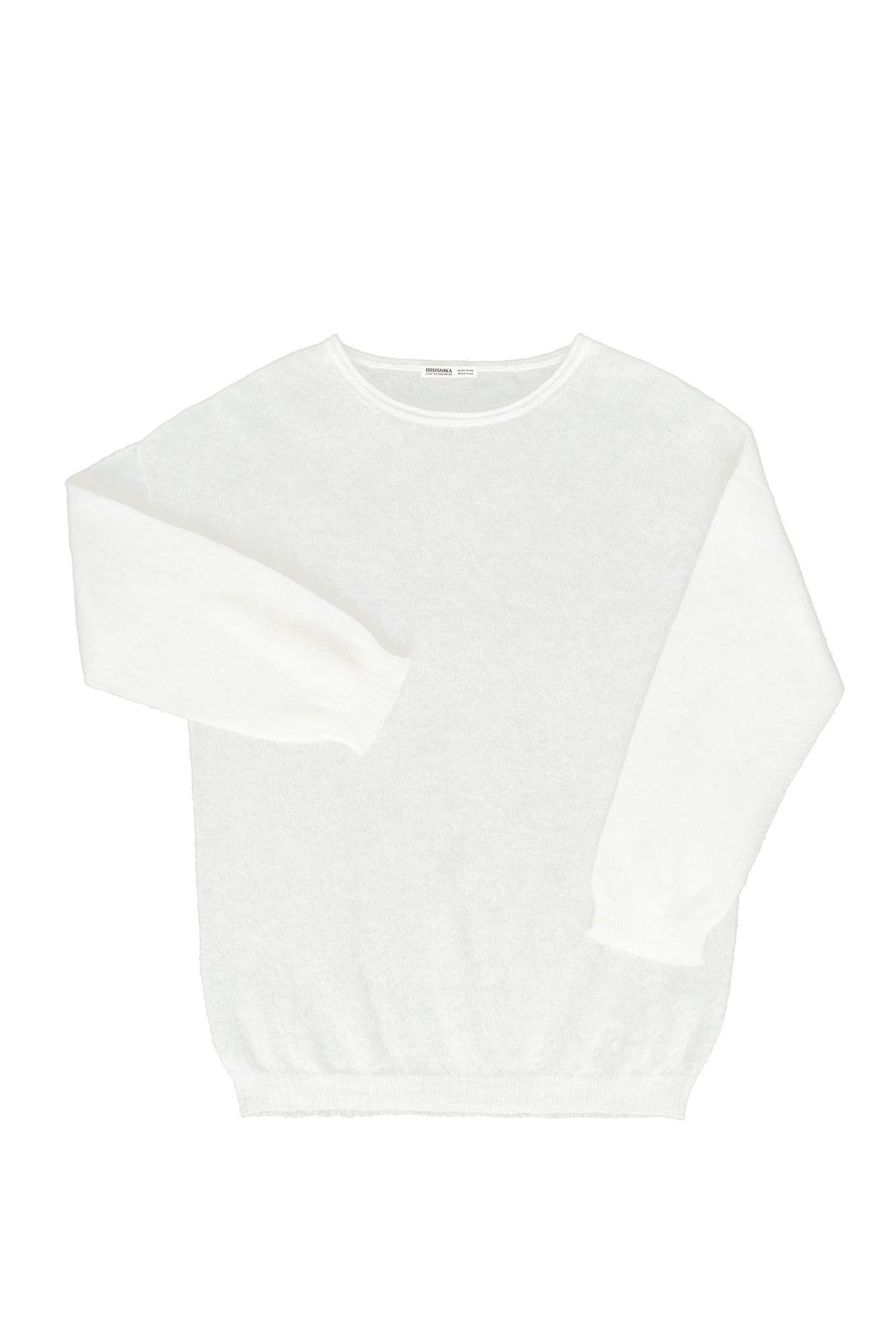 Длинный полупрозрачный трикотажный джемпер из мериносовой шерсти экстрафайн с добавлением шерсти альпака. Модель свободного силуэта, со спущенной линией плеч, длинными рукавами и неглубоким круглым вырезом горловины. Манжеты рукавов и низ изделия выполнены в рубчик.