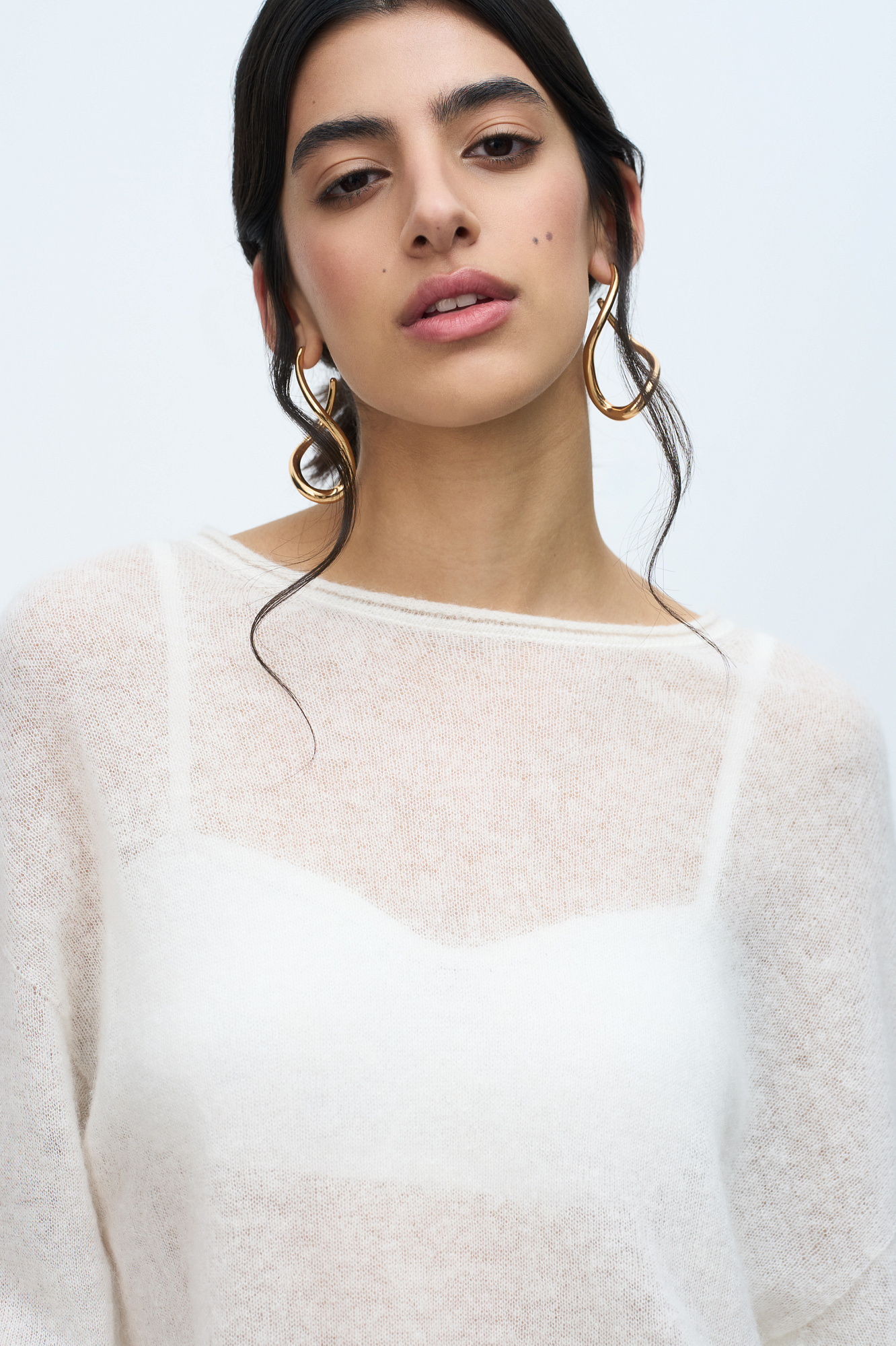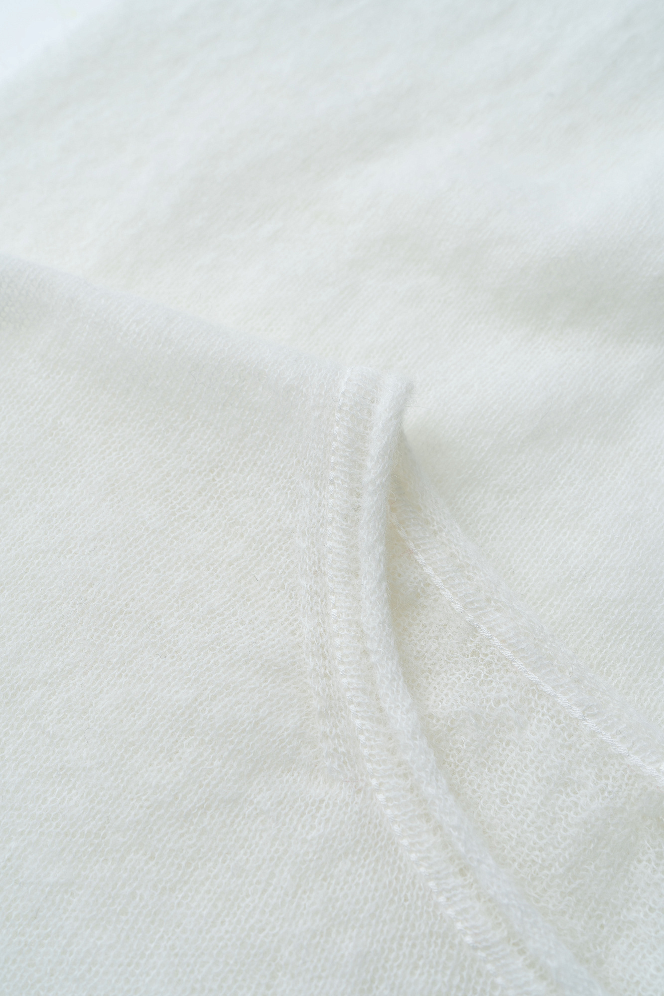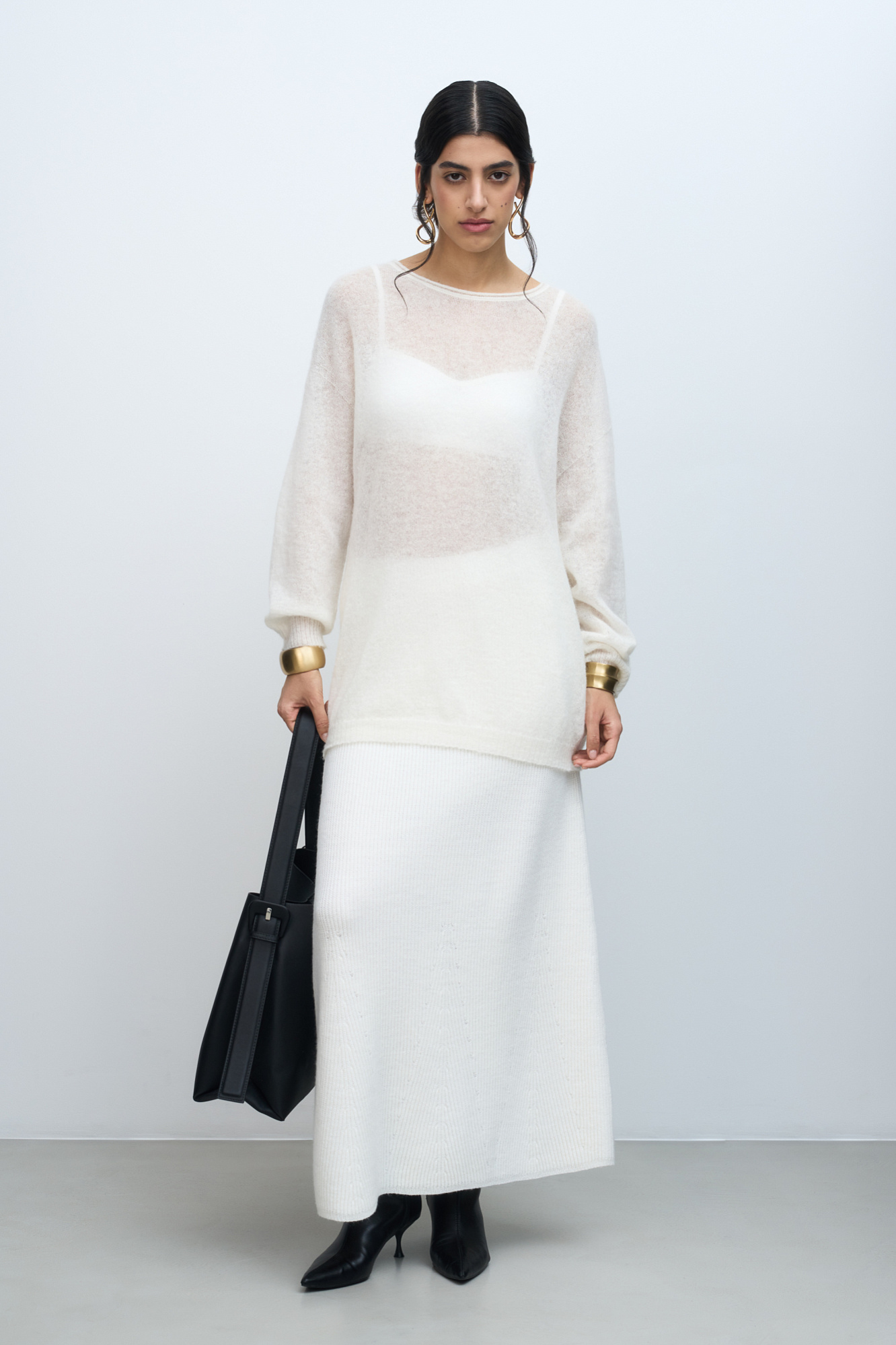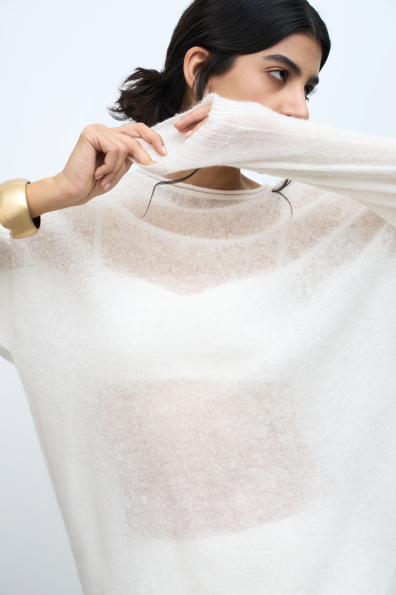 Длинный полупрозрачный трикотажный джемпер из мериносовой шерсти экстрафайн с добавлением шерсти альпака. Модель свободного силуэта, со спущенной линией плеч, длинными рукавами и неглубоким круглым вырезом горловины. Манжеты рукавов и низ изделия выполнены в рубчик.