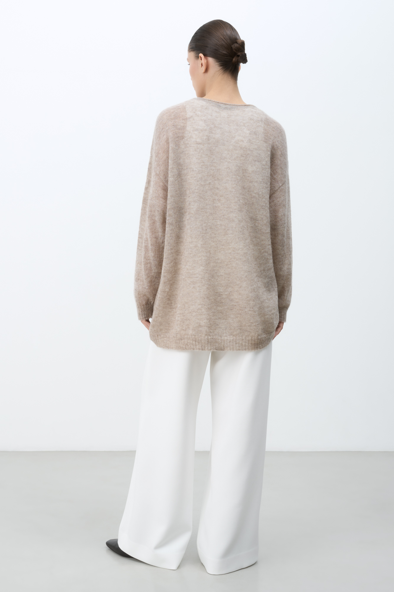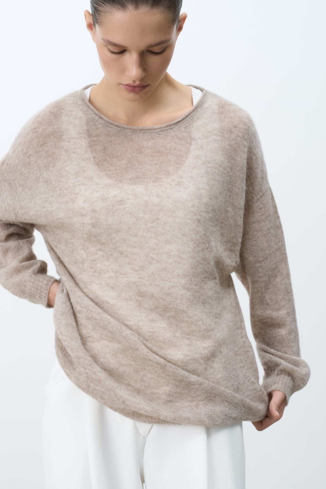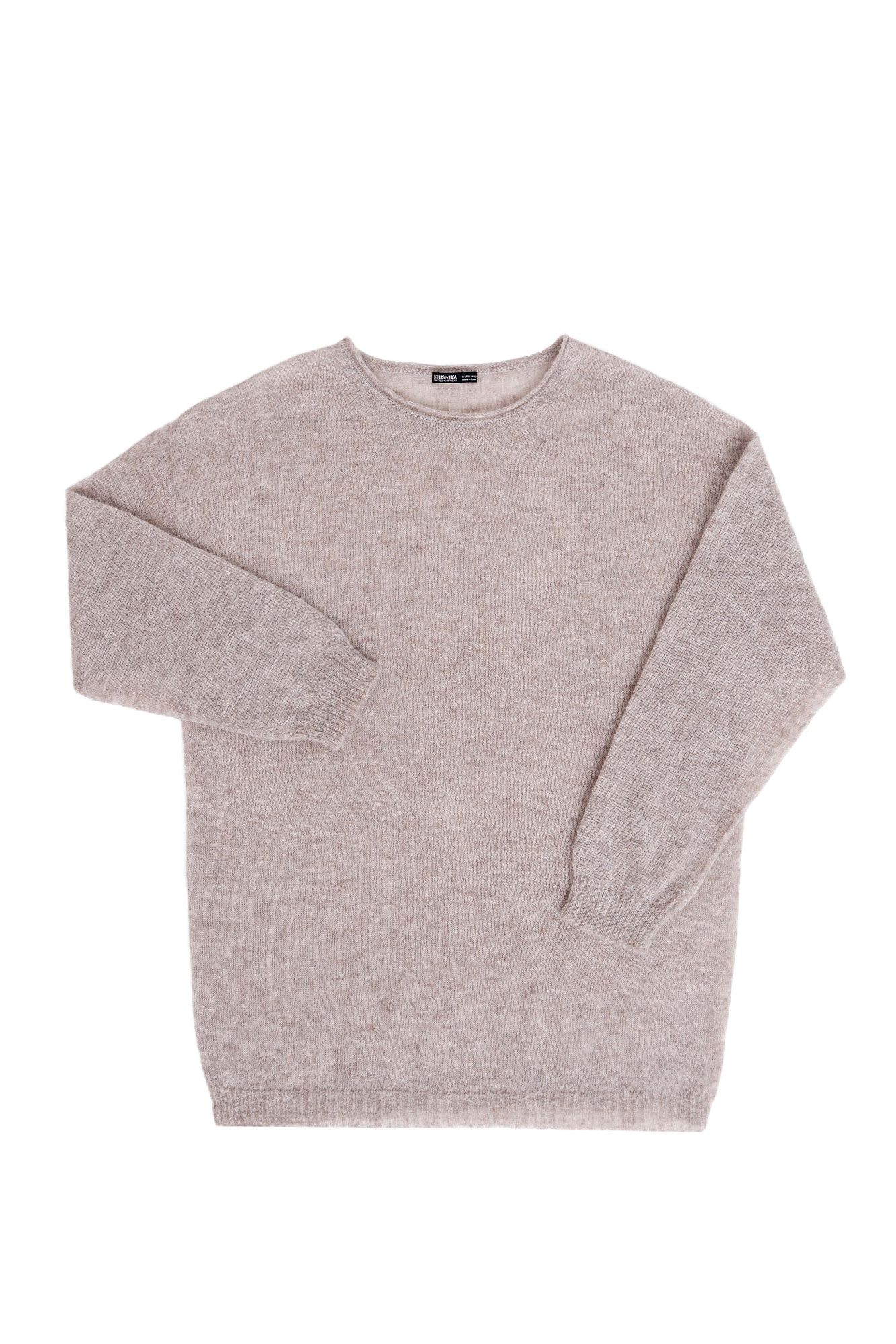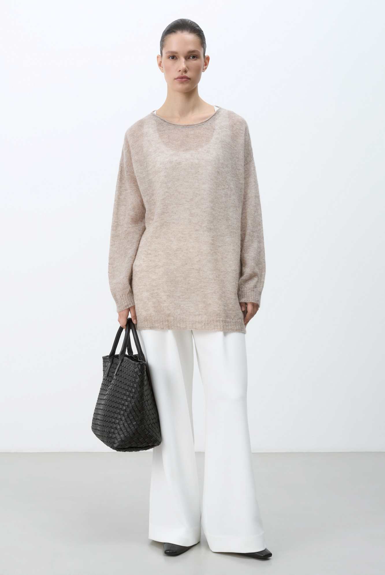 Длинный полупрозрачный трикотажный джемпер из мериносовой шерсти экстрафайн с добавлением шерсти альпака. Модель свободного силуэта, со спущенной линией плеч, длинными рукавами и неглубоким круглым вырезом горловины. Манжеты рукавов и низ изделия выполнены в рубчик.