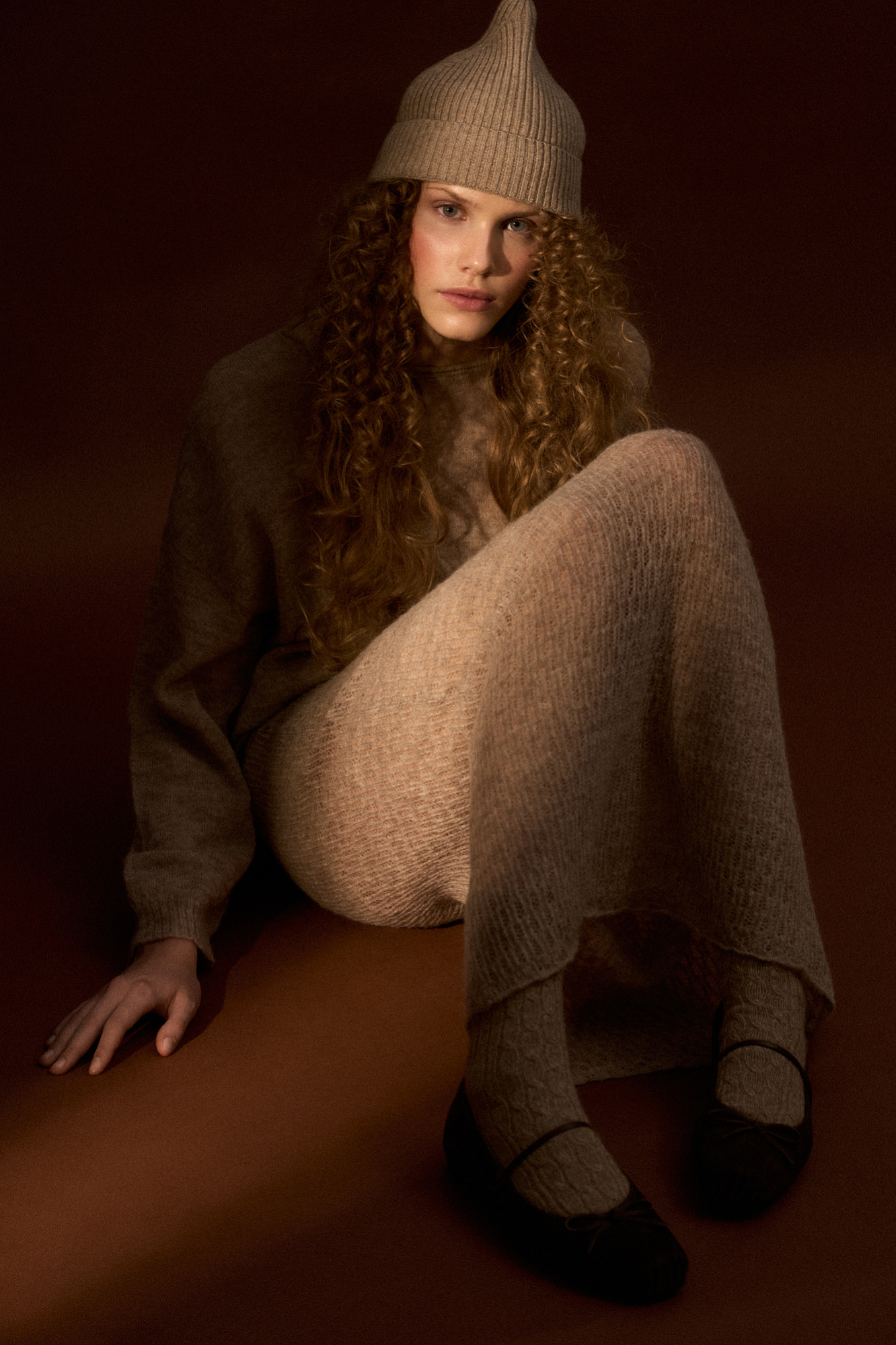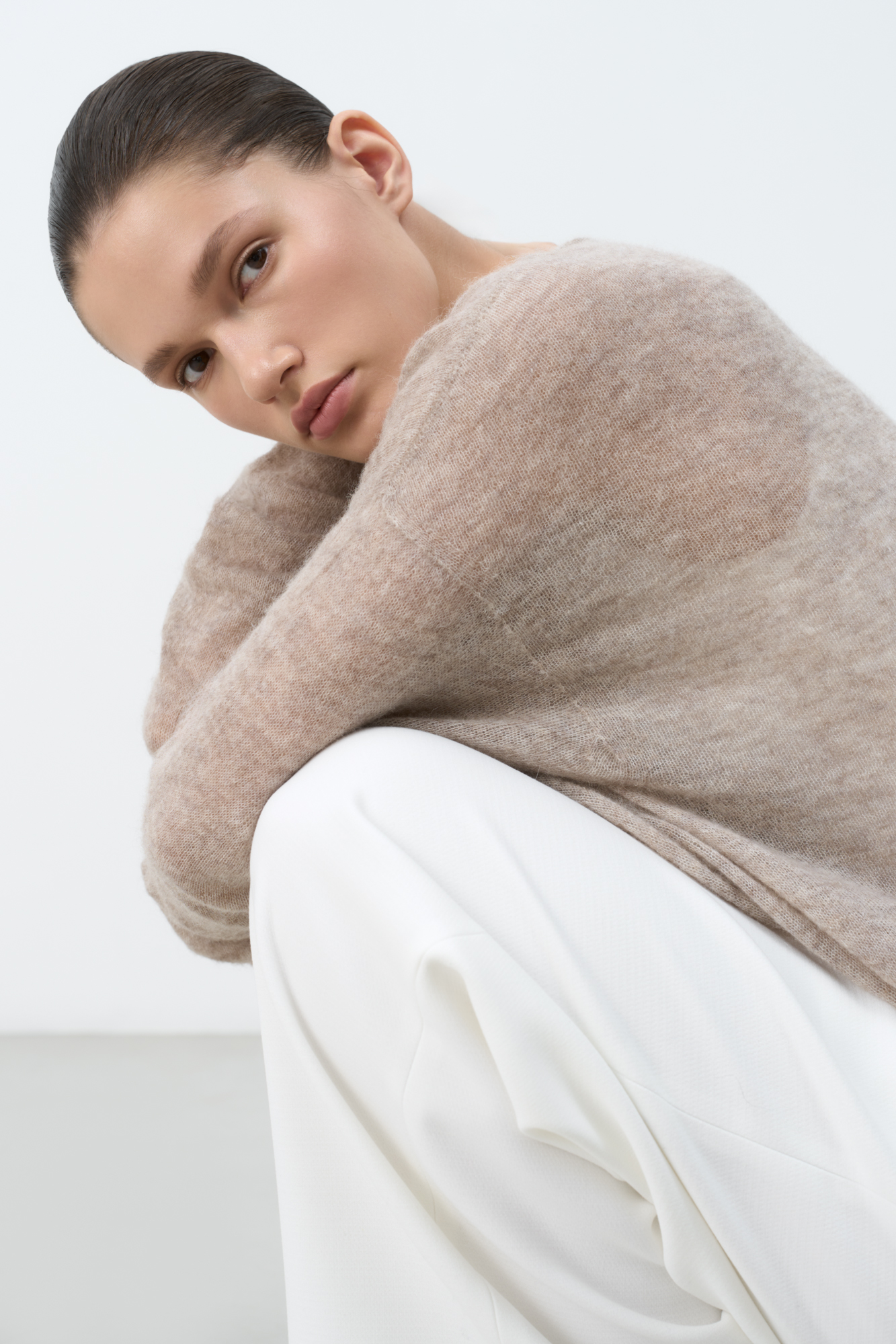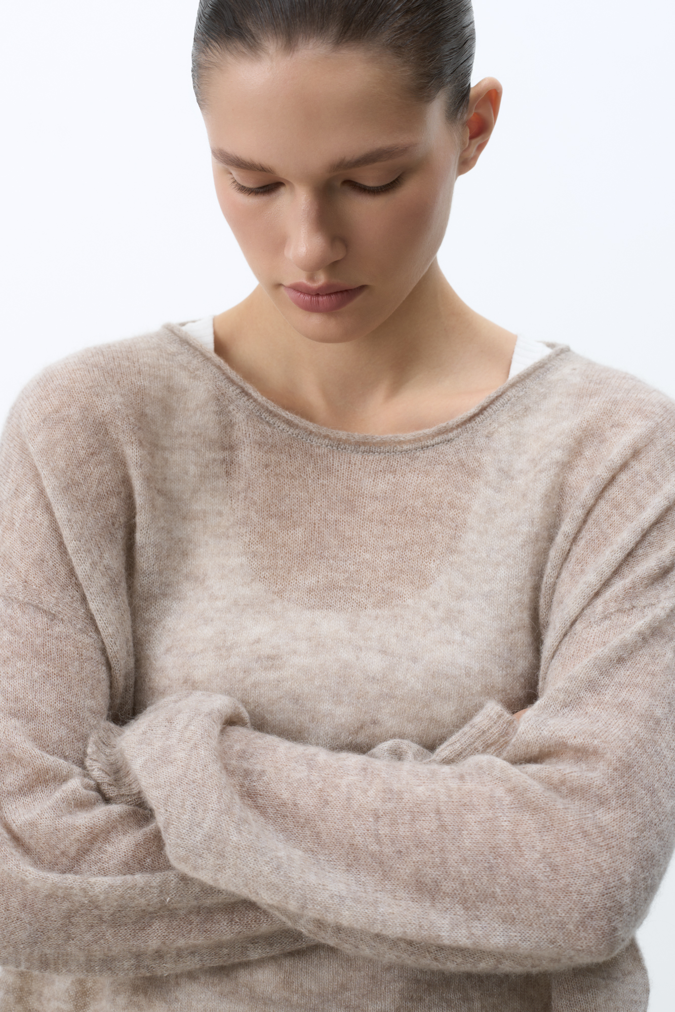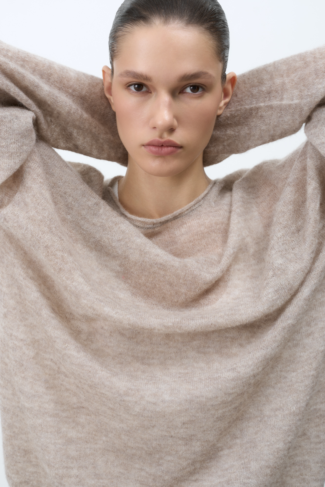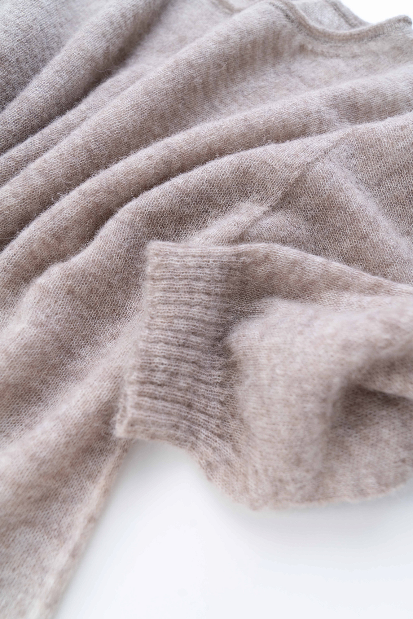 Длинный полупрозрачный трикотажный джемпер из мериносовой шерсти экстрафайн с добавлением шерсти альпака. Модель свободного силуэта, со спущенной линией плеч, длинными рукавами и неглубоким круглым вырезом горловины. Манжеты рукавов и низ изделия выполнены в рубчик.