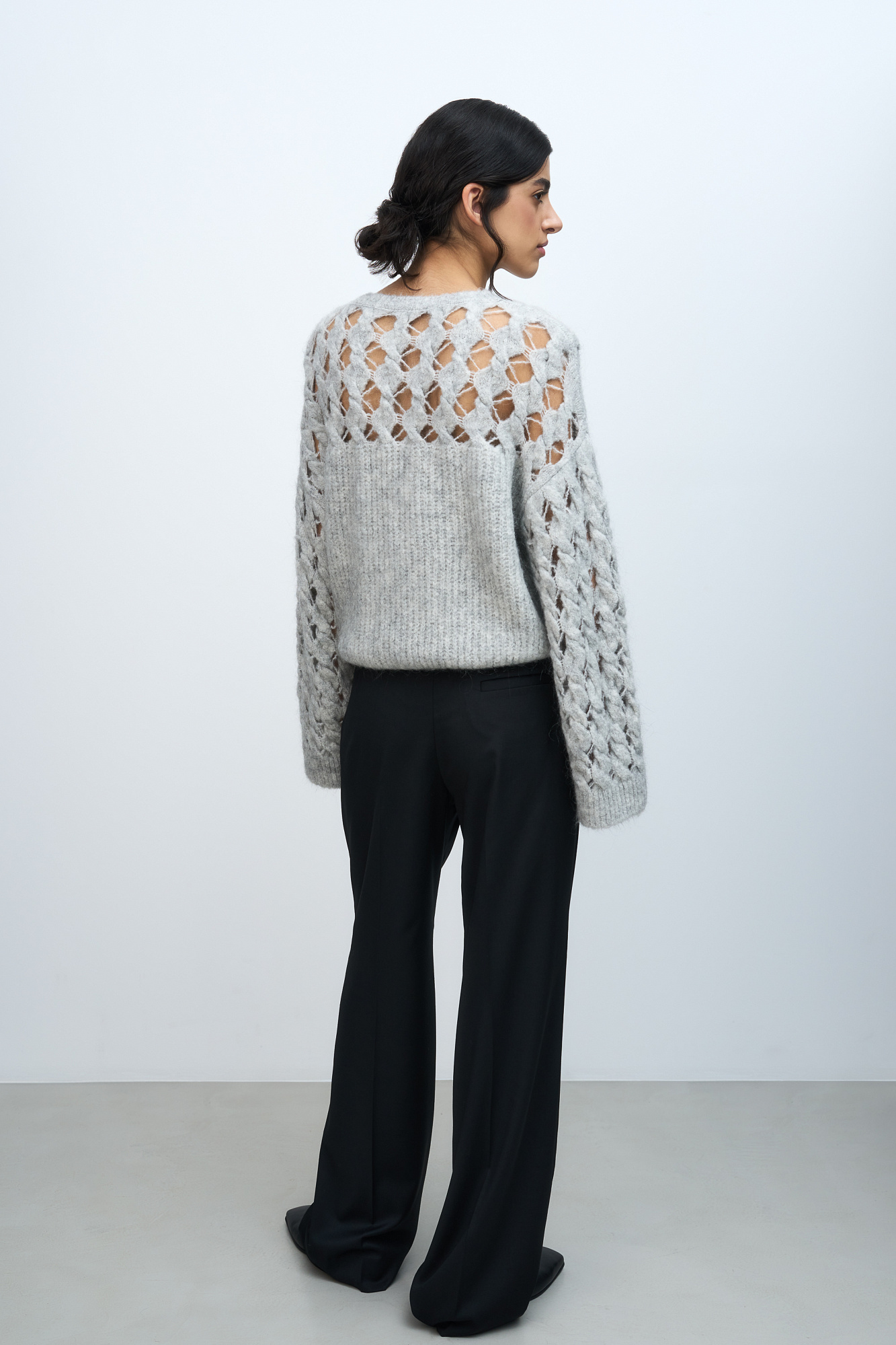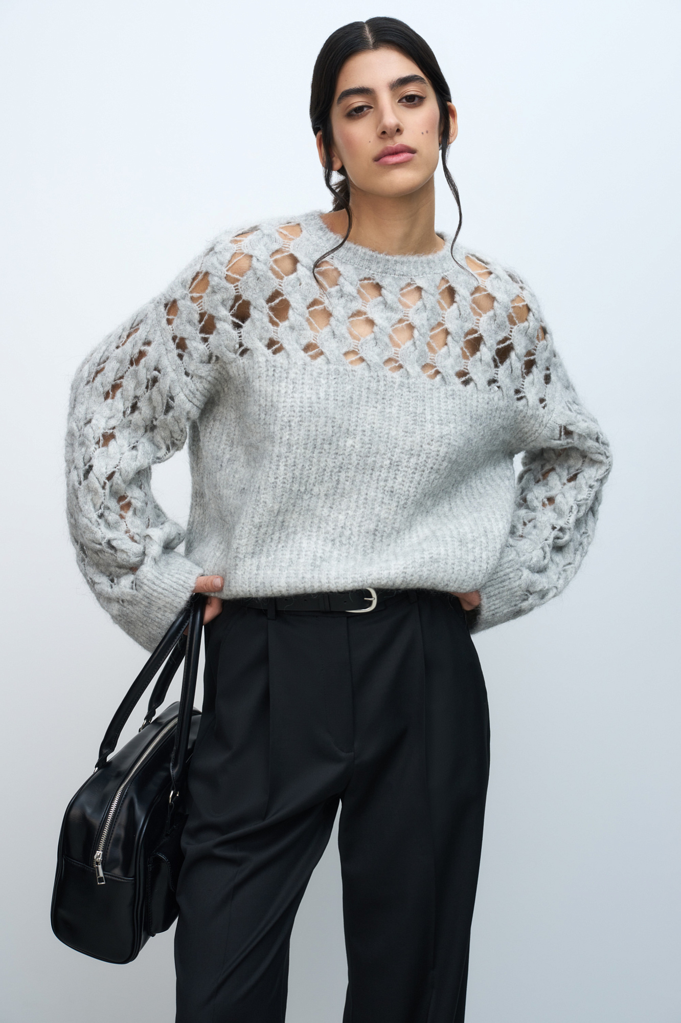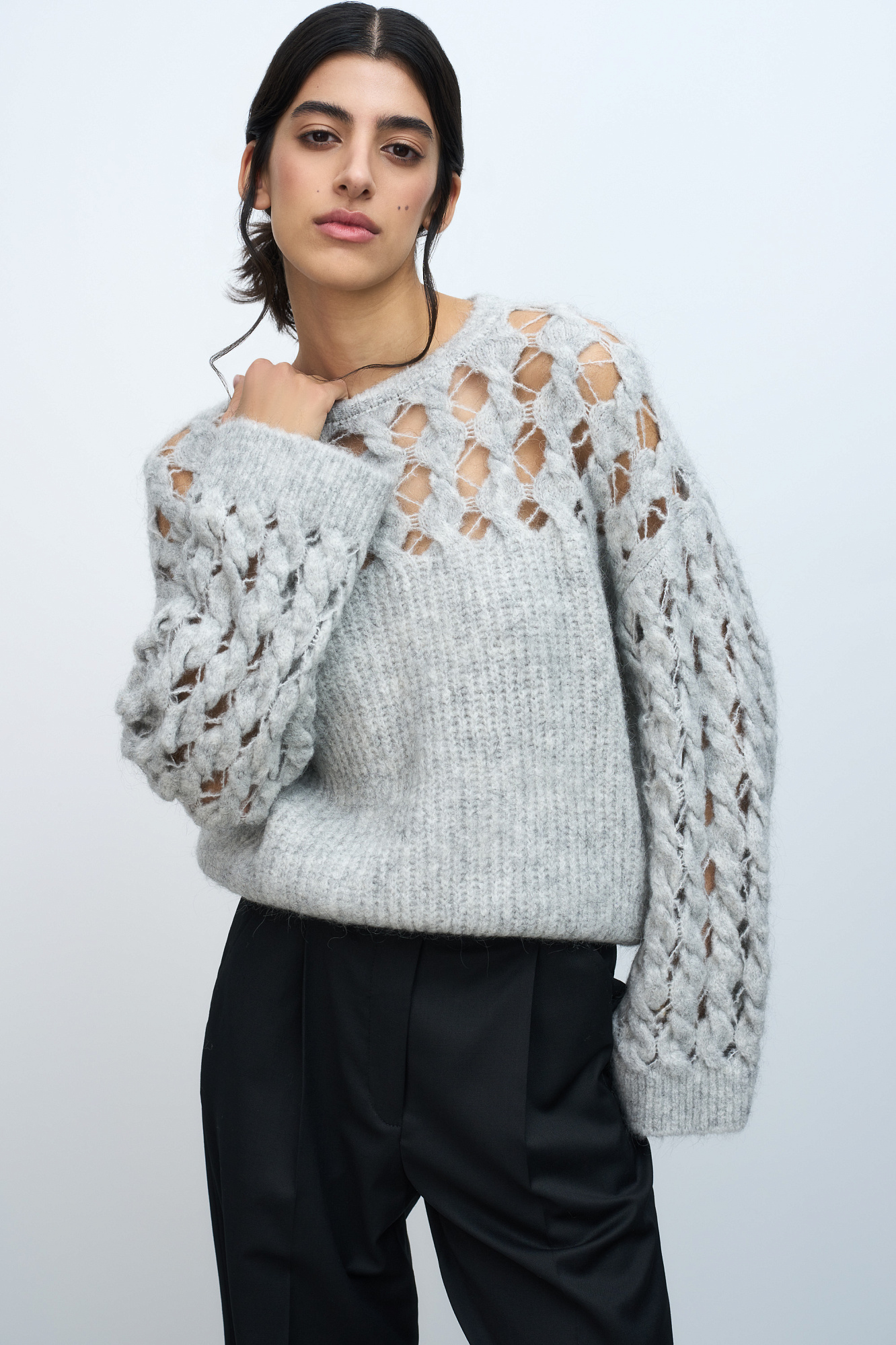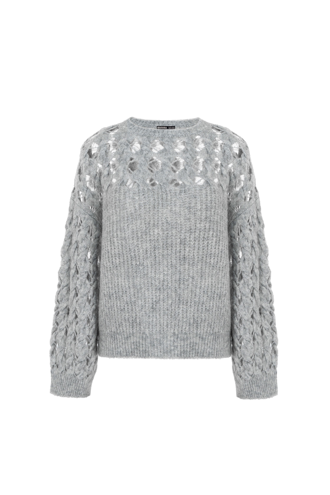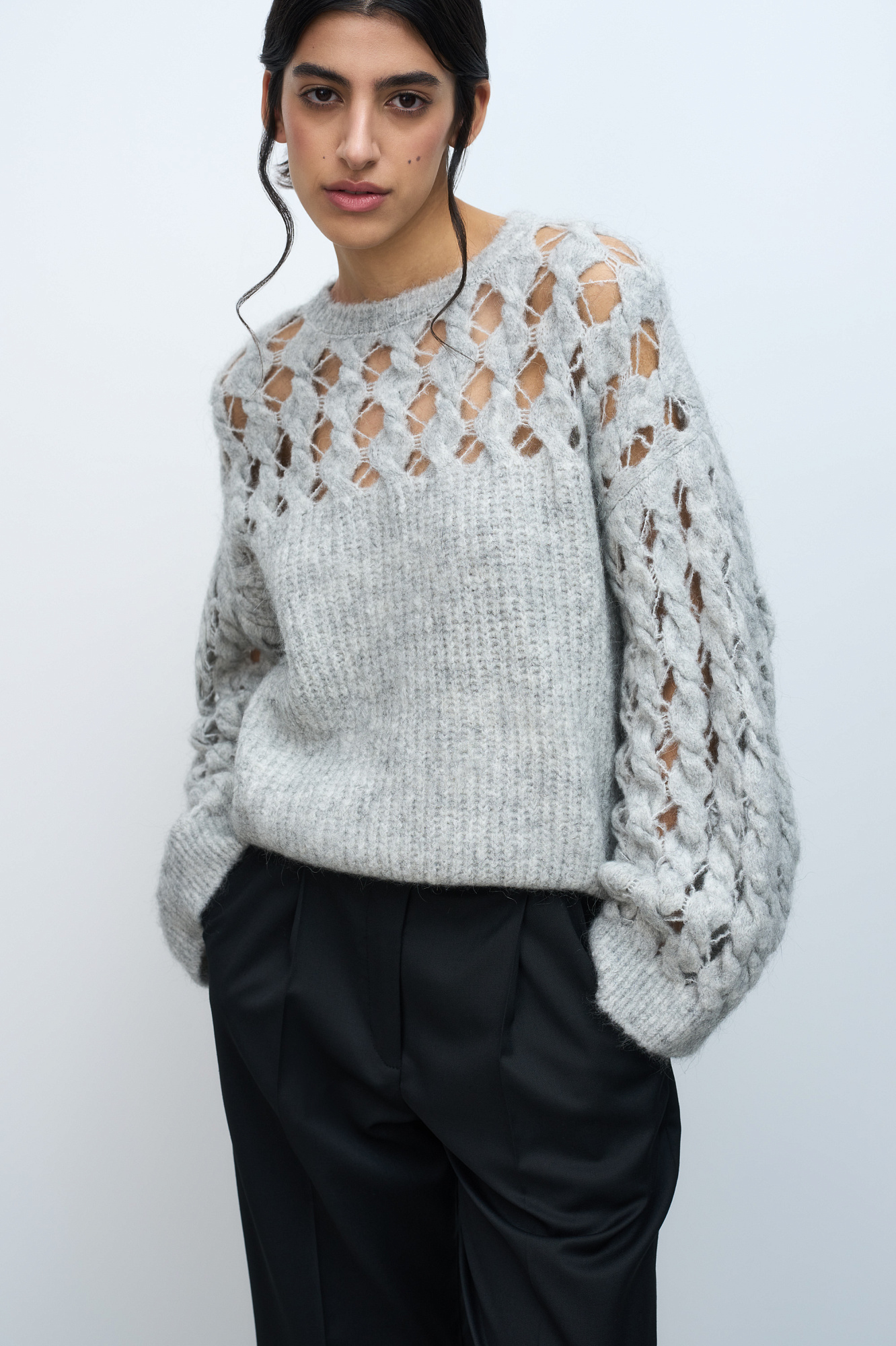 Трикотажный джемпер с фактурным переплетением, состоящим из ажурных кос с перекрутом. Круглый вырез, спущенная линия плеча и широкие рукава.
