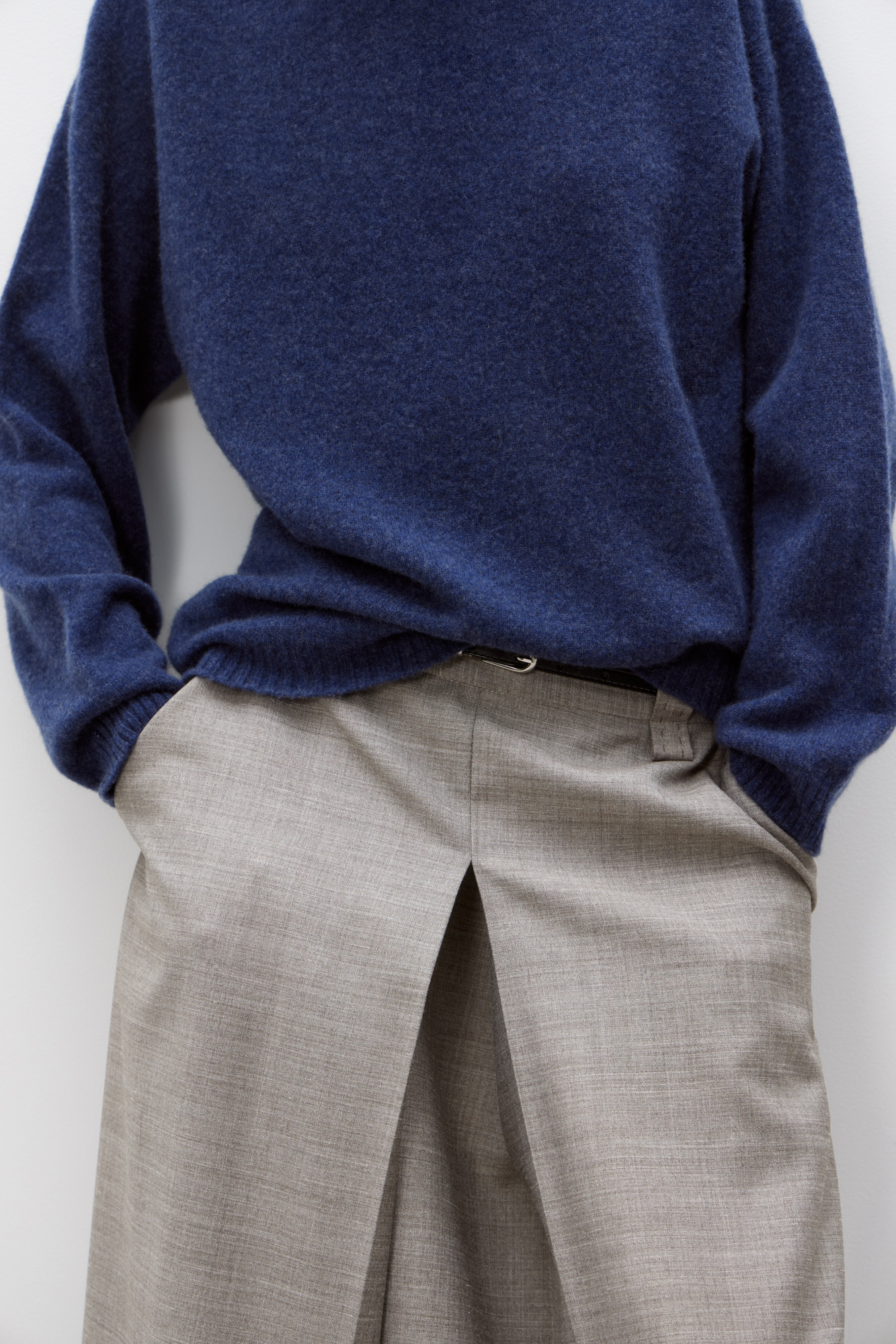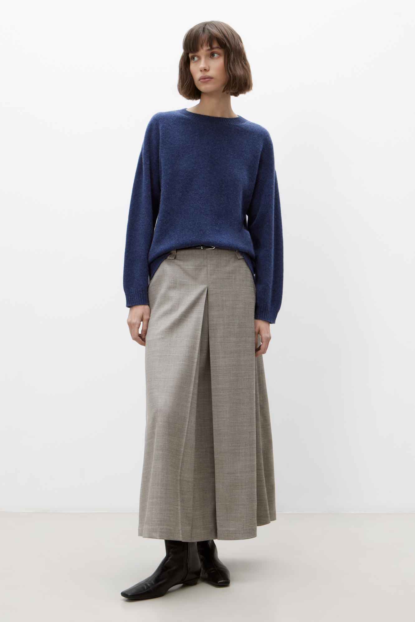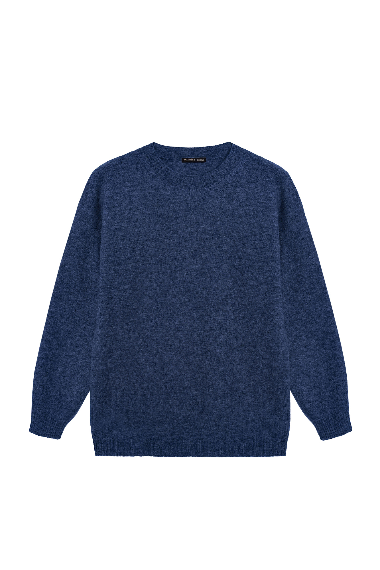 Трикотажный джемпер из 100% кашемира. Модель свободного силуэта со спущенной линией плеча и круглым вырезом горловины. Края изделия выполнены в рубчик.