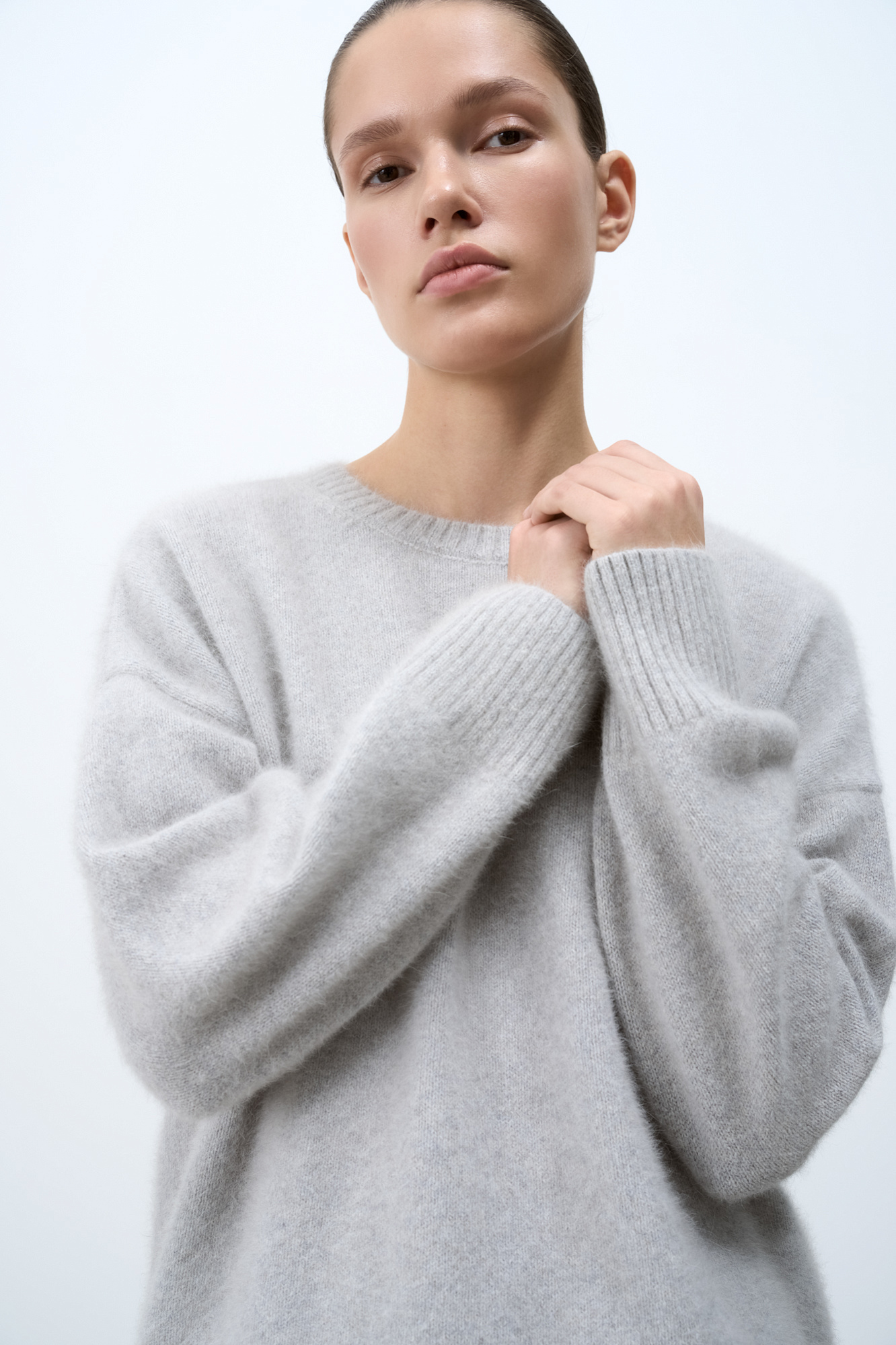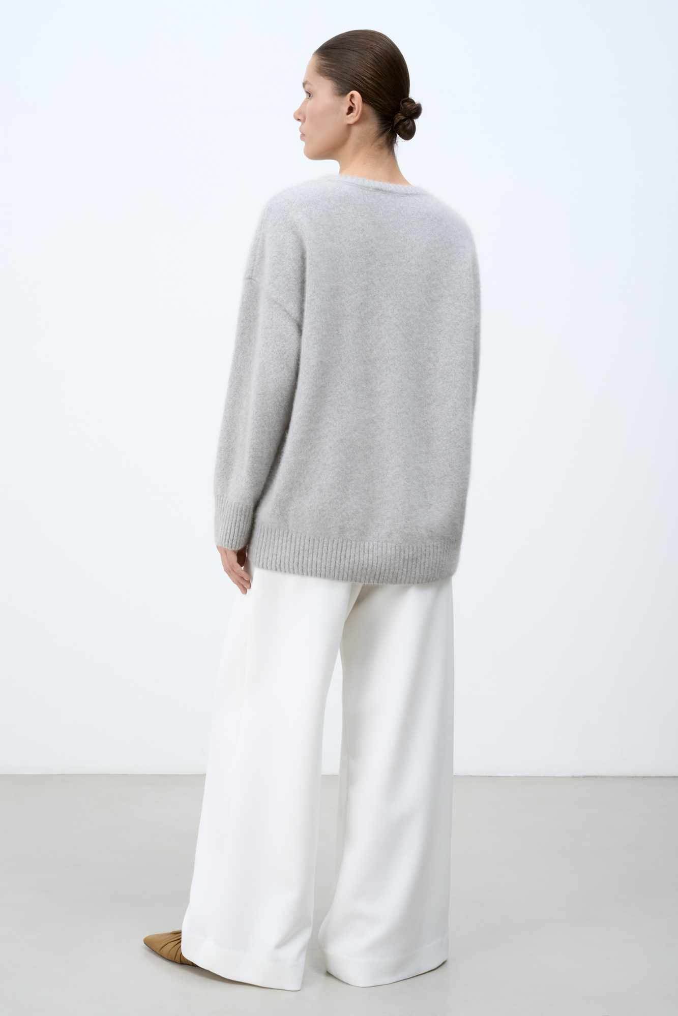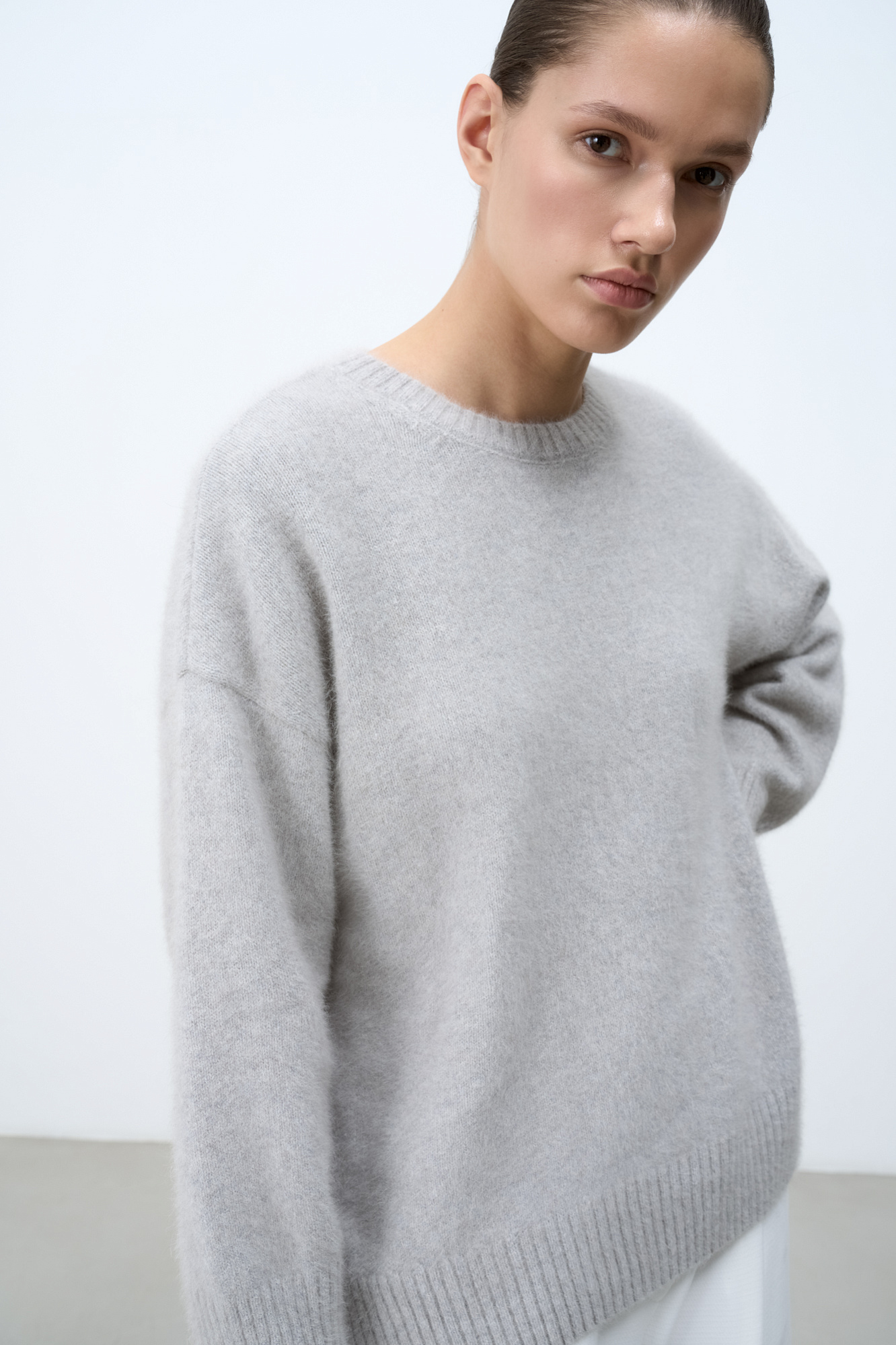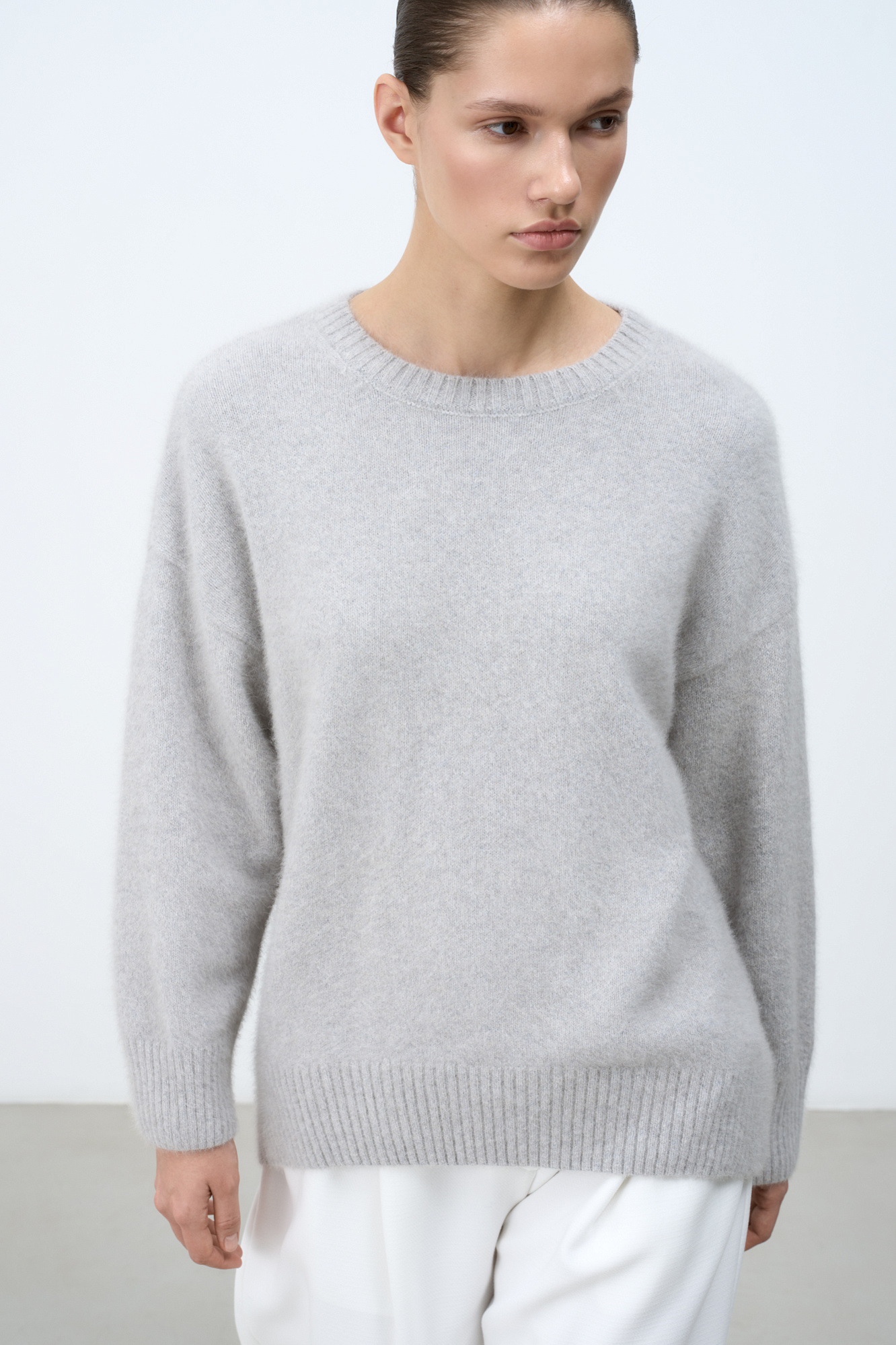 Трикотажный джемпер прямого силуэта. Содержание в пряже 70% натурального пуха лисы делает джемпер теплым и в тоже время очень легким. Модель со спущенным плечом, края изделия в рубчик.