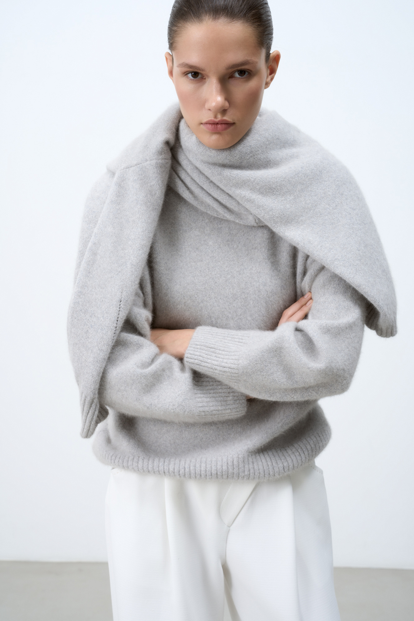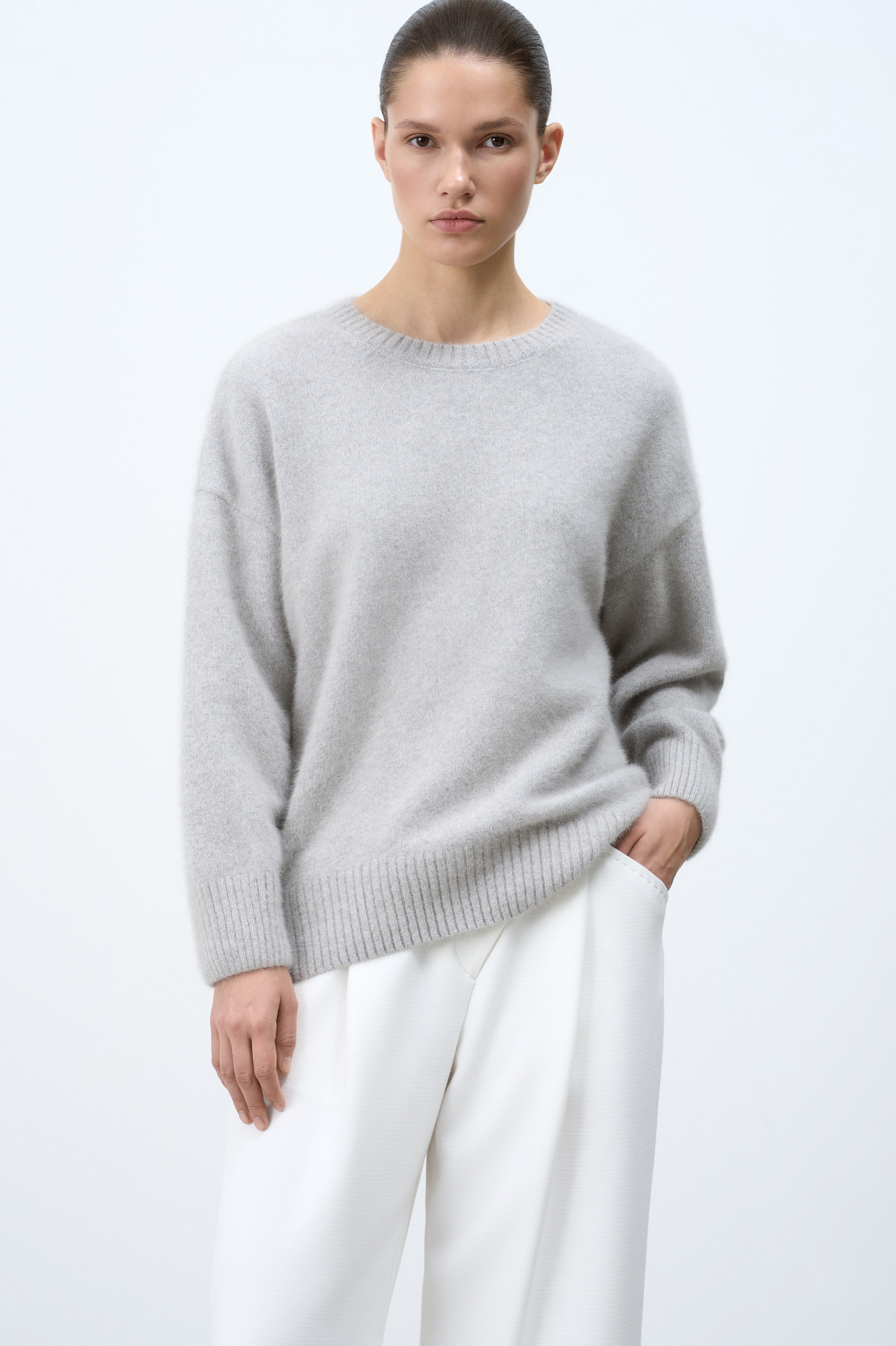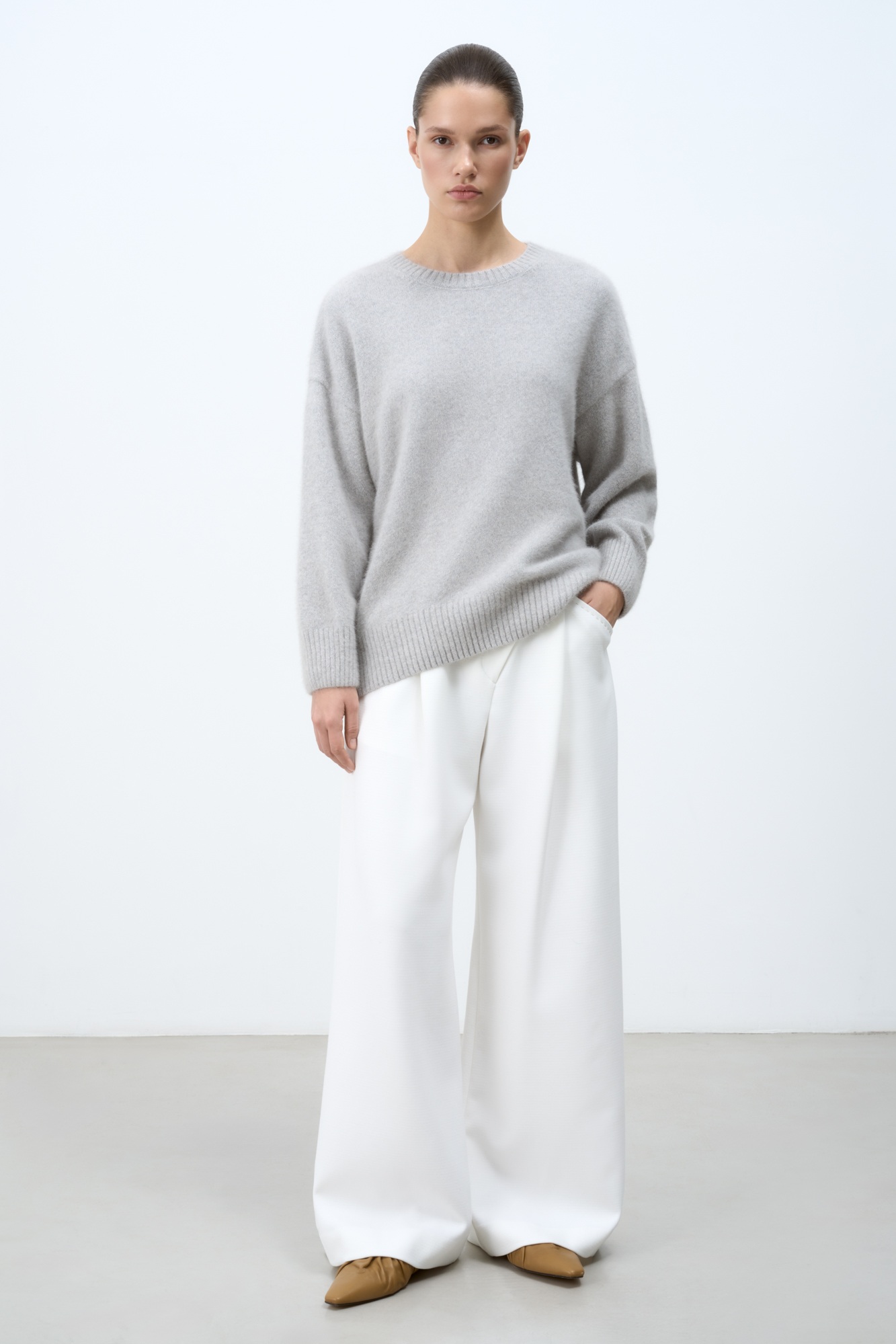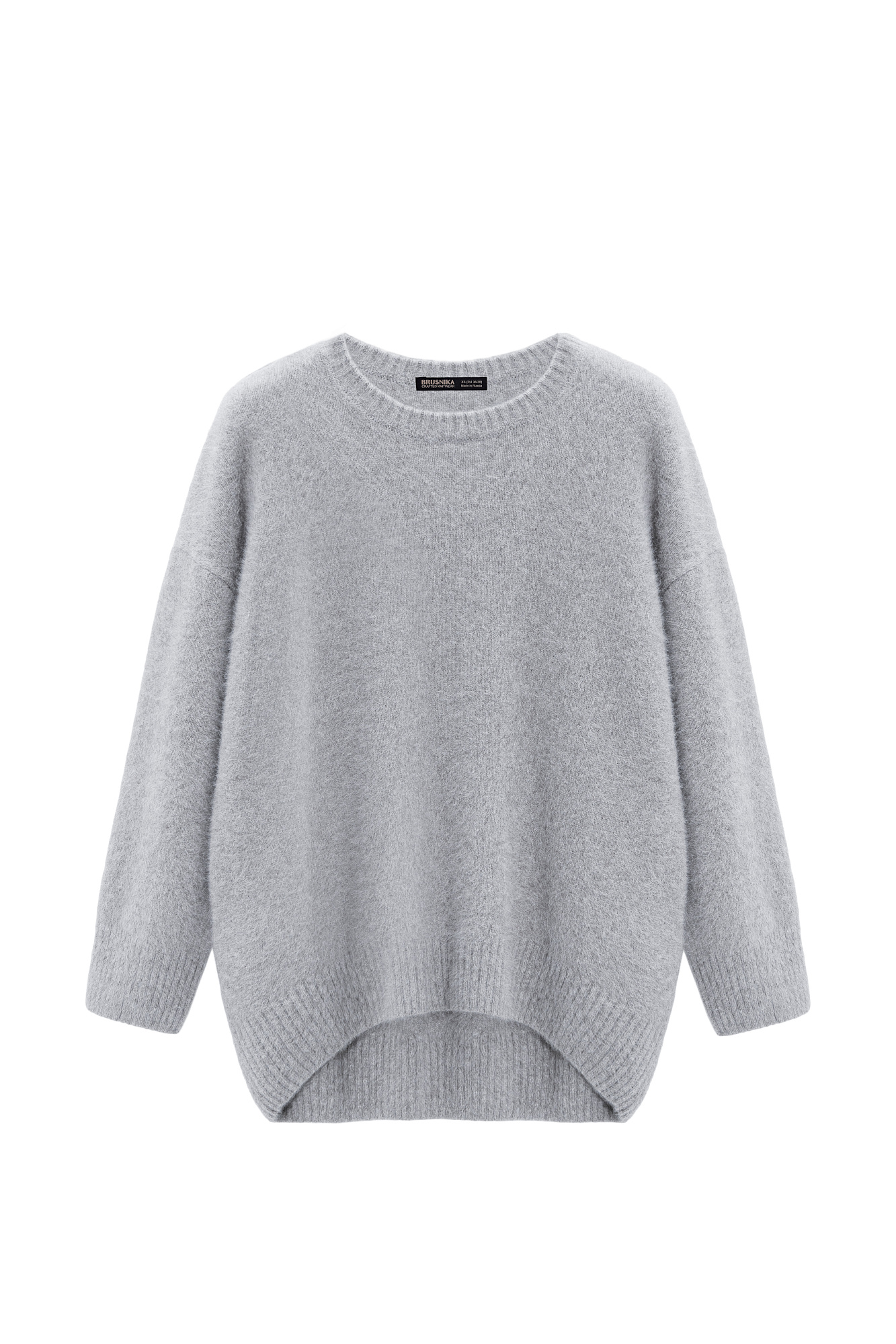 Трикотажный джемпер прямого силуэта. Содержание в пряже 70% натурального пуха лисы делает джемпер теплым и в тоже время очень легким. Модель со спущенным плечом, края изделия в рубчик.