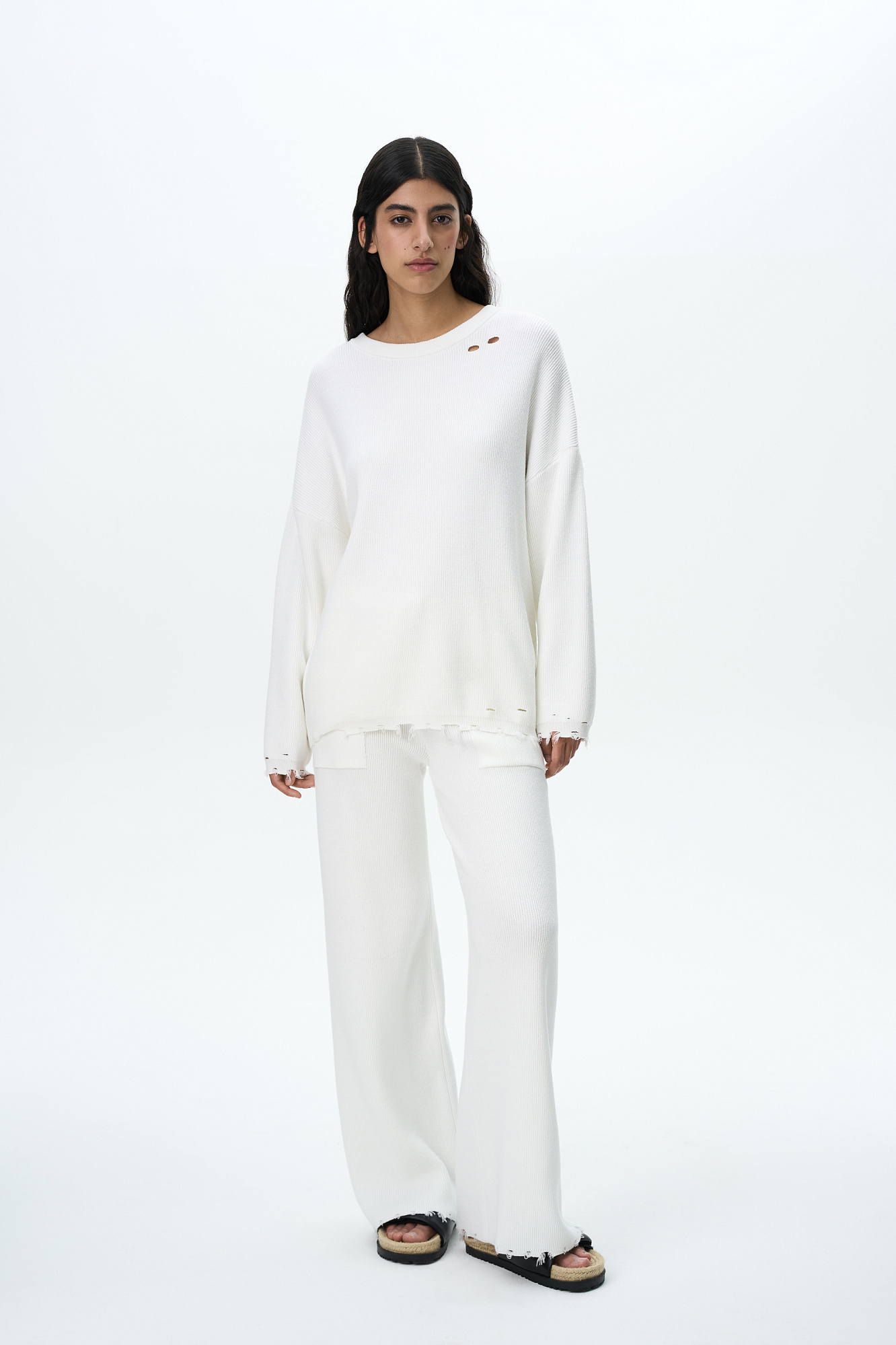 Трикотажный джемпер из хлопка с добавлением вискоза. Модель свободного силуэта со спущенной линией плеча и круглым вырезом горловины. Изделие декорировано имитацией драни и необработанным краем.