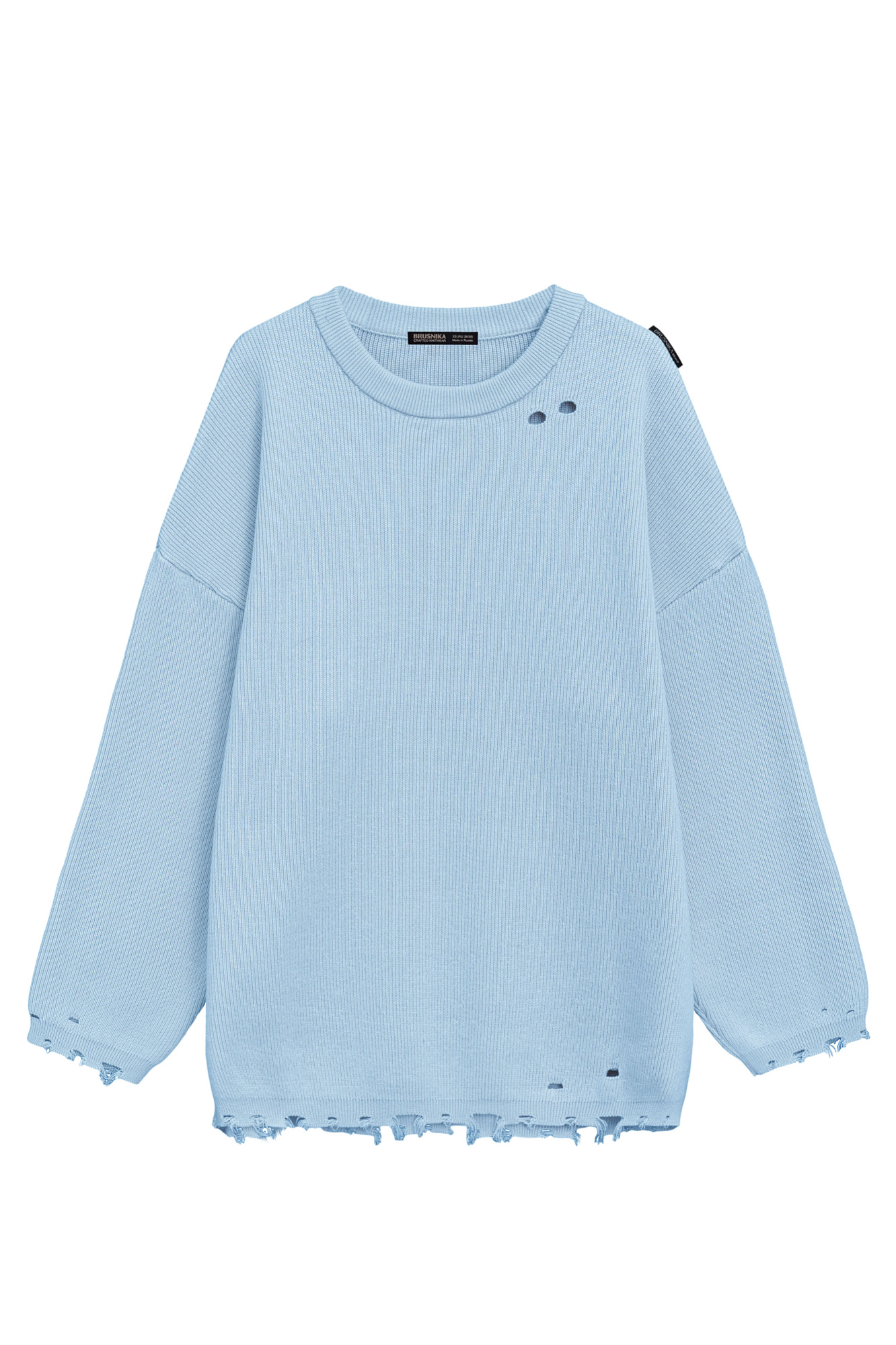Трикотажный джемпер из хлопка с добавлением вискоза. Модель свободного силуэта со спущенной линией плеча и круглым вырезом горловины. Изделие декорировано имитацией драни и необработанным краем.
