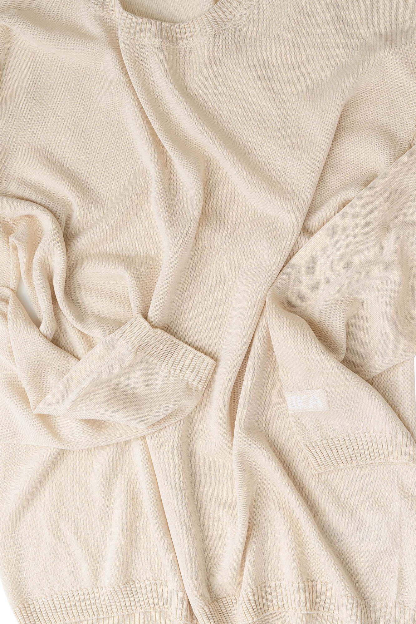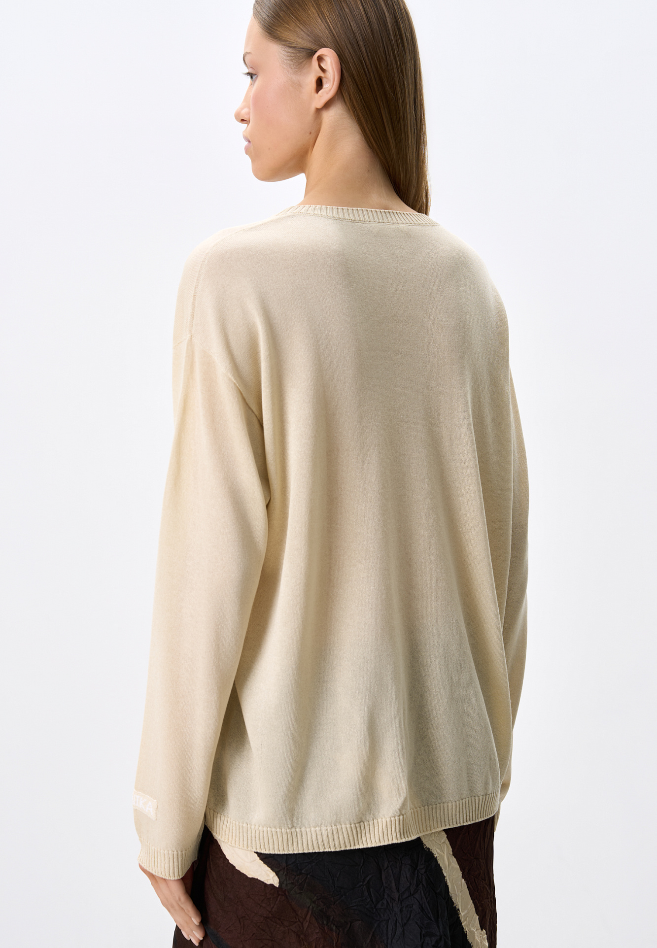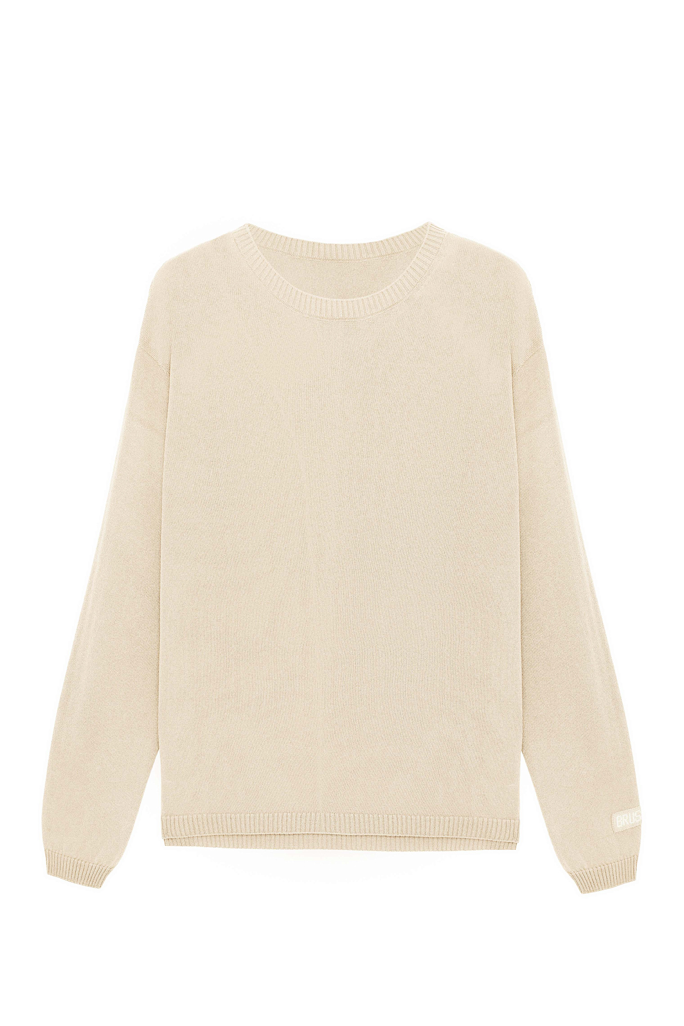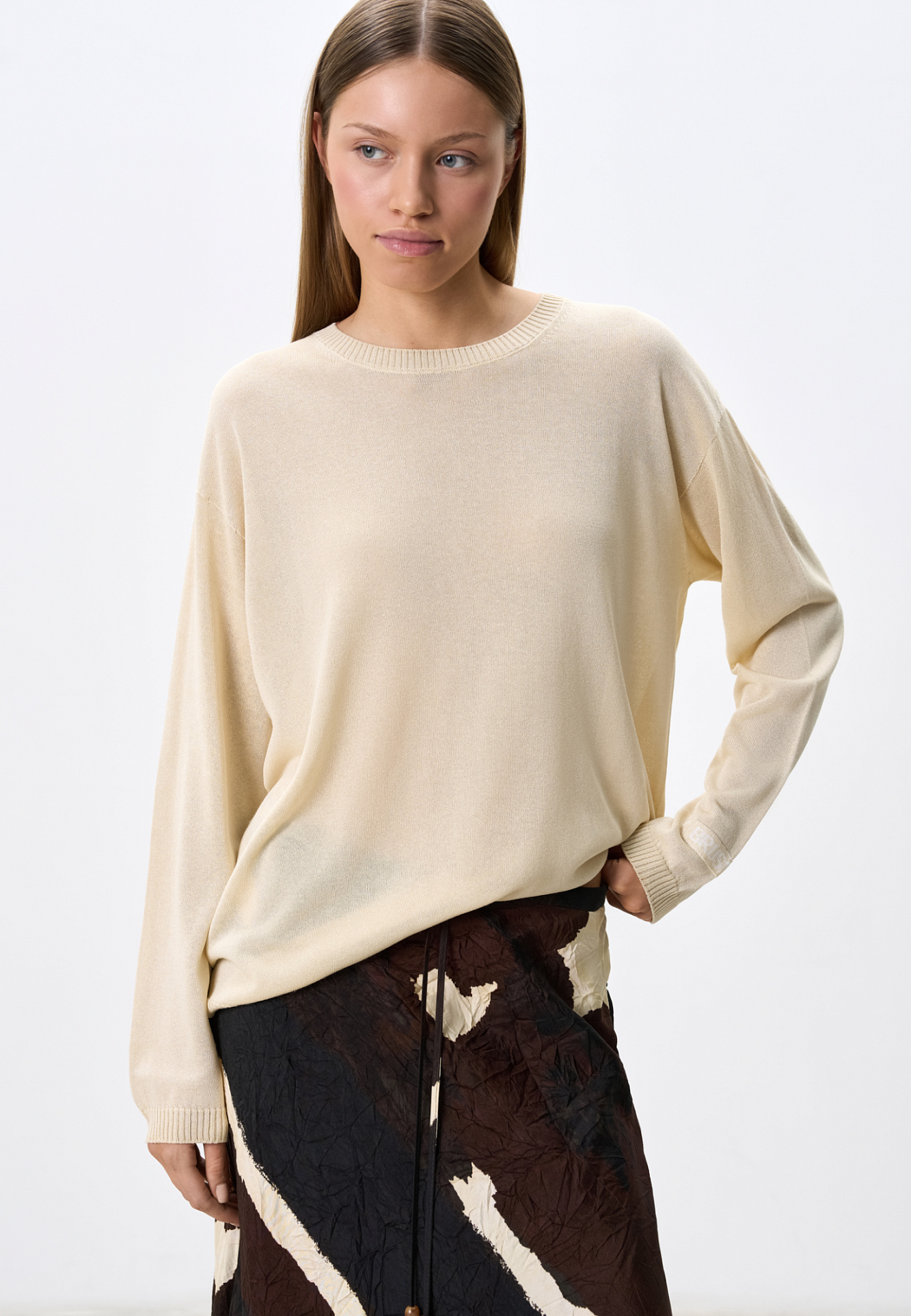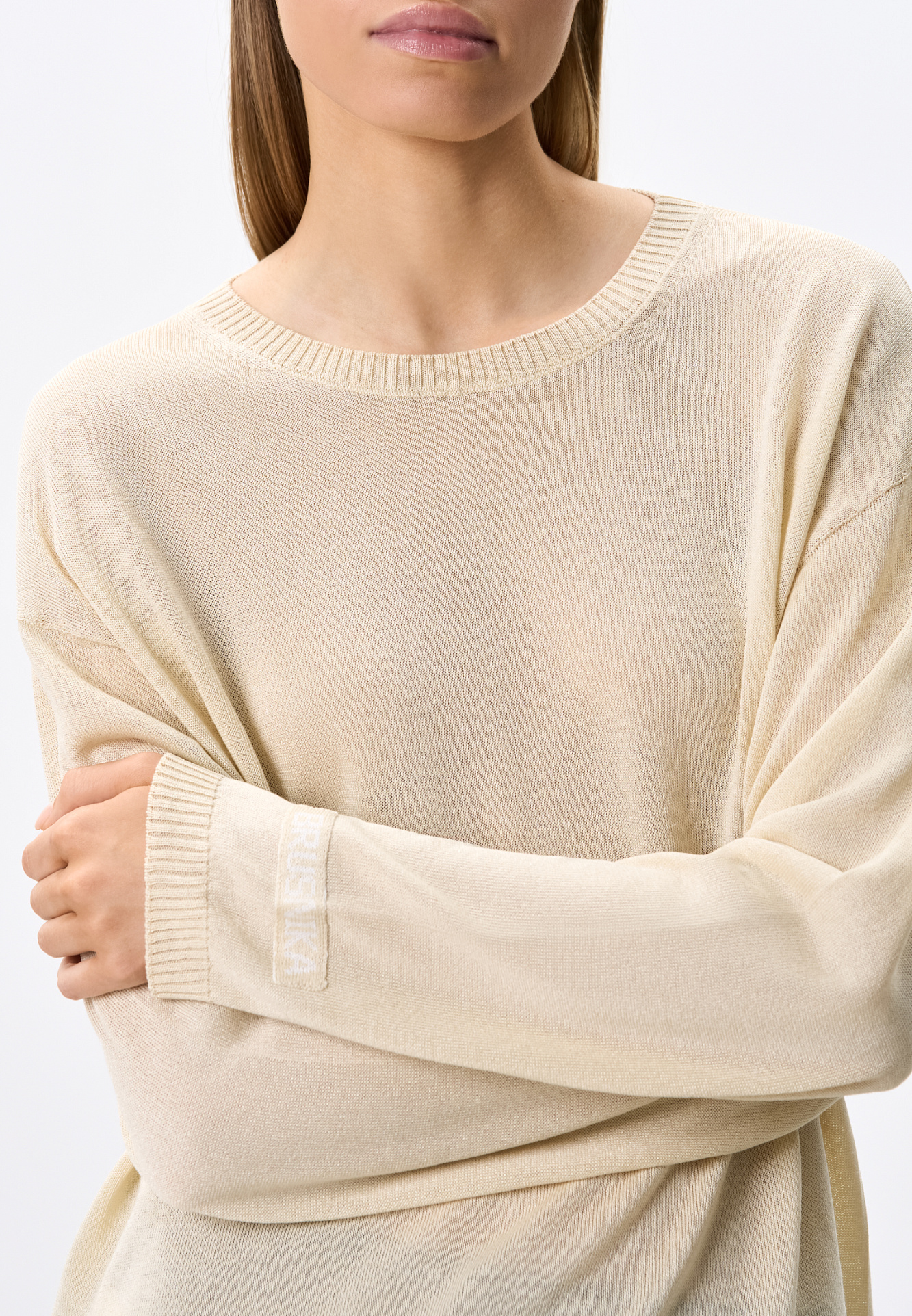 Трикотажный лонгслив из тонкой вискозы свободного силуэта. Спущенная линия плеча, круглый вырез и брендированный ярлык на рукаве.
