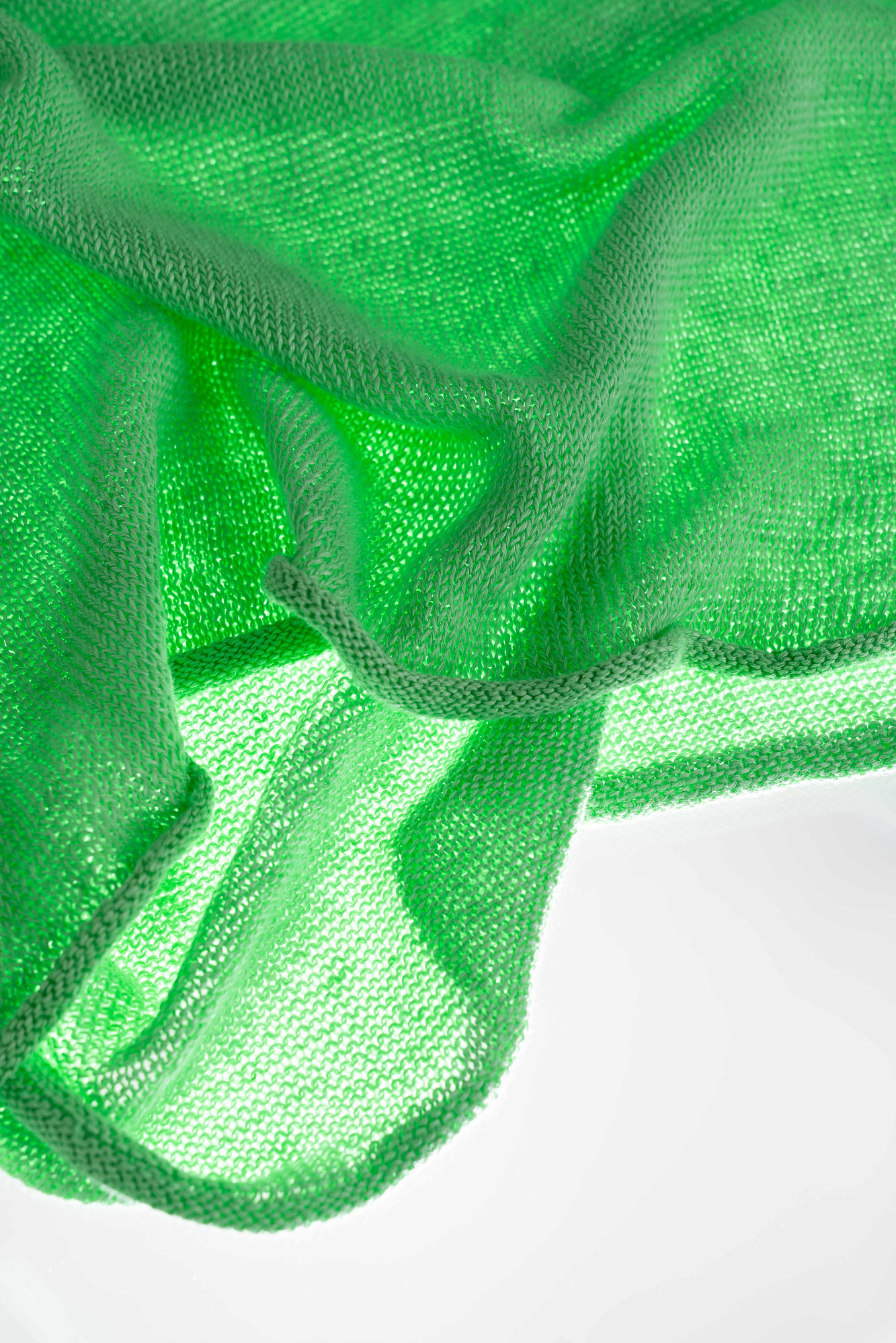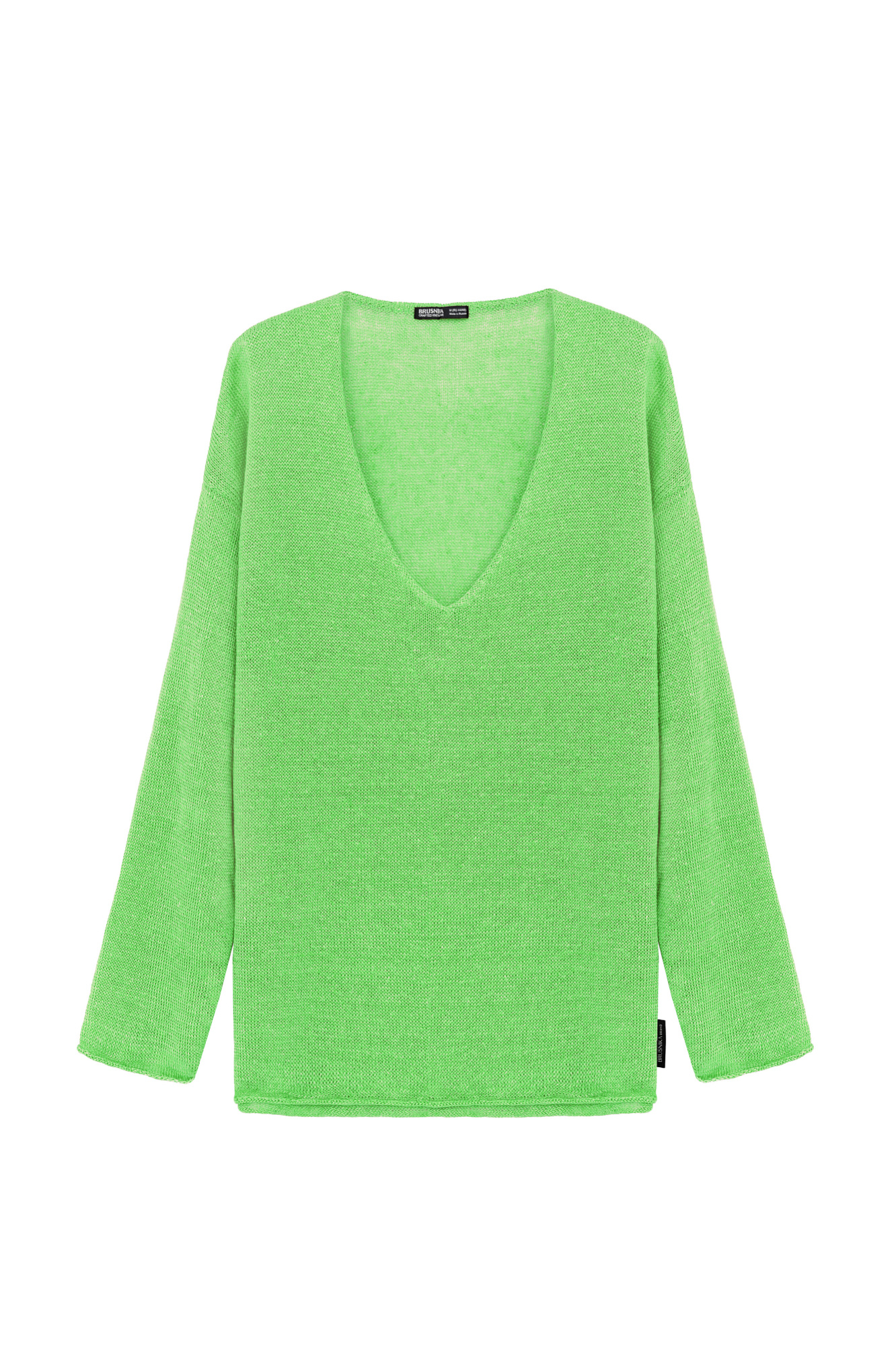 Трикотажный джемпер из 100% льна. Модель свободного силуэта с длинным рукавом и с V-образным вырезом горловины. Изделие декорировано брендированным ярлыком сбоку и валиками по низу.