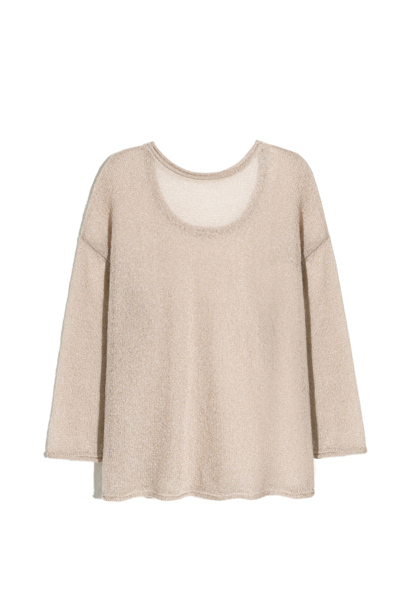 Полупрозрачный трикотажный джемпер с люрексом. Модель свободного силуэта с длинным рукавом и глубоким вырезом на спине.
