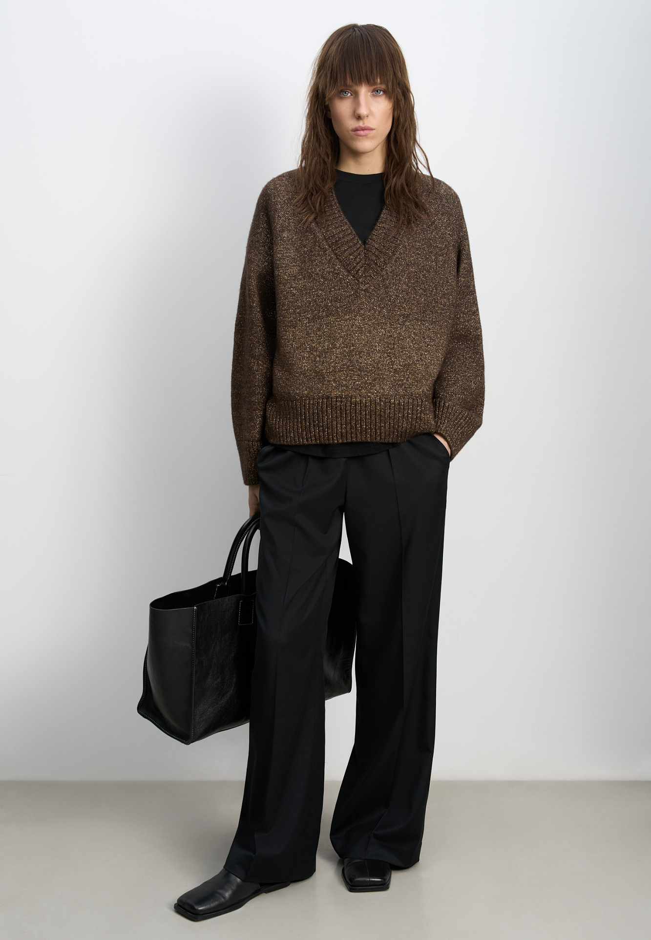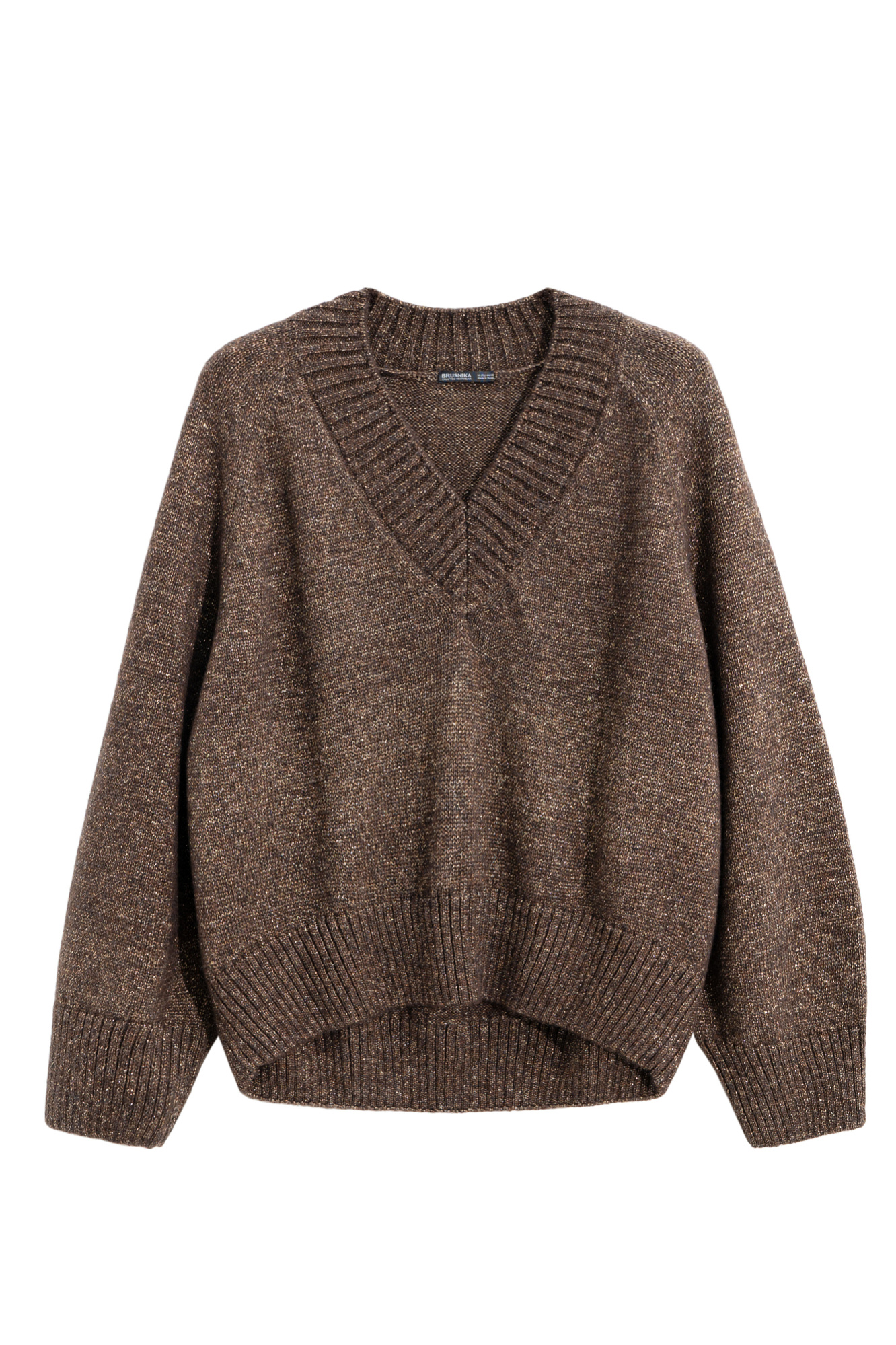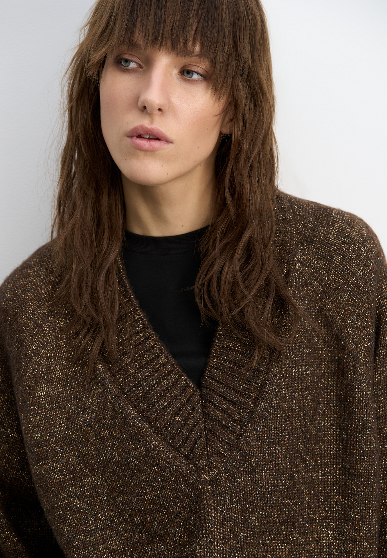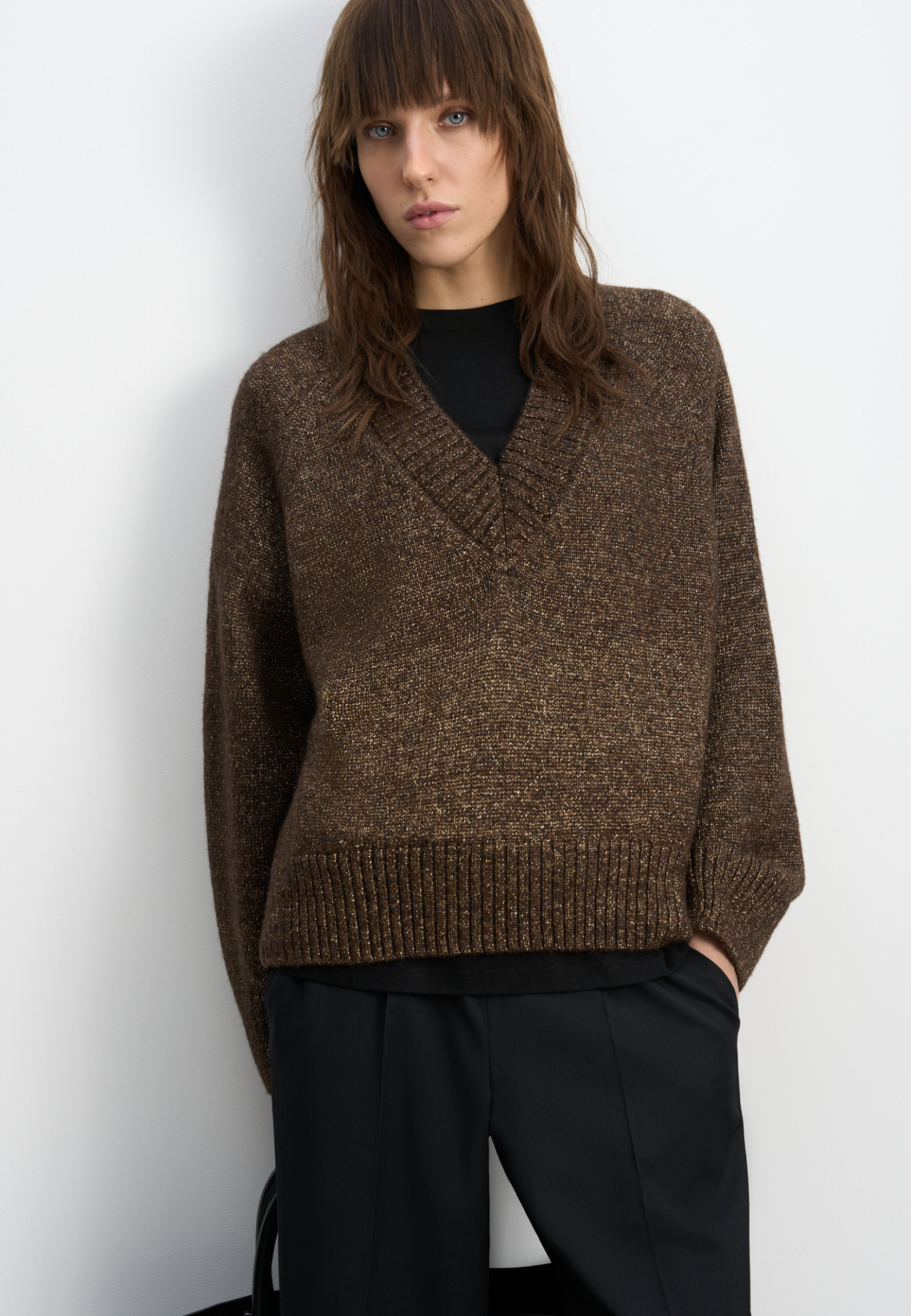 Трикотажный джемпер из шерсти мериноса с люрексом. Модель свободного силуэта с V-образным вырезом.