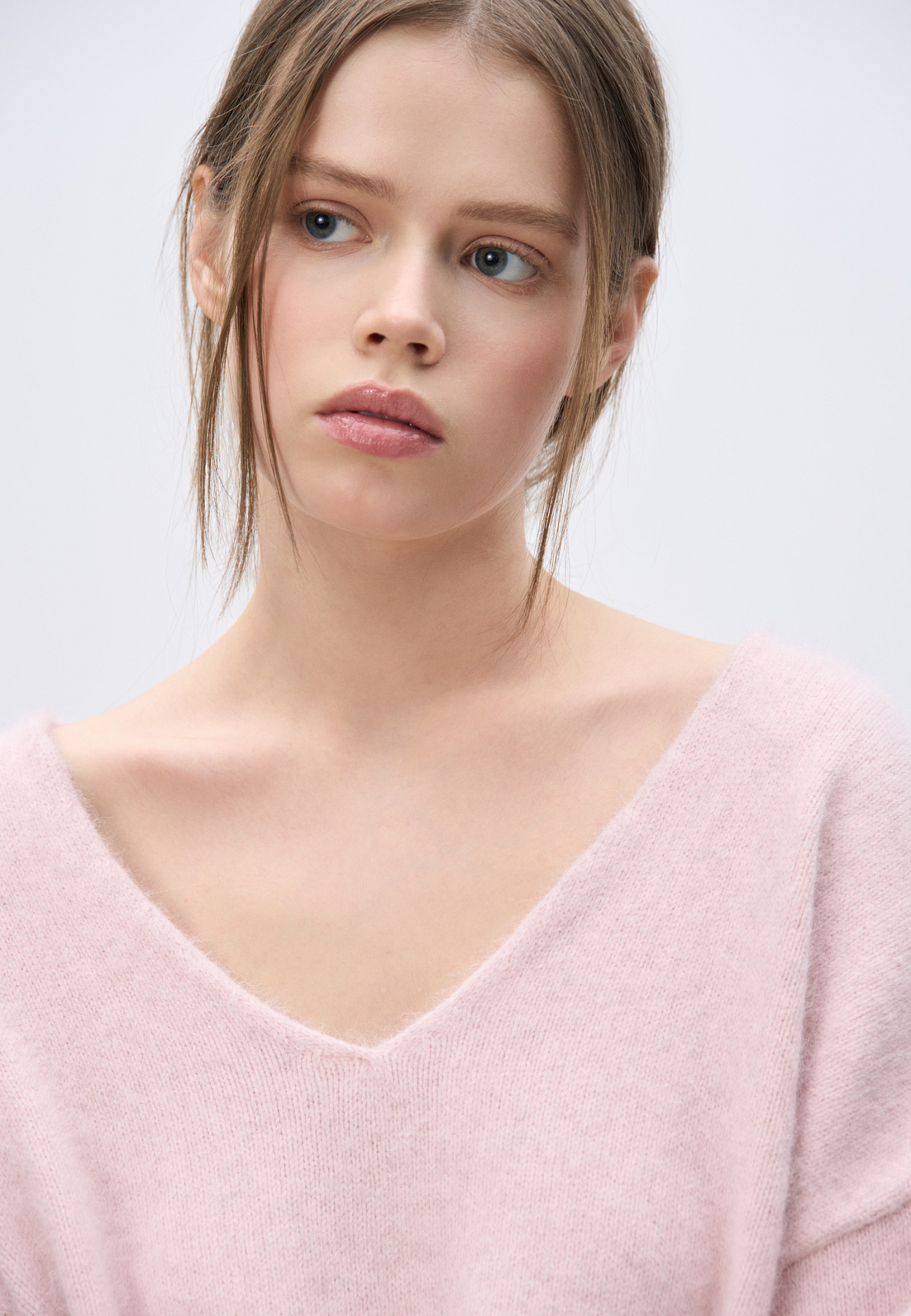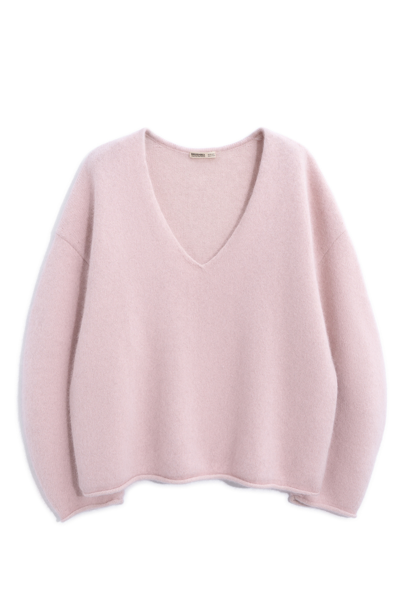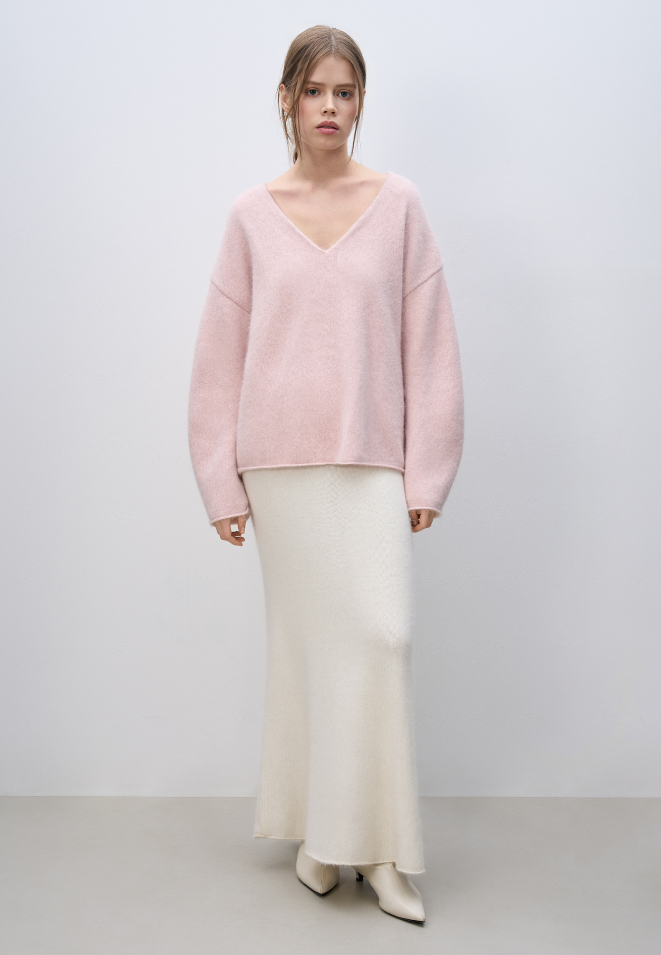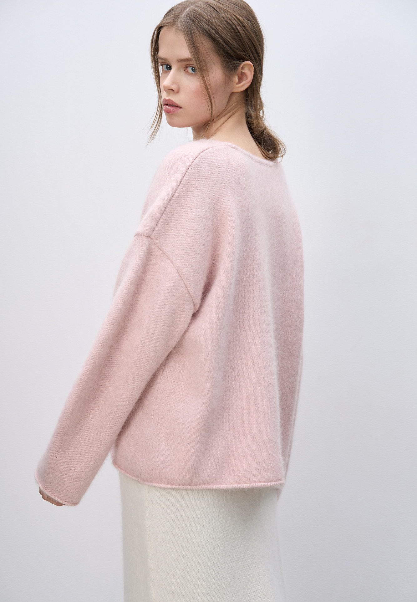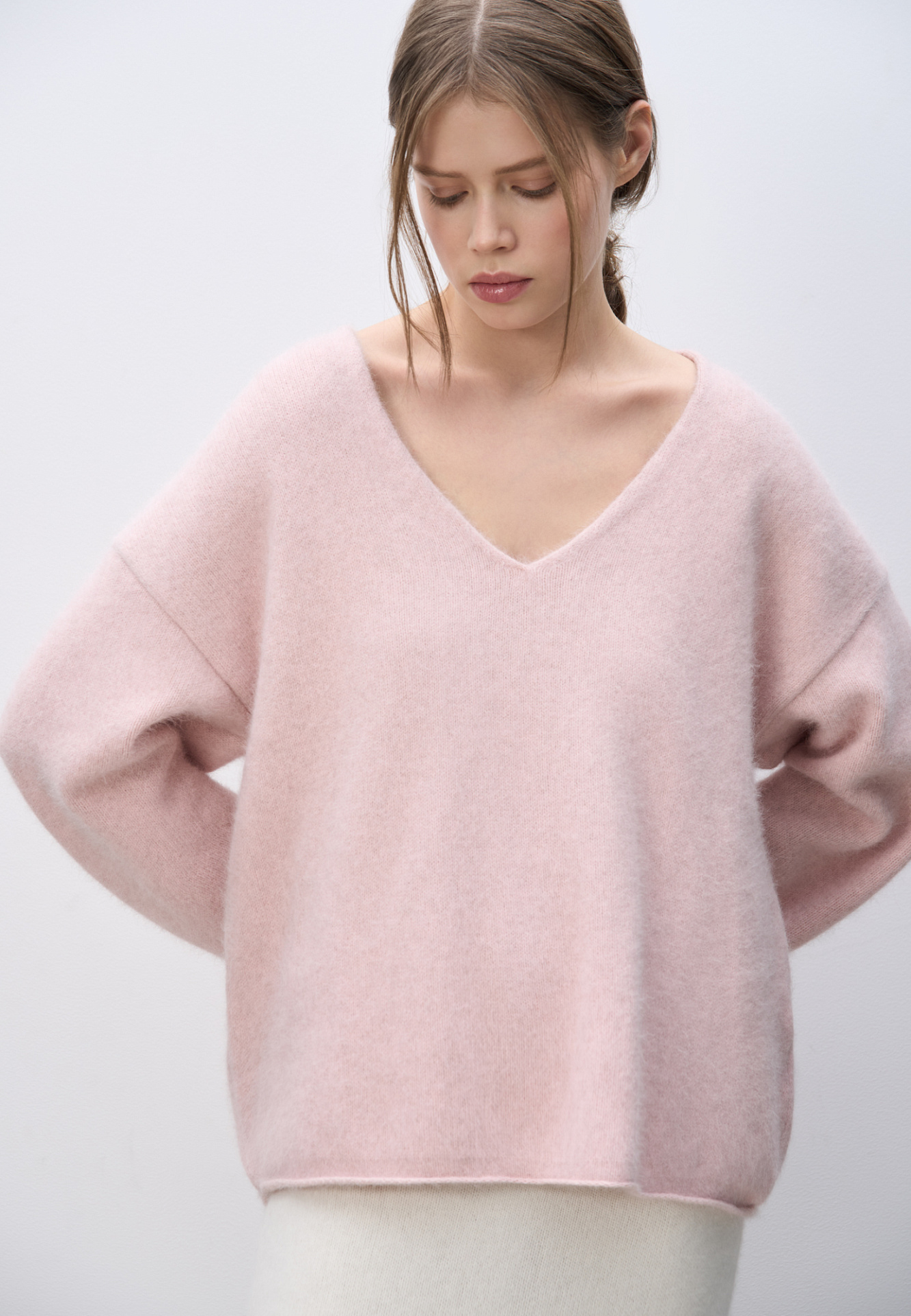 Объемный трикотажный джемпер из пуха лисы. Модель с глубоким V-образным вырезом горловины, спущенной линией плеч, длинными широкими рукавами и валиками по низу. Дополнить образ можно юбкой.
