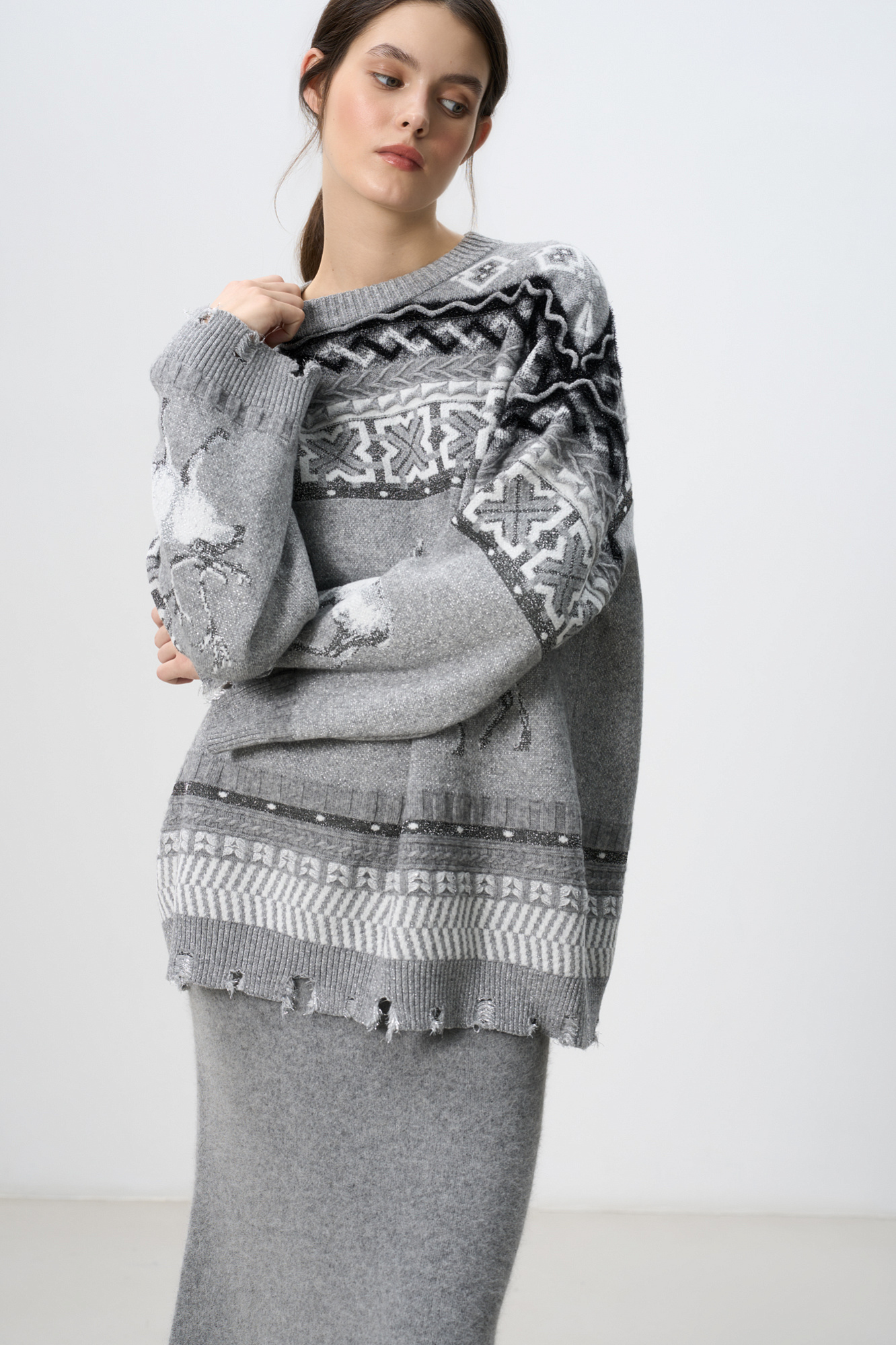 Трикотажный джемпер с добавлением кашемира с жаккардовым узором в виде оленей и орнамента. Модель со спущенной линией плеча и круглым вырезом горловины. Декорировано люрексом. Манжеты рукавов, воротник и низ изделия с рваным краем.