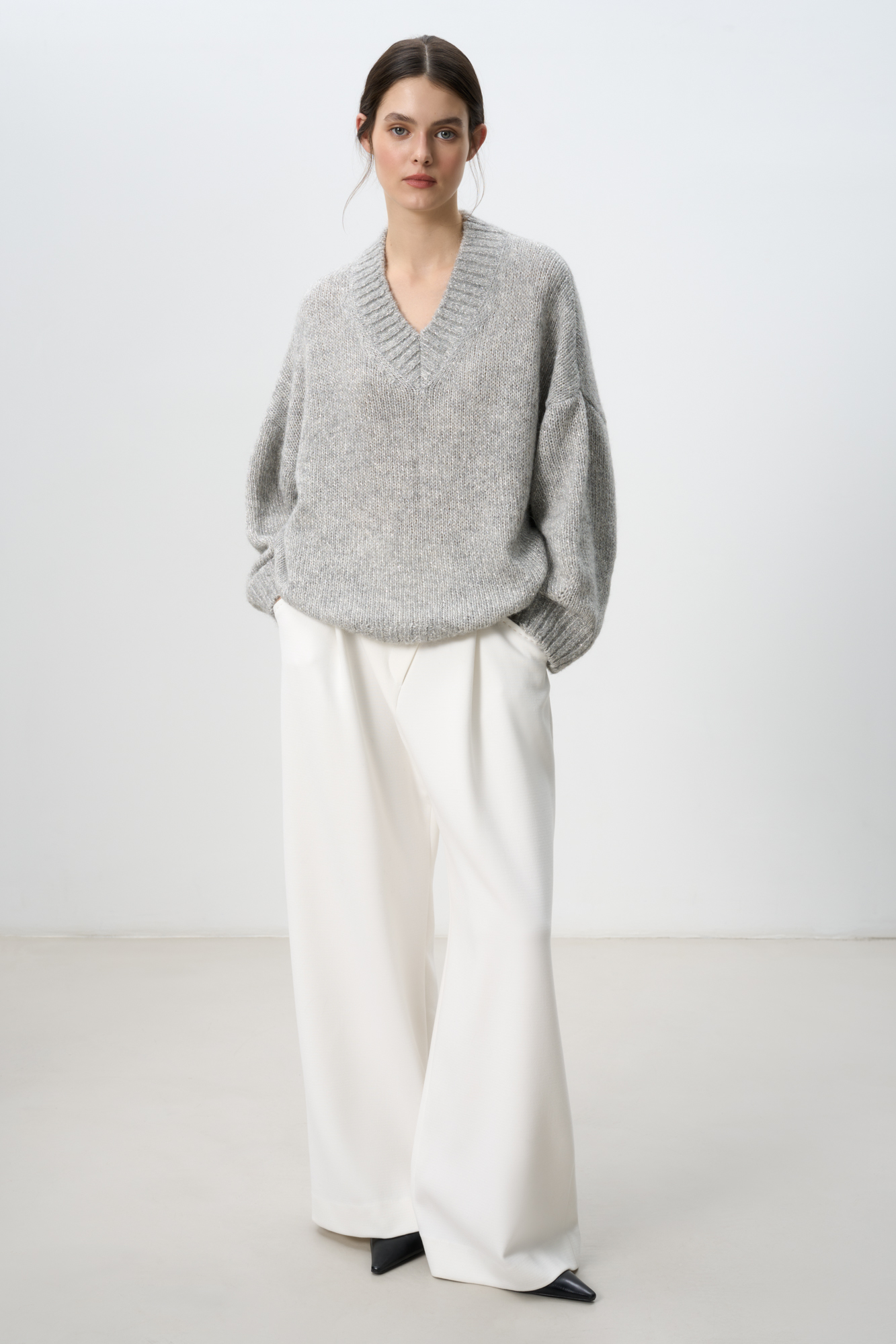 Трикотажный джемпер из шерсти альпака с добавлением люрекса. Модель с V-вырезом, спущенной линией плеча и декоративными сбавками на манжетах. Изделие декорировано пайетками.