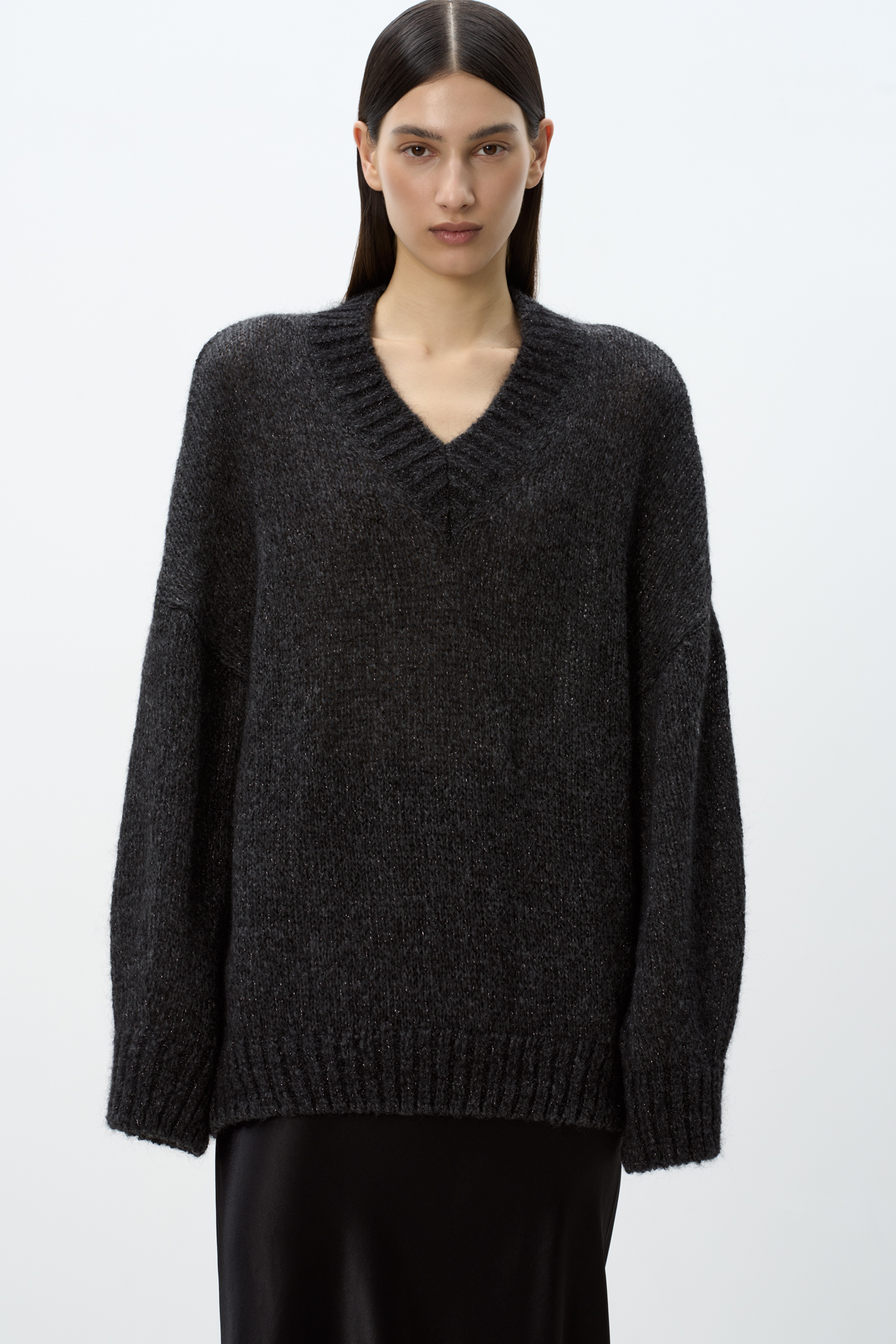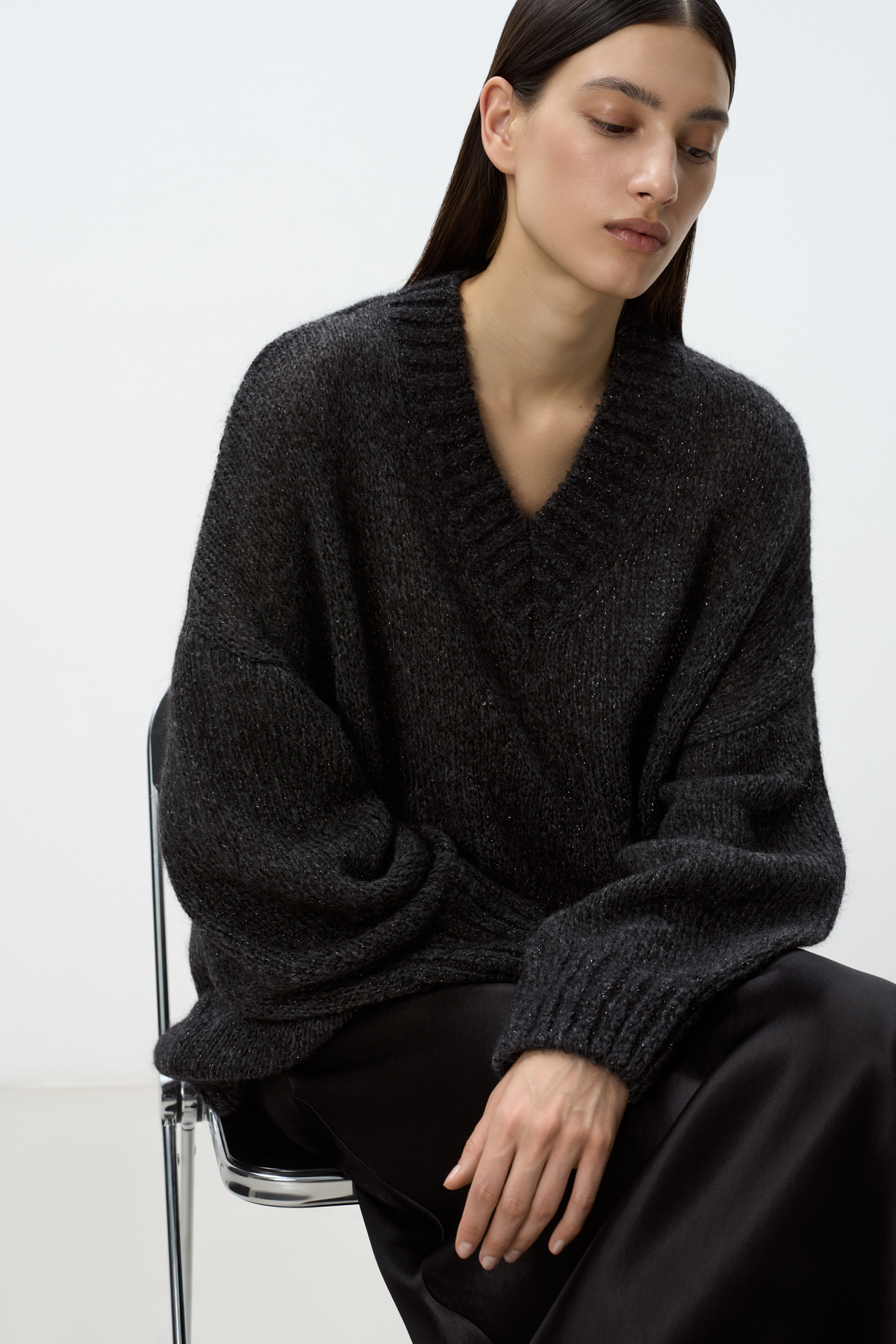 Трикотажный джемпер из шерсти альпака с добавлением люрекса. Модель с V-вырезом, спущенной линией плеча и декоративными сбавками на манжетах. Изделие декорировано пайетками.