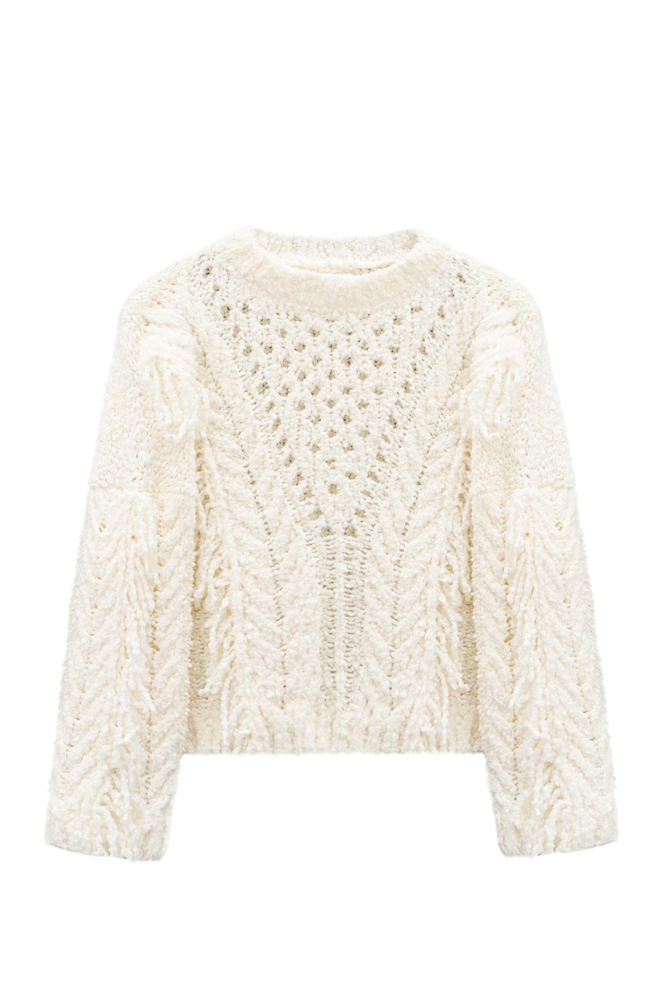 Трикотажный джемпер из шерсти мериноса в стиле бохо. Модель свободного силуэта со спущенной линией плеча и круглым вырезом горловины. Изделие декорировано вывязанными крупными косами и длинной бахромой.