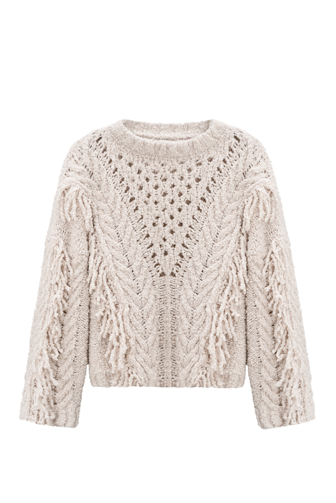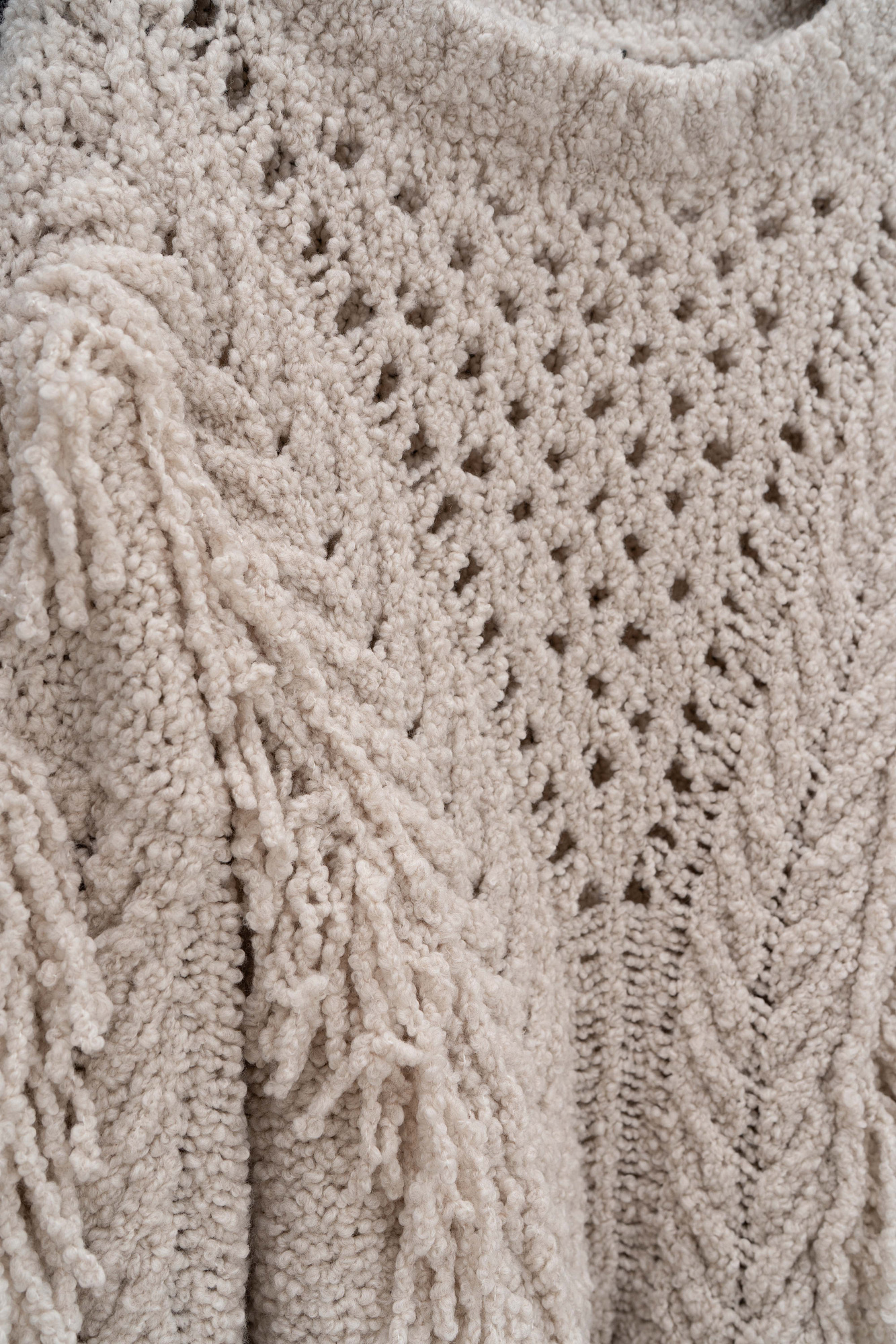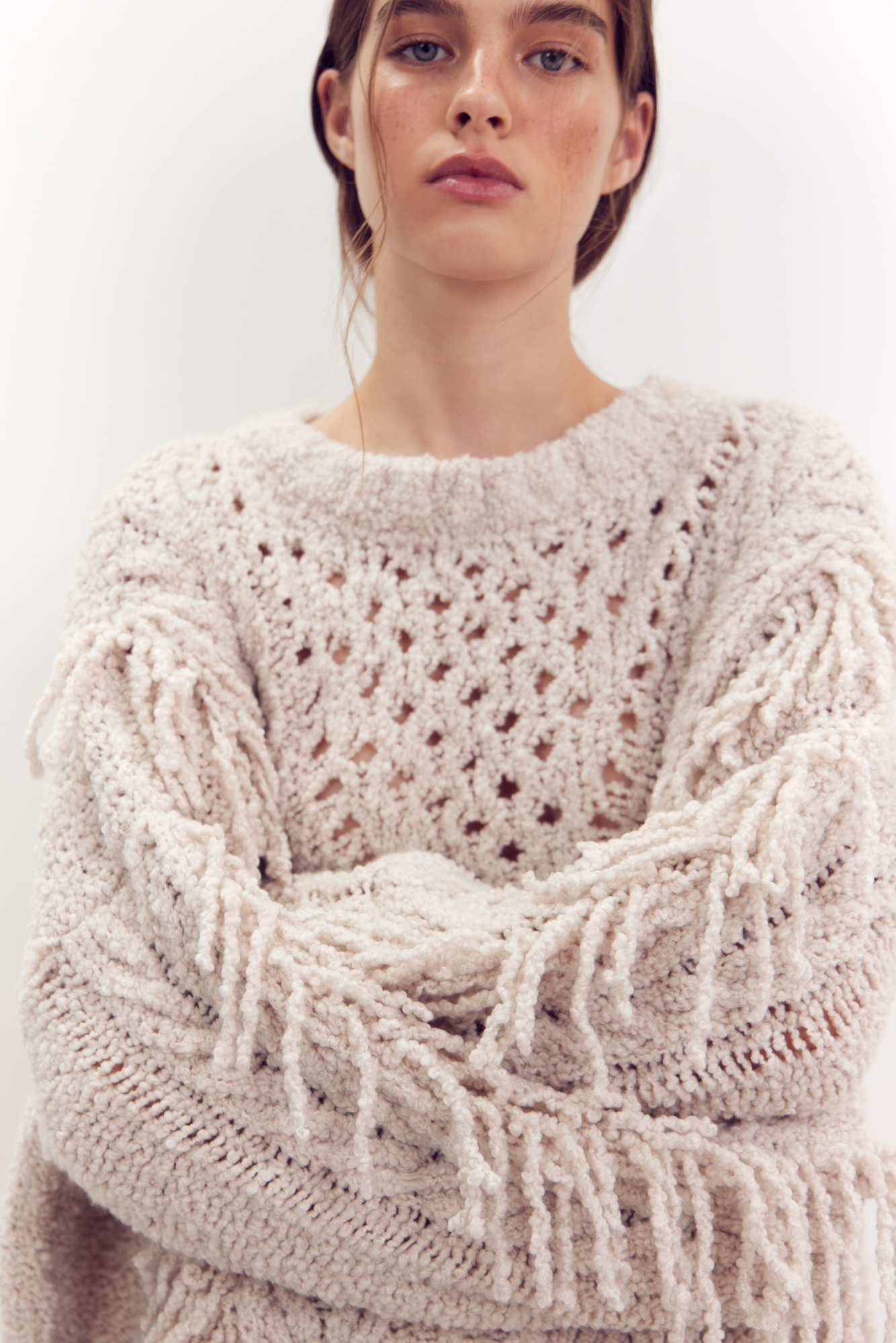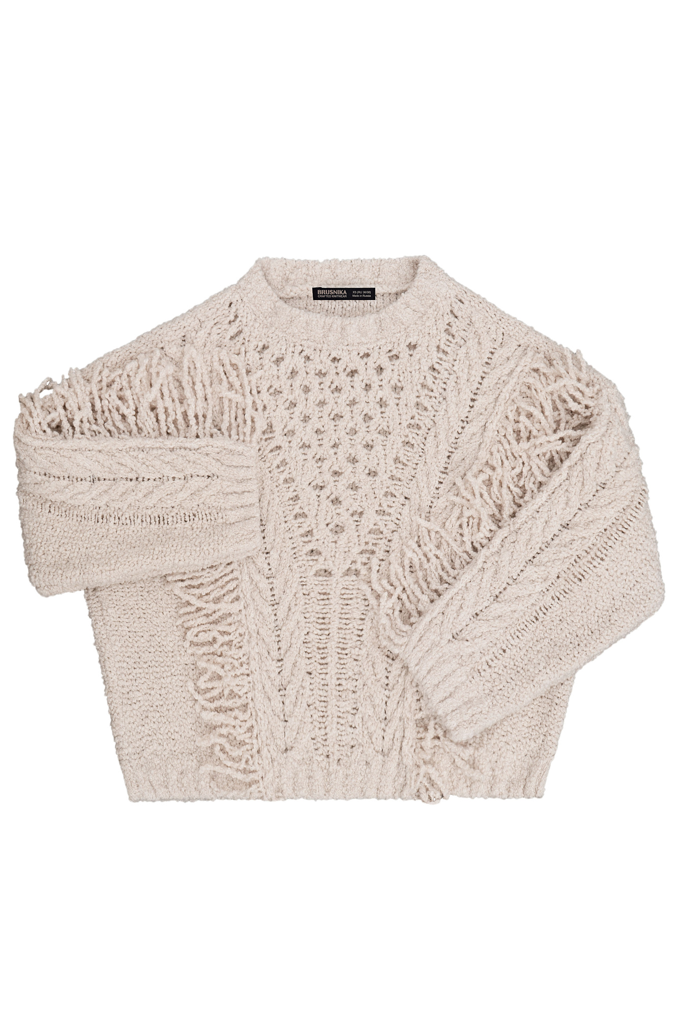 Трикотажный джемпер из шерсти мериноса в стиле бохо. Модель свободного силуэта со спущенной линией плеча и круглым вырезом горловины. Изделие декорировано вывязанными крупными косами и длинной бахромой.