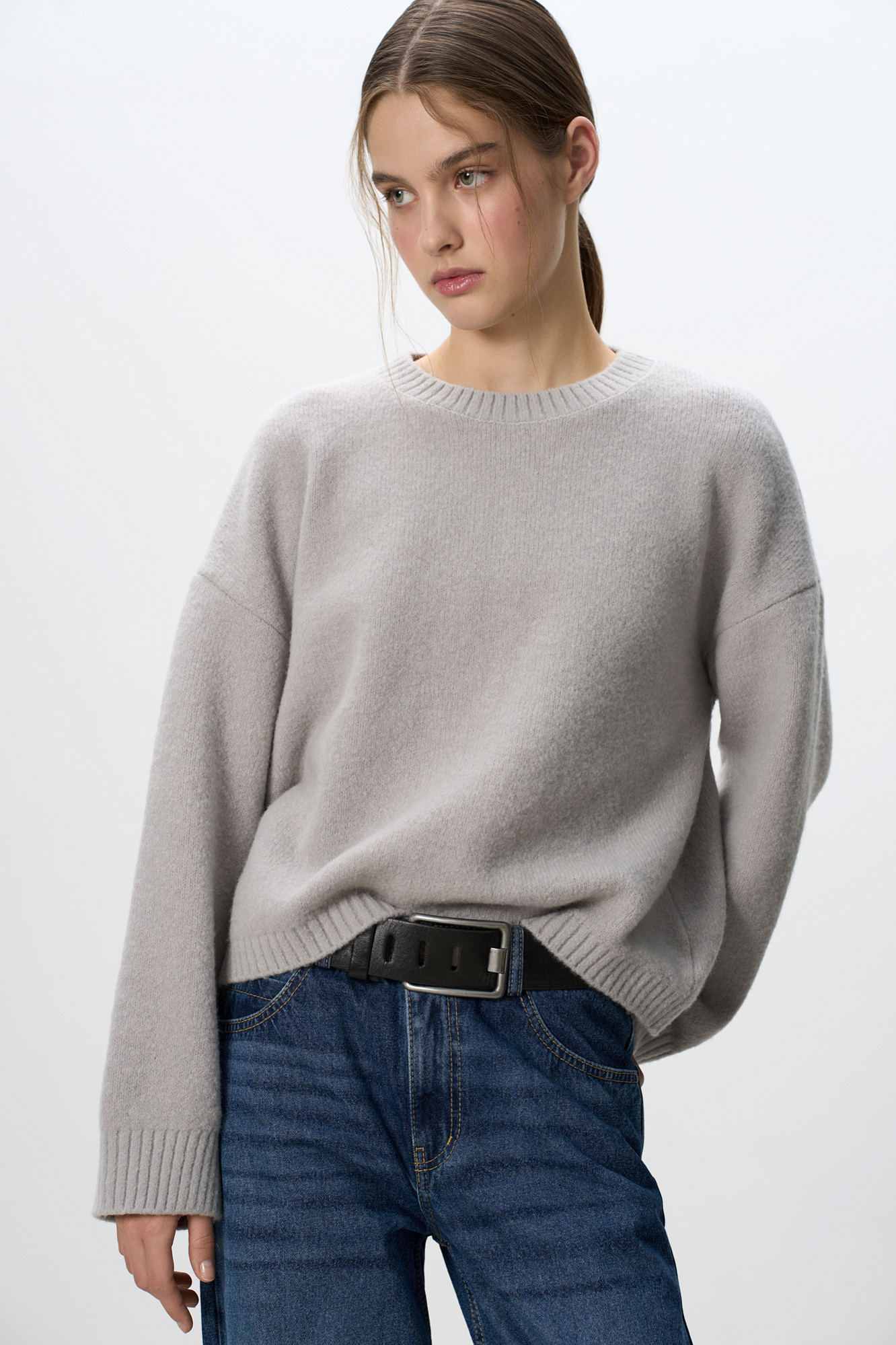 Трикотажный джемпер из смесовой шерсти с добавлением мохера. Модель свободного силуэта со спущенной линией плеч и круглым вырезом горловины. Края изделия выполнены в рубчик. Дополнить образ можно юбкой.