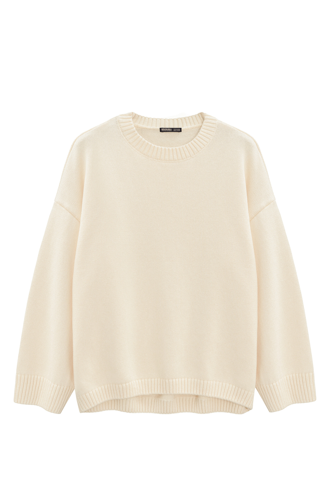 Трикотажный джемпер из 100% хлопка. Модель свободного силуэта со спущенной линией плеч и круглым вырезом горловины. Края изделия выполнены в рубчик. Дополнить образ можно юбкой.