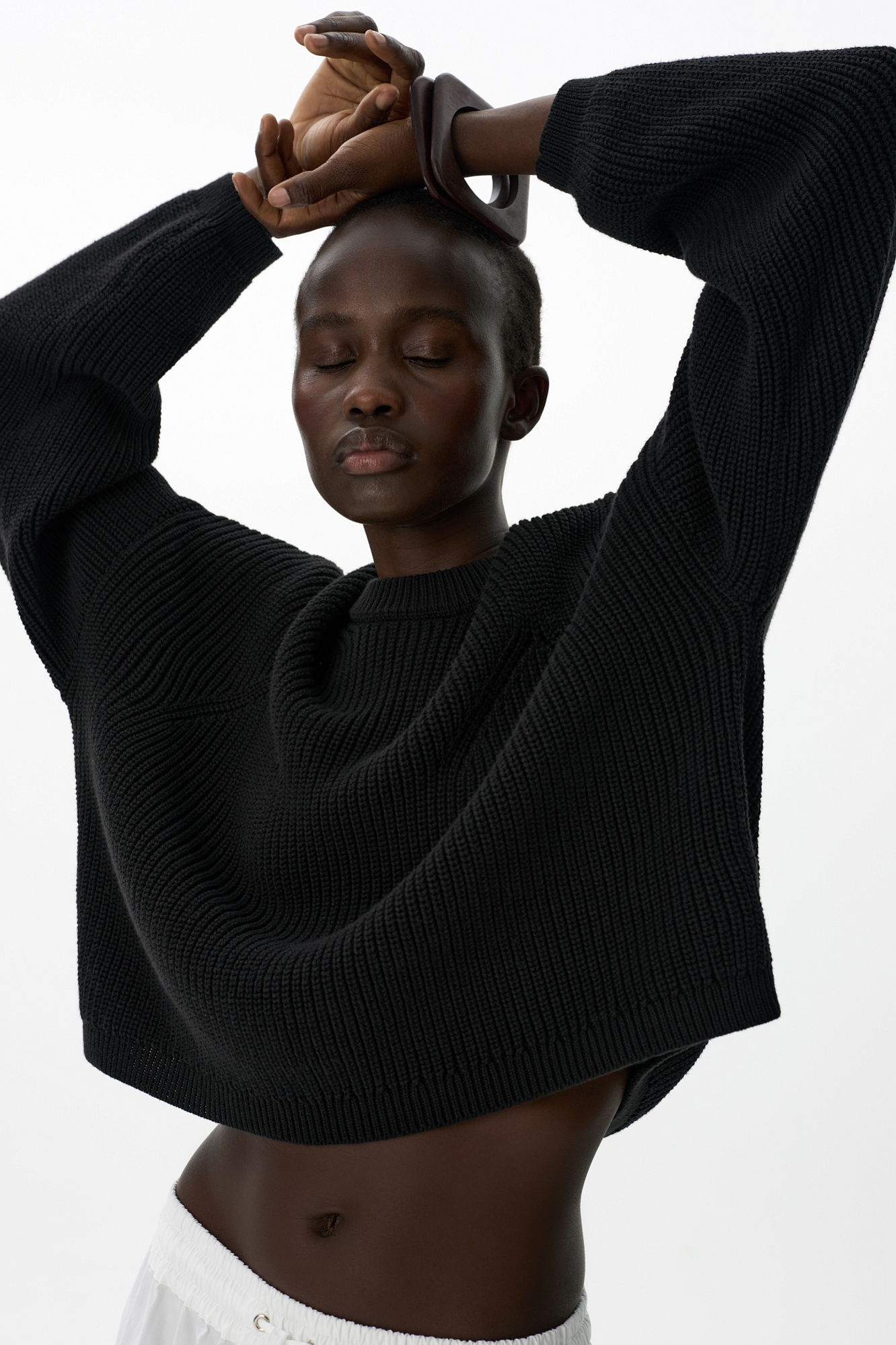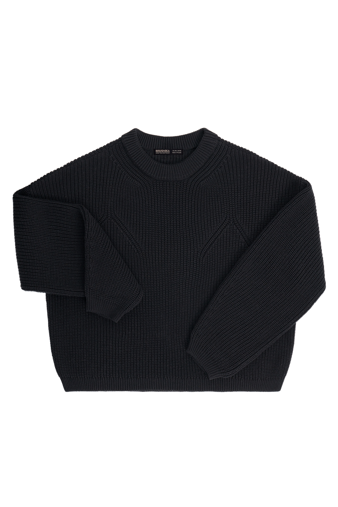 Трикотажный джемпер из 100% хлопка с декоративными сбавками на груди и воротнике. модель свободного силуэта со спущенной линией плеч и круглым вырезом горловины. Манжеты рукавов и низ изделия выполнены на эластичной резинке.