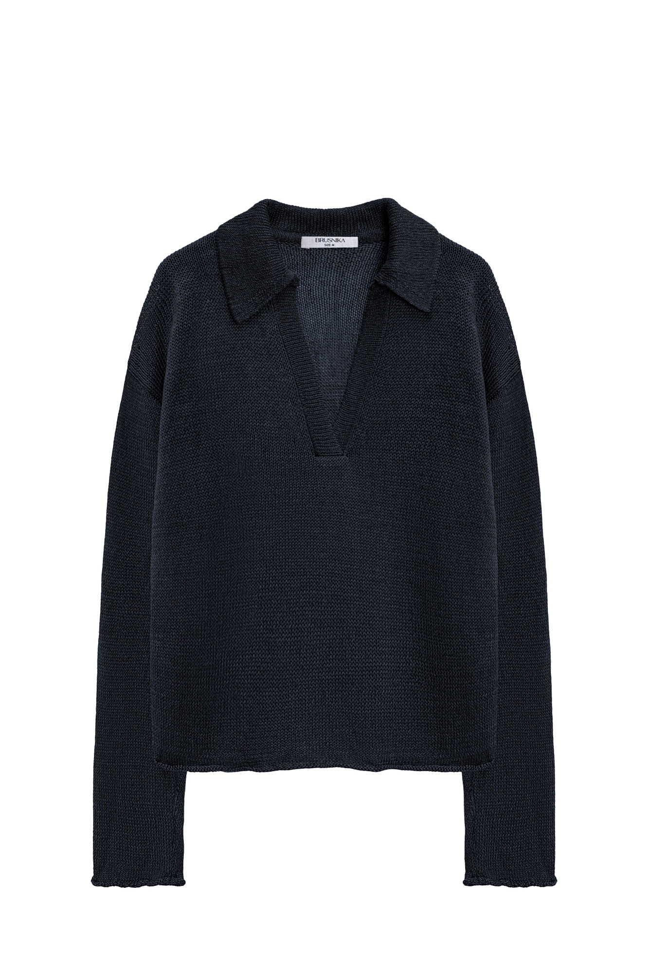Трикотажный джемпер из 100% льна с воротником поло. Модель свободного силуэта, со спущенной линией плеча, длинными рукавами, V-образным вырезом горловины и валиками по нижнему краю изделия.