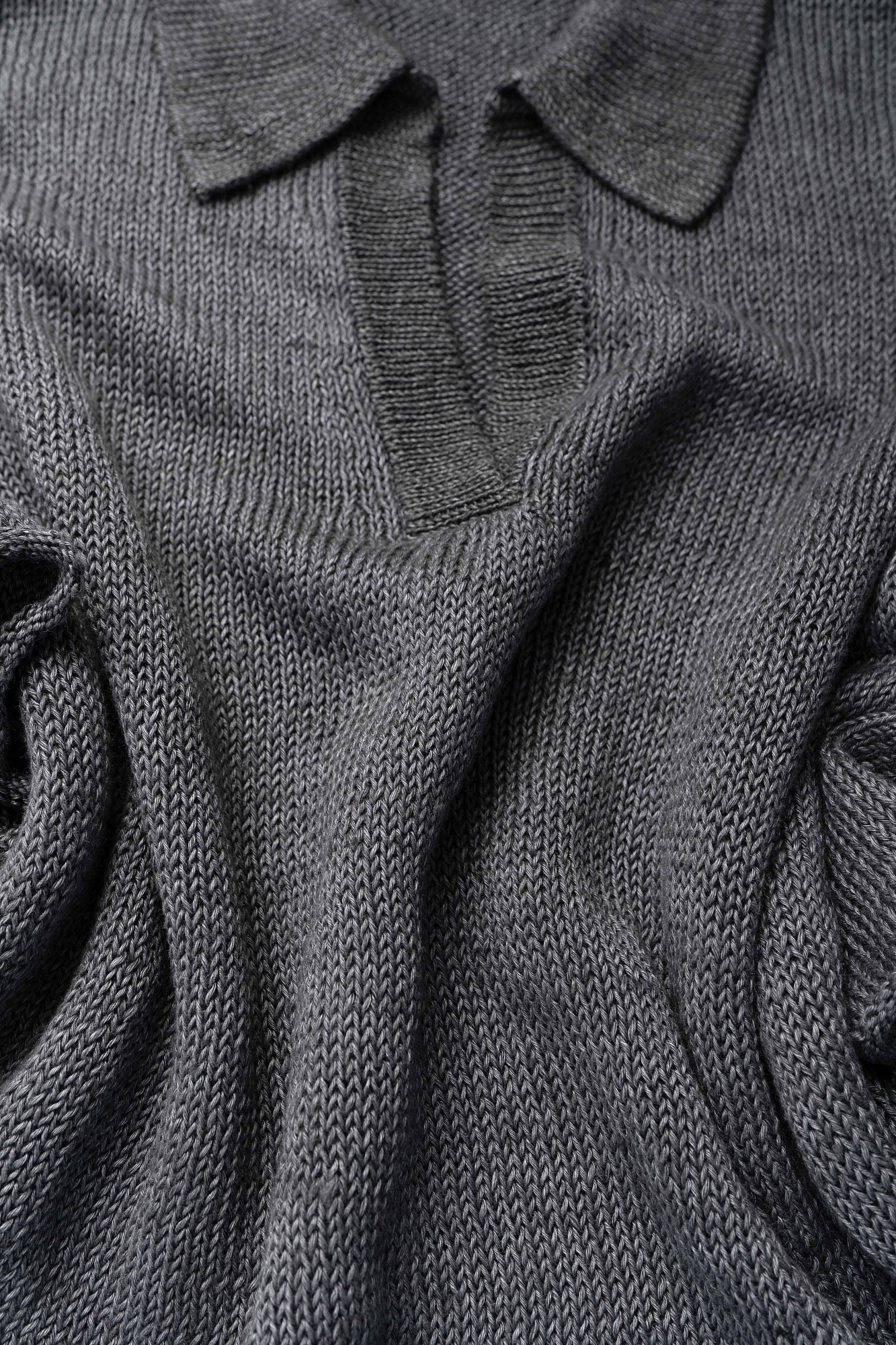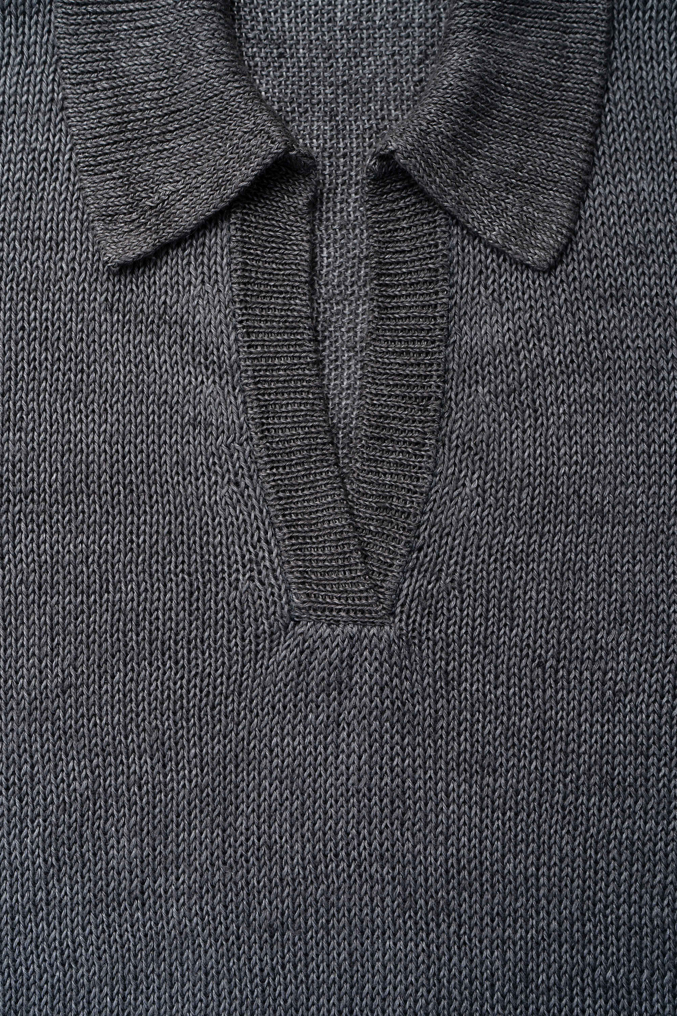 Трикотажный джемпер из 100% льна с воротником поло. Модель свободного силуэта, со спущенной линией плеча, длинными рукавами, V-образным вырезом горловины и валиками по нижнему краю изделия.