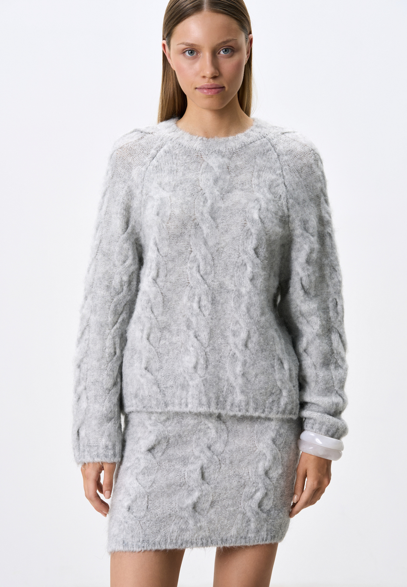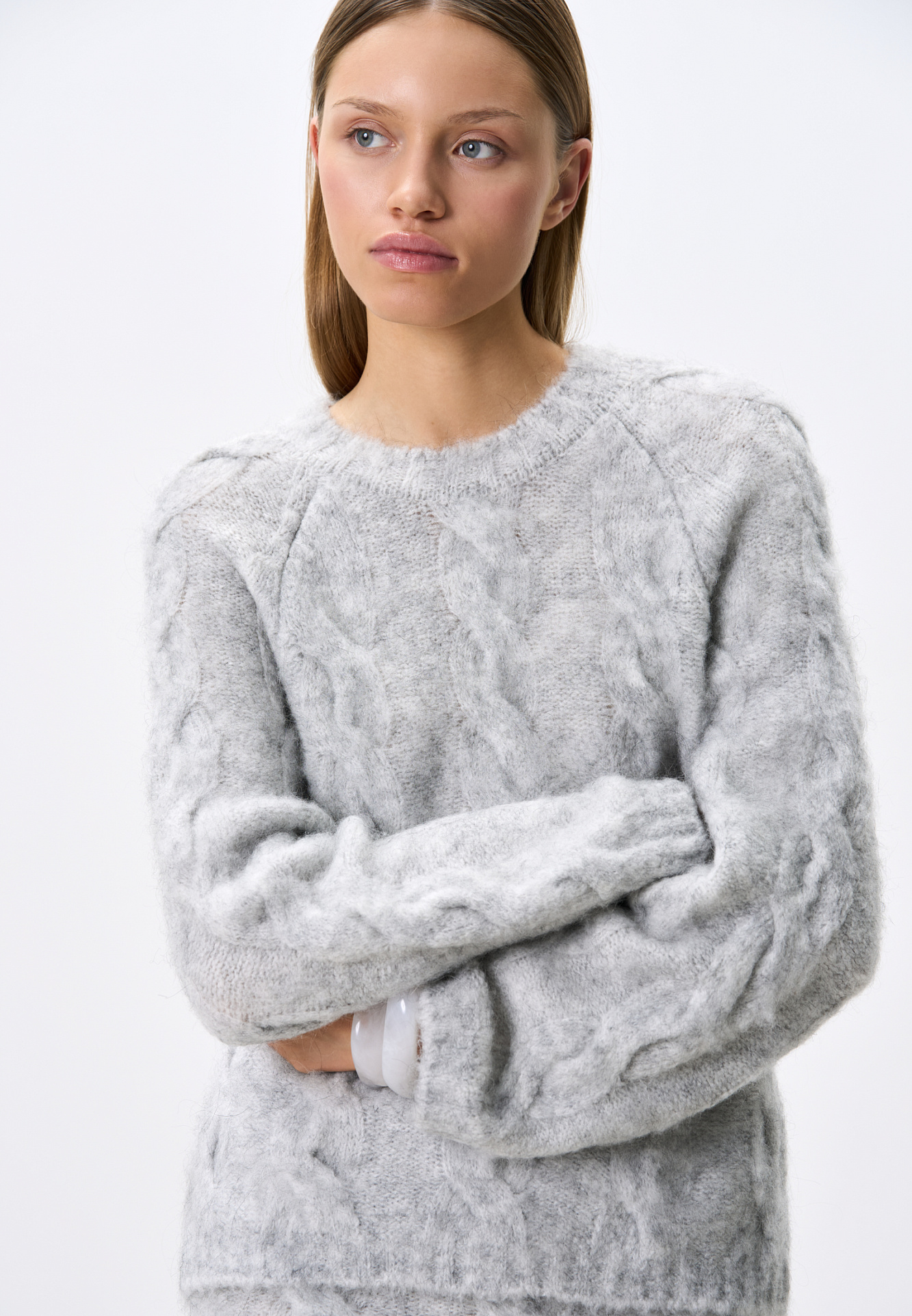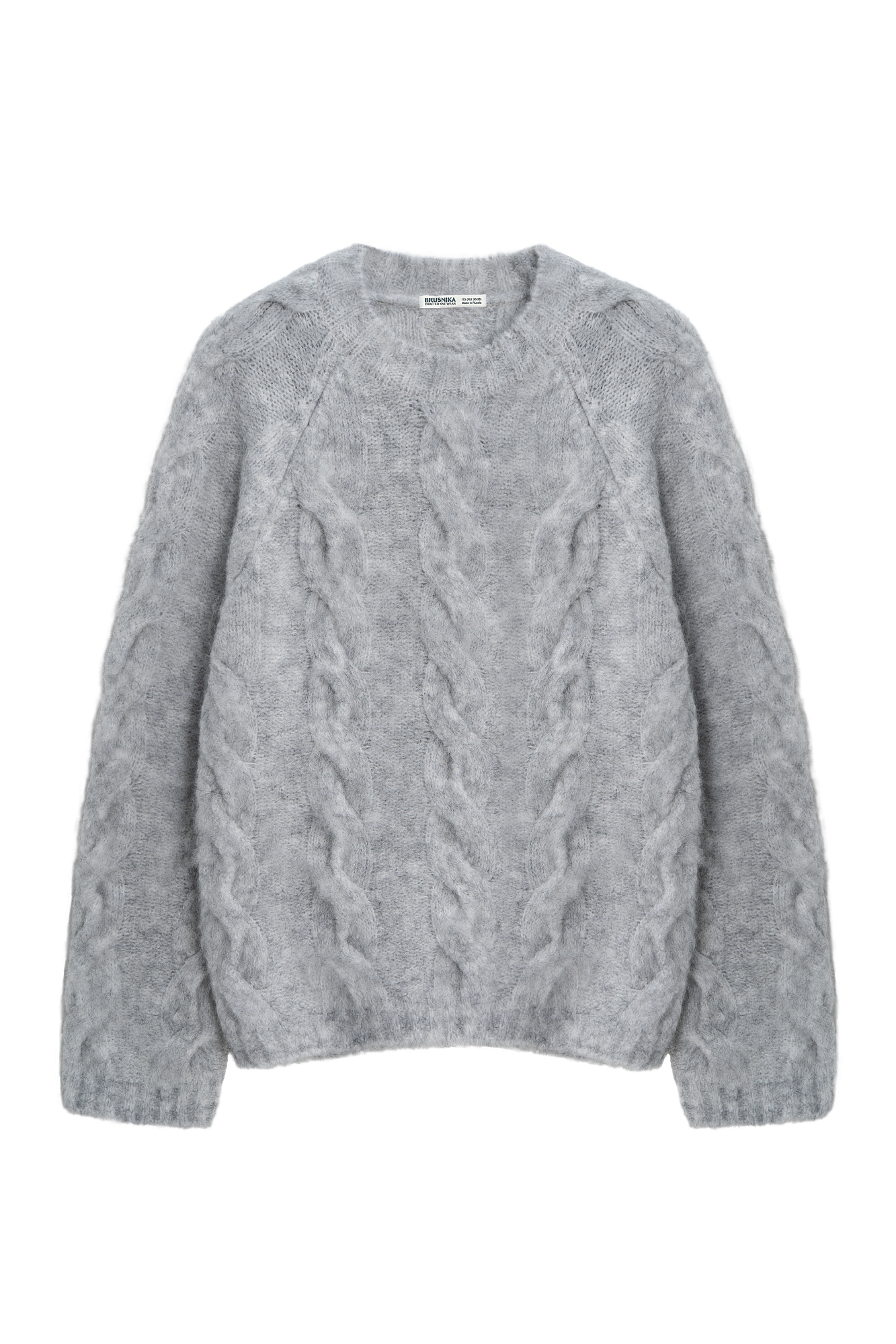 Трикотажный джемпер из шерсти и мохера. Модель свободного силуэта со спущенной линией плеч, объемными рукавами и круглым вырезом горловины. Изделие декорировано фактурной вязкой в виде кос. Края выполнены в рубчик.