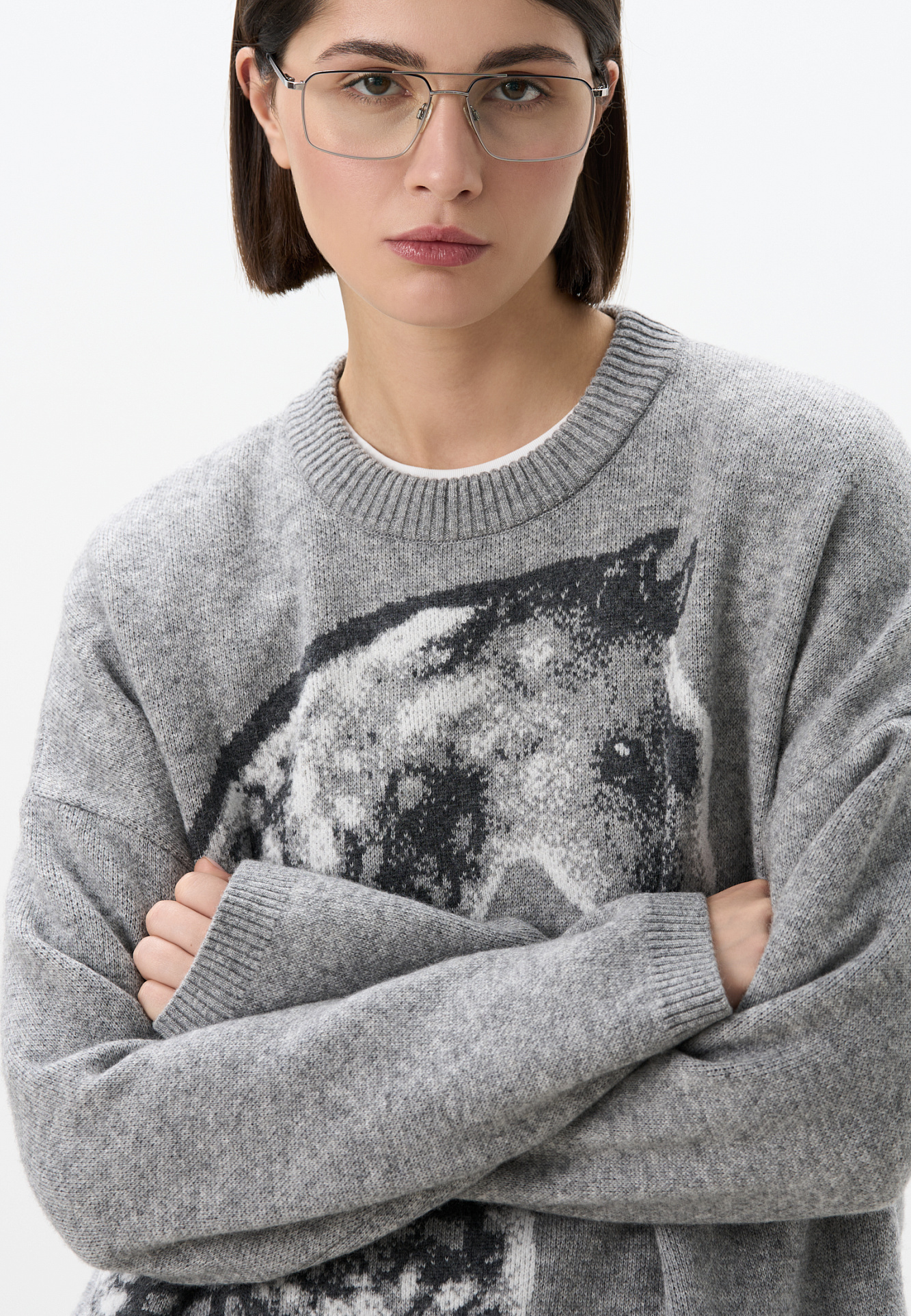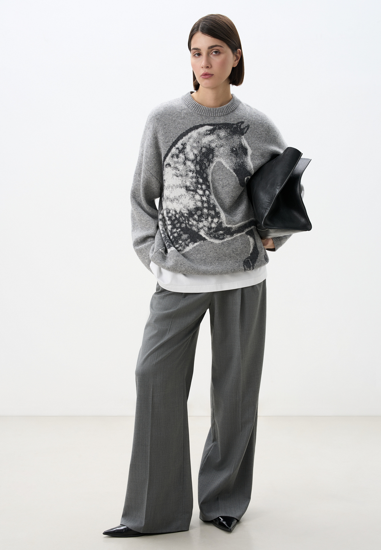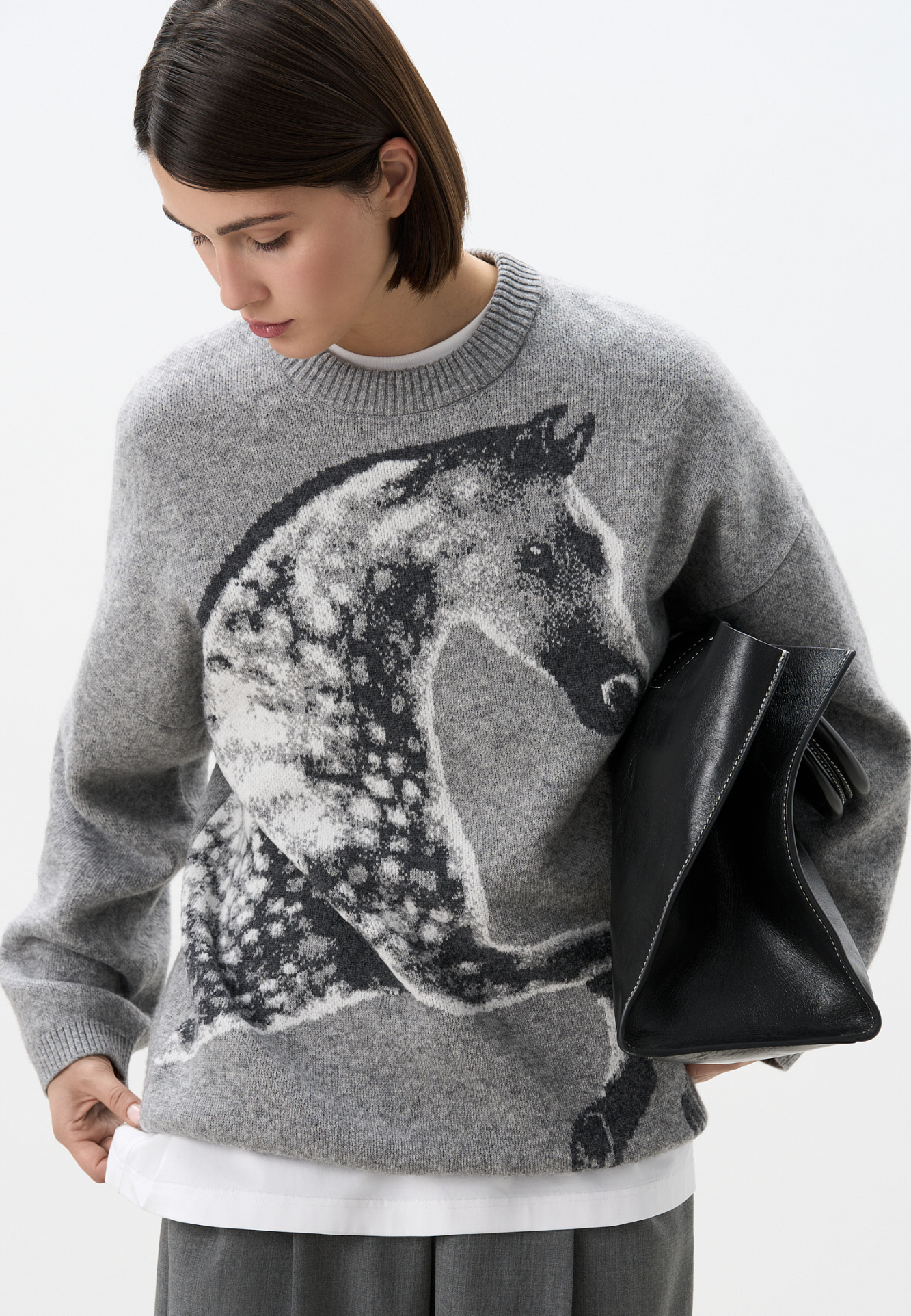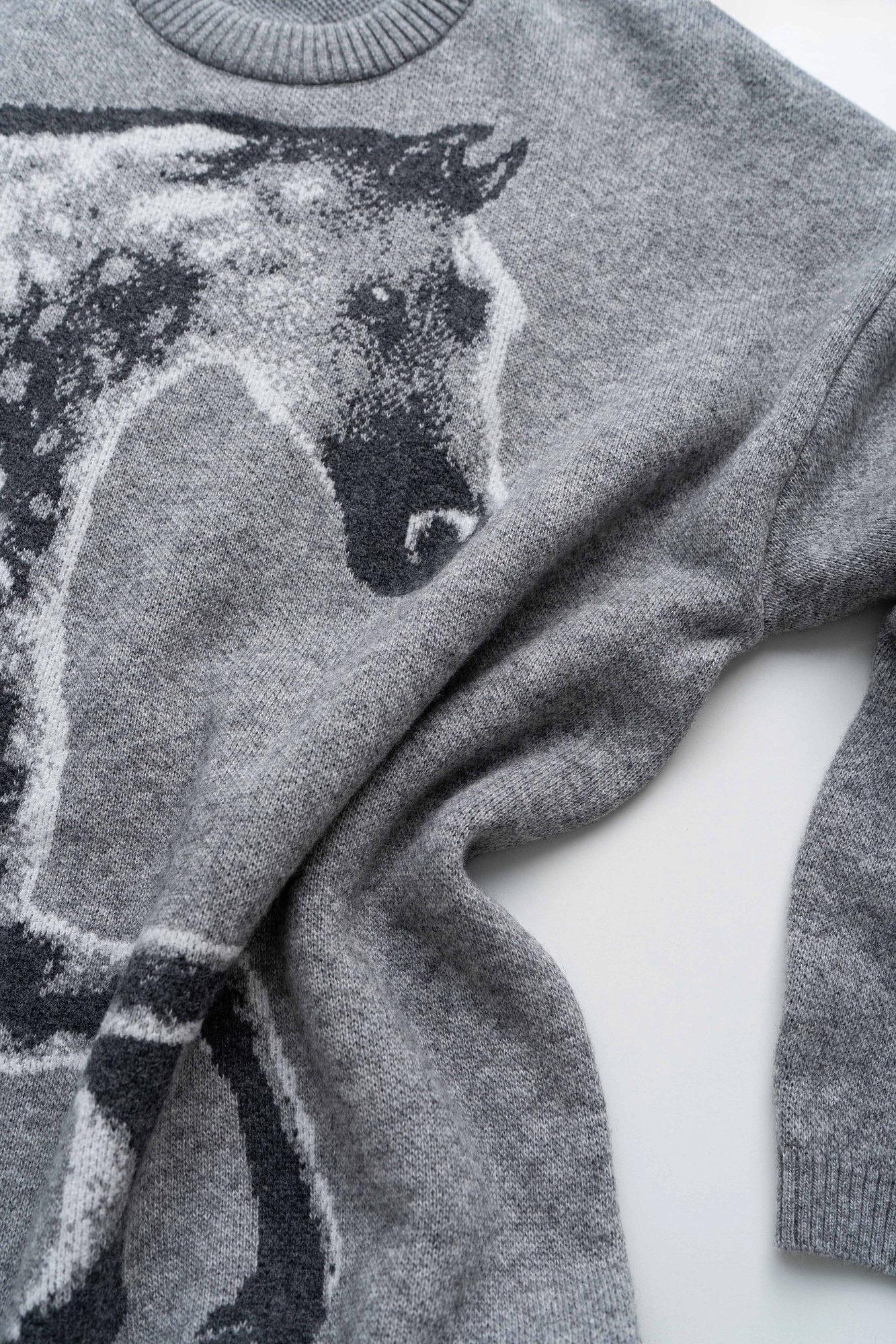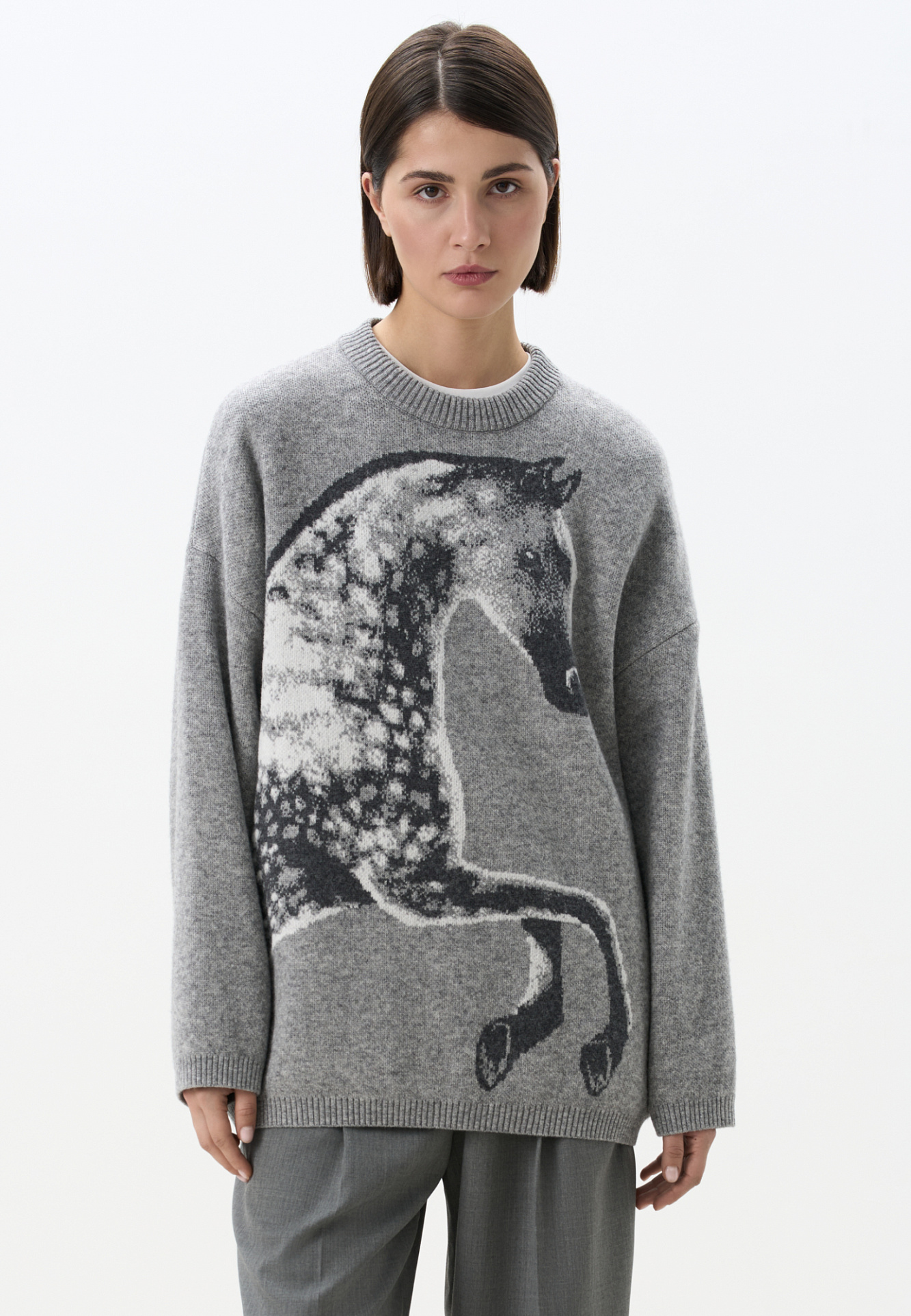 Трикотажный джемпер из шерсти и кашемира. Модель свободного силуэта со спущенной линией плеч, круглым вырезом горловины и жаккардовым анималистичным принтом лошади. Края изделия выполнены в рубчик.