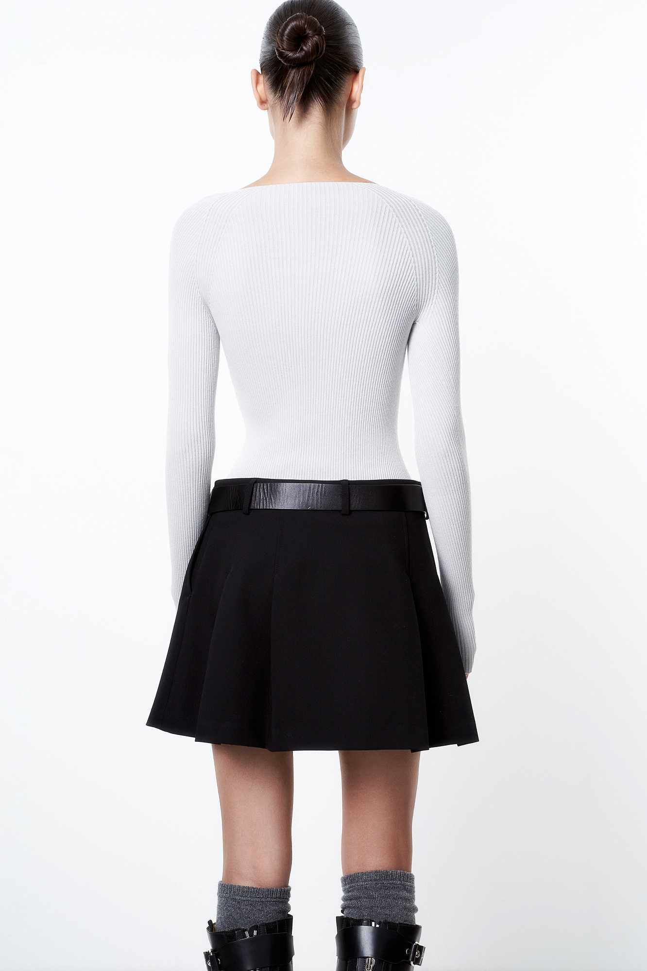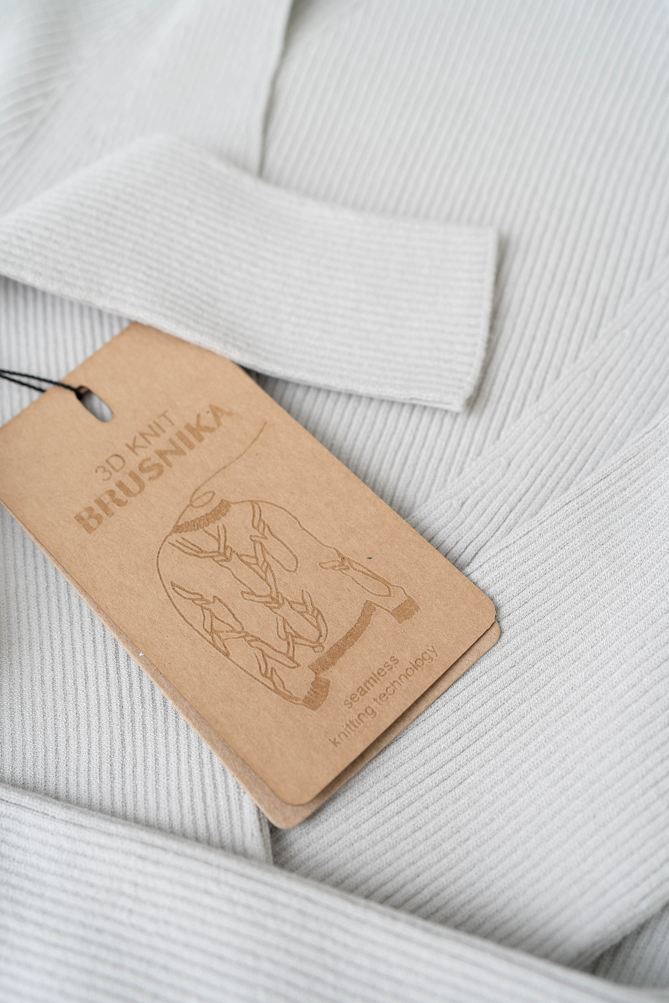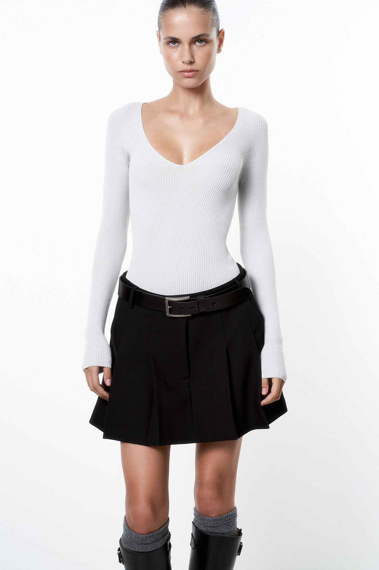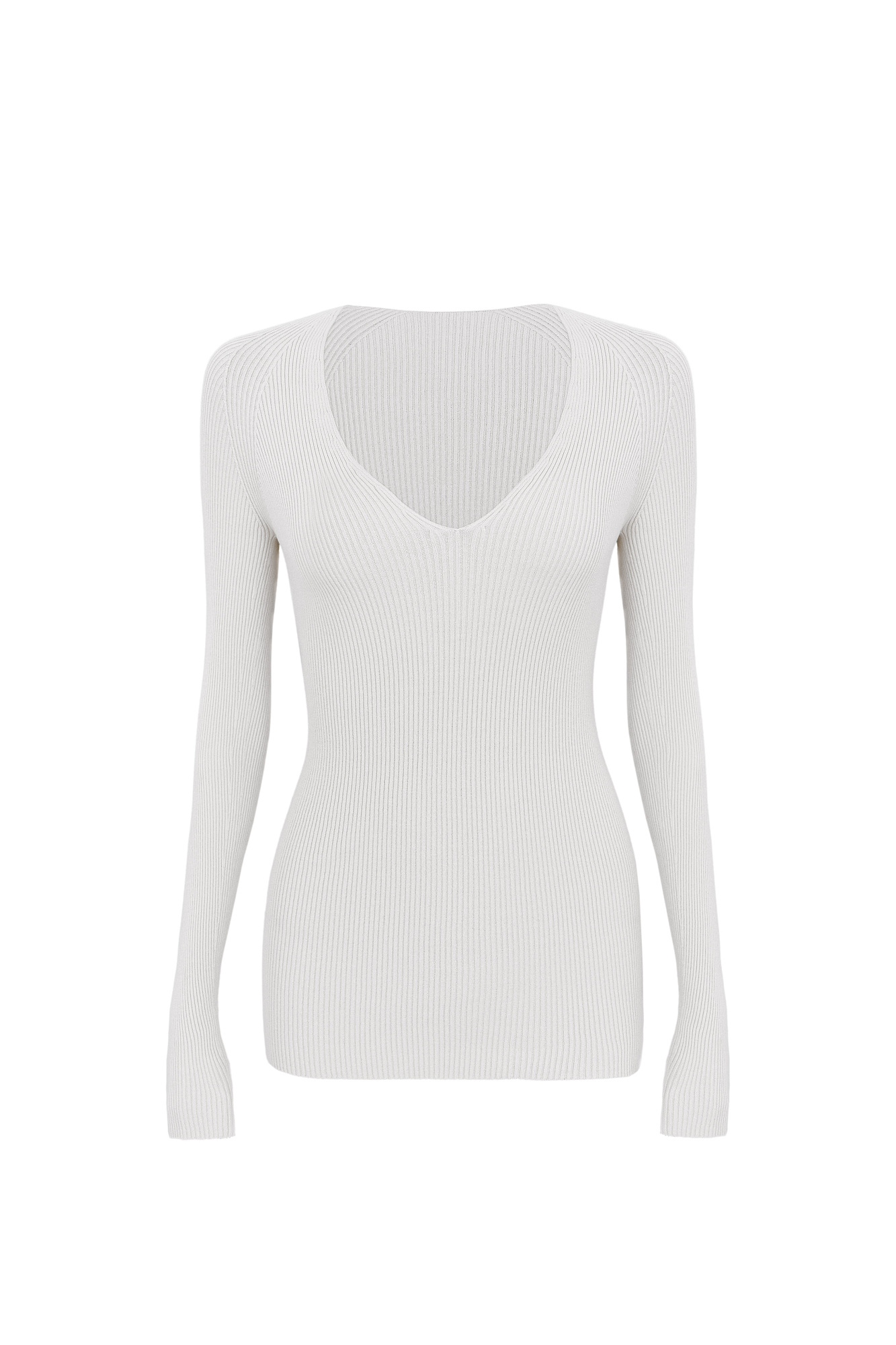 Трикотажный лонгслив из вискозы. Модель приталенного силуэта с глубоким V-образным вырезом. Изделие выполнено в рубчик.