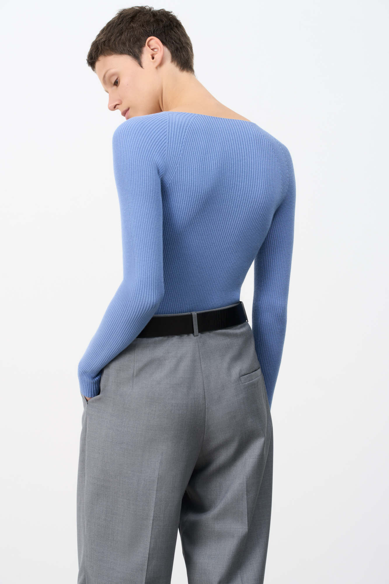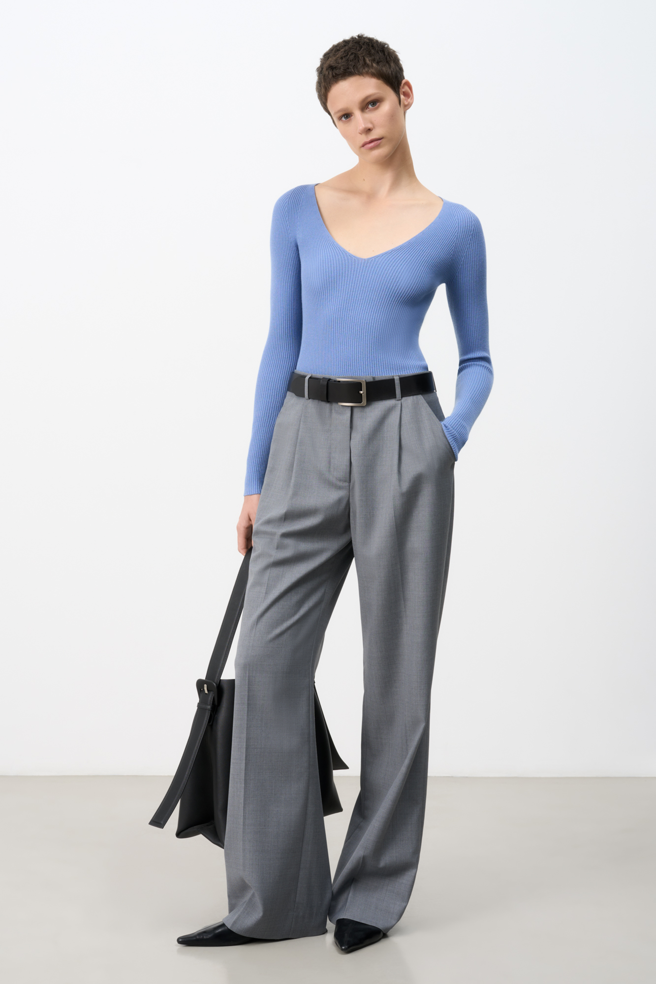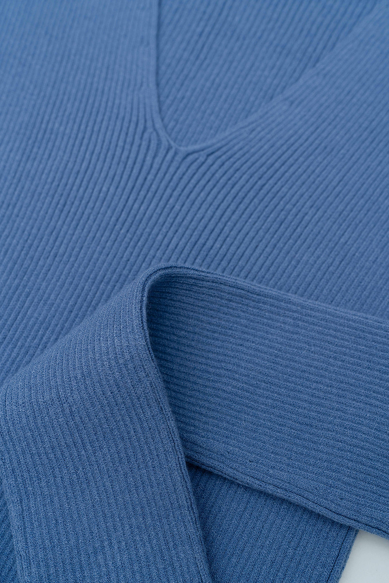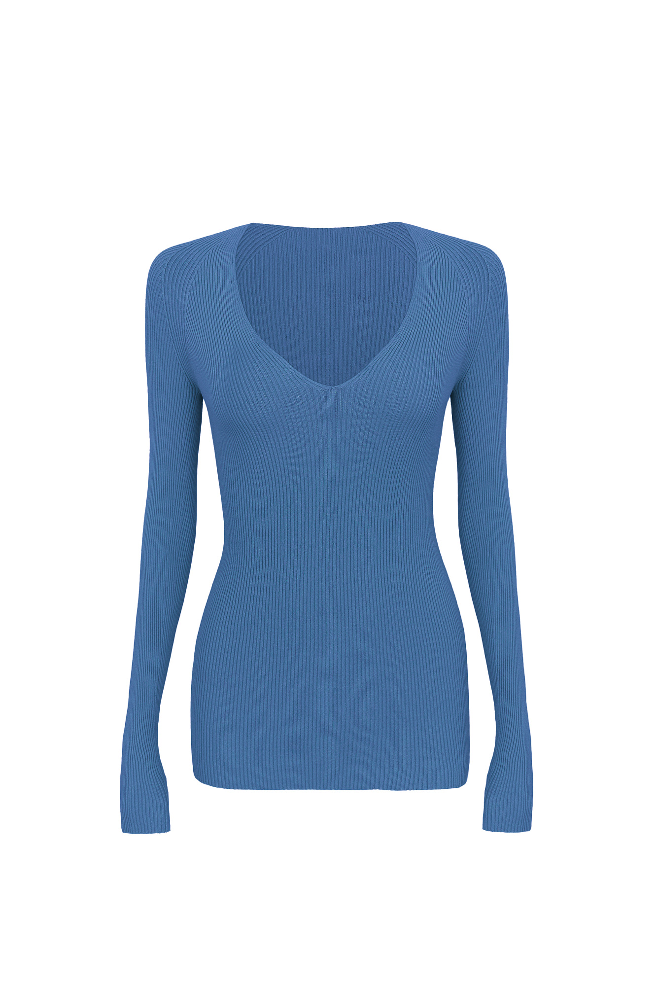 Трикотажный лонгслив из вискозы. Модель приталенного силуэта с глубоким V-образным вырезом. Изделие выполнено в рубчик.