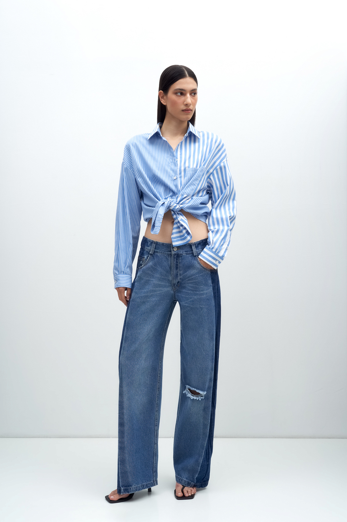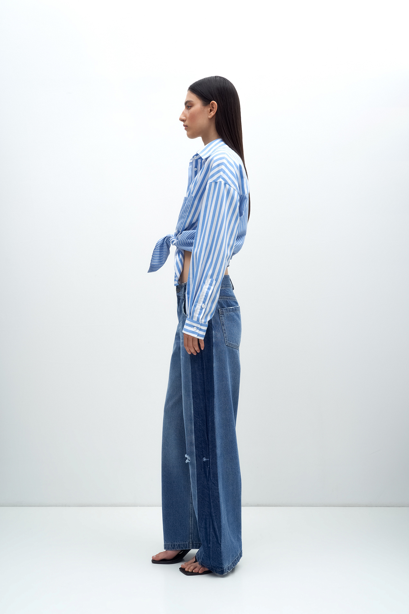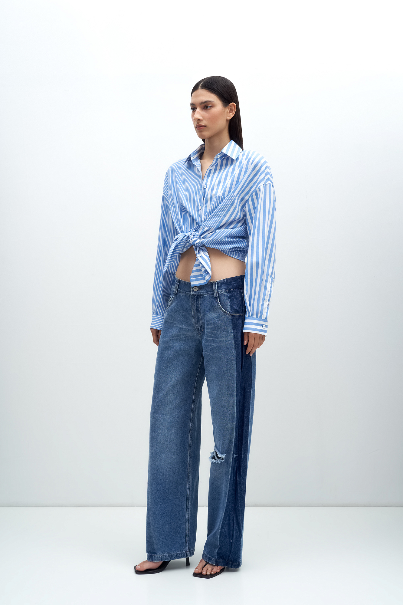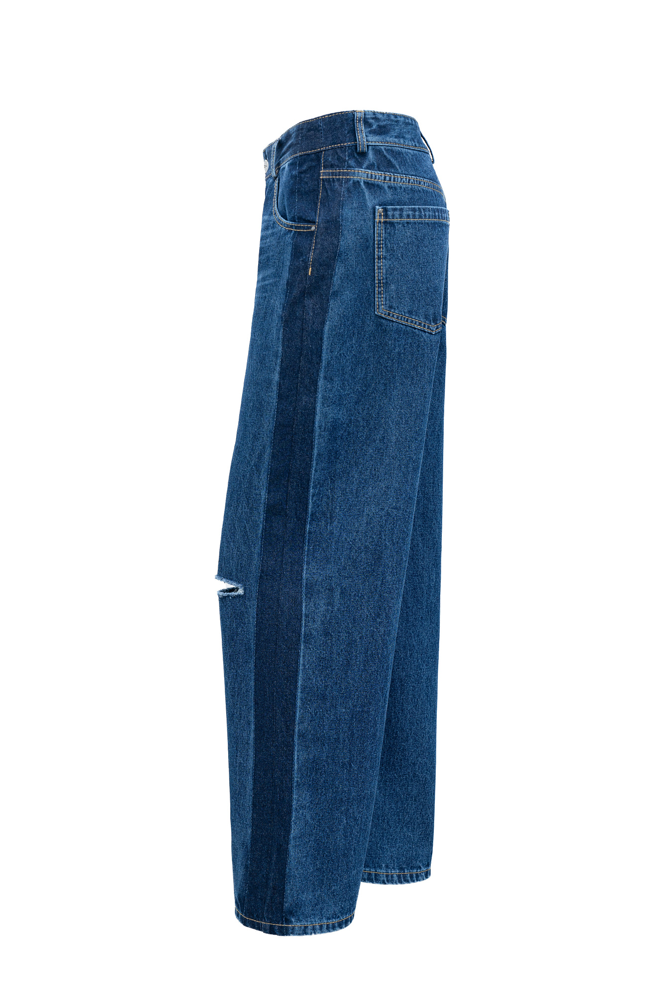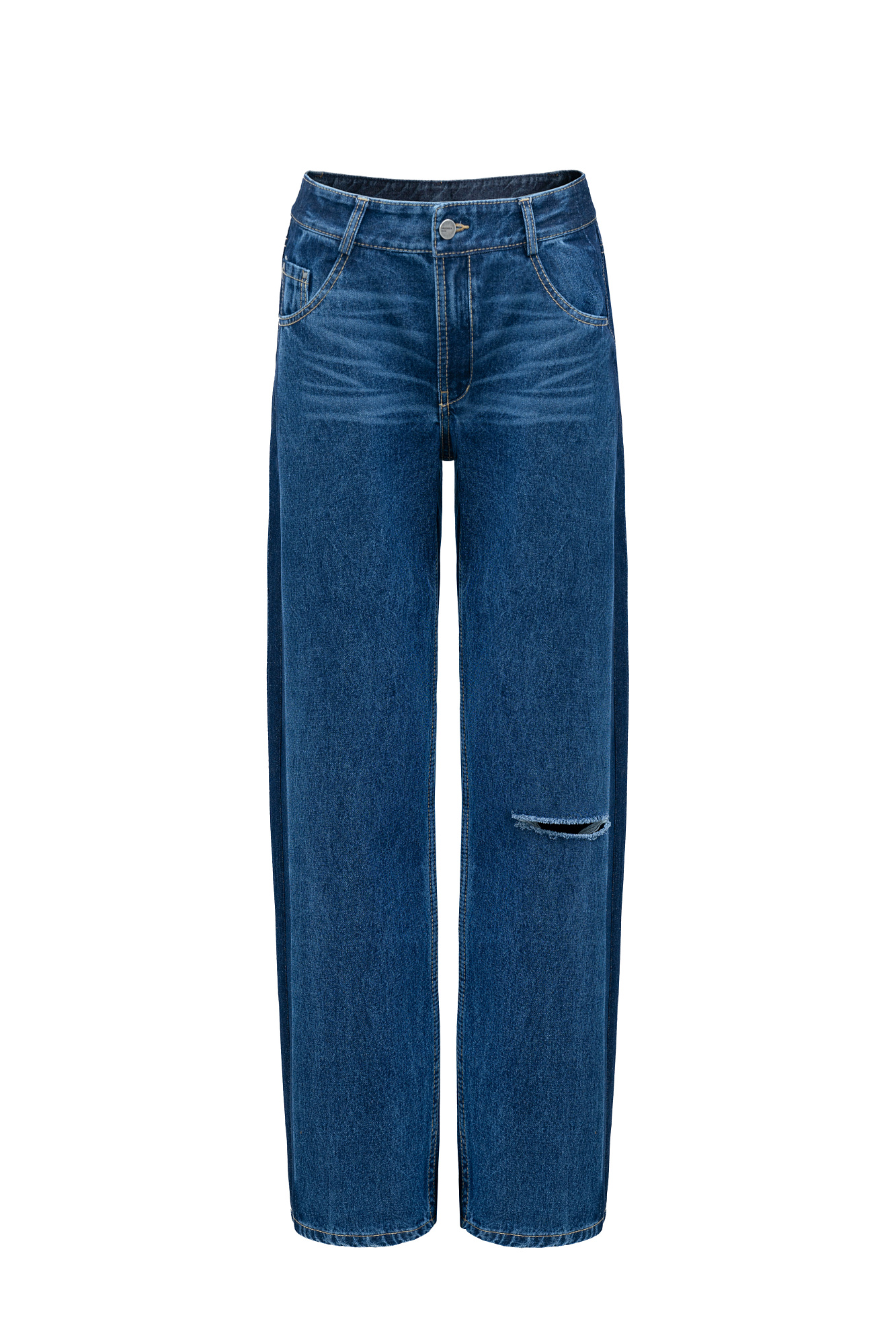 Джинсы из 100% хлопка с низкой посадкой. Модель прямого силуэта с разрезом на ноге и широким лампасом. Застежка на молнию и пуговицу.