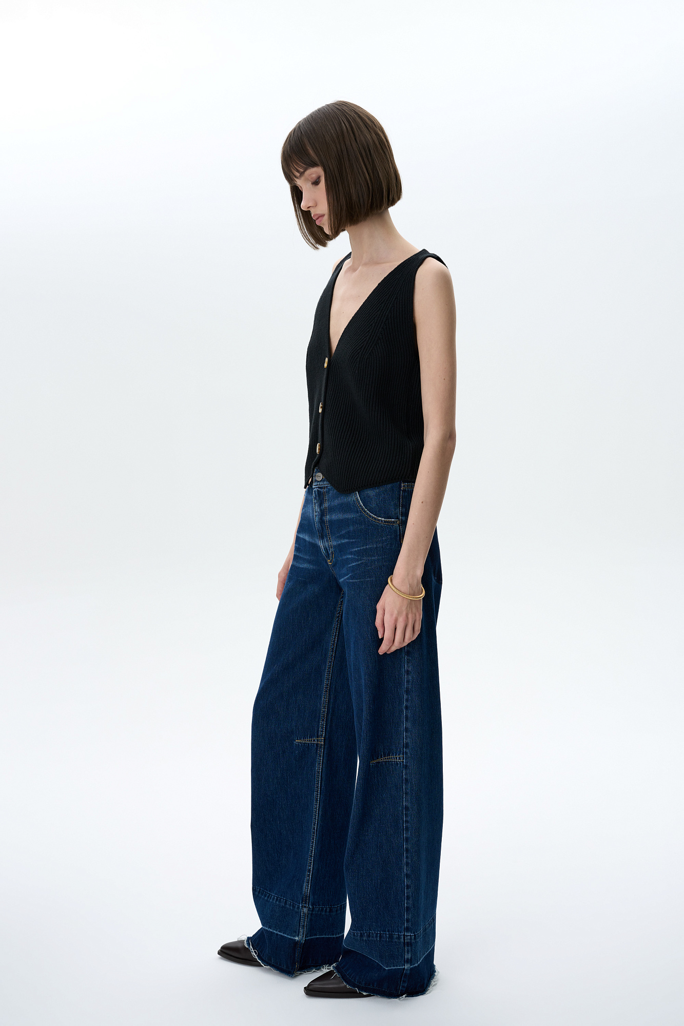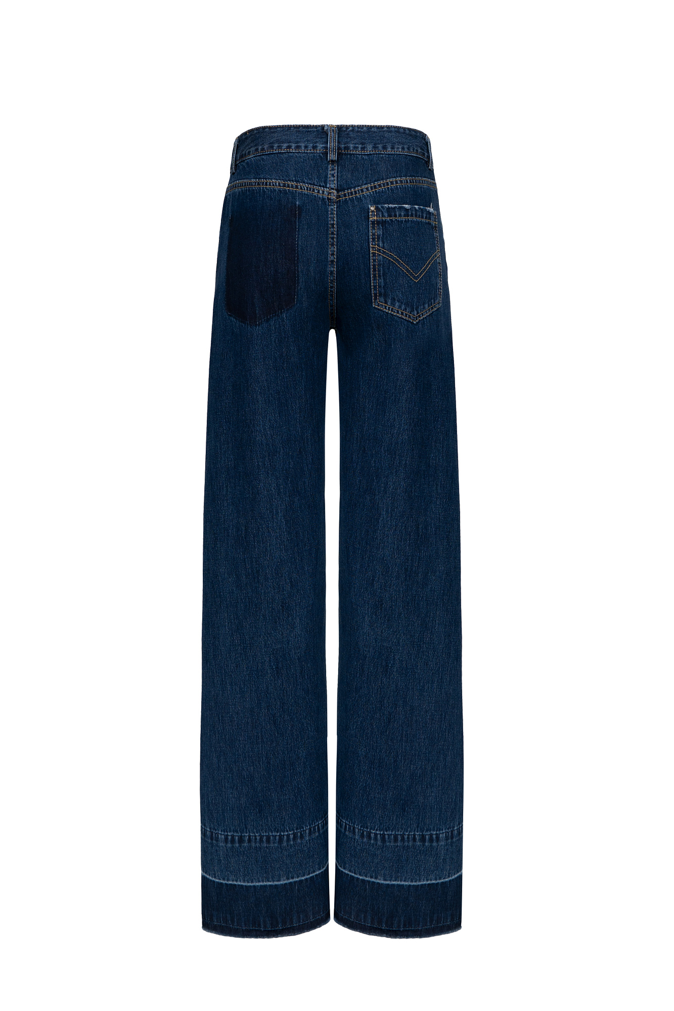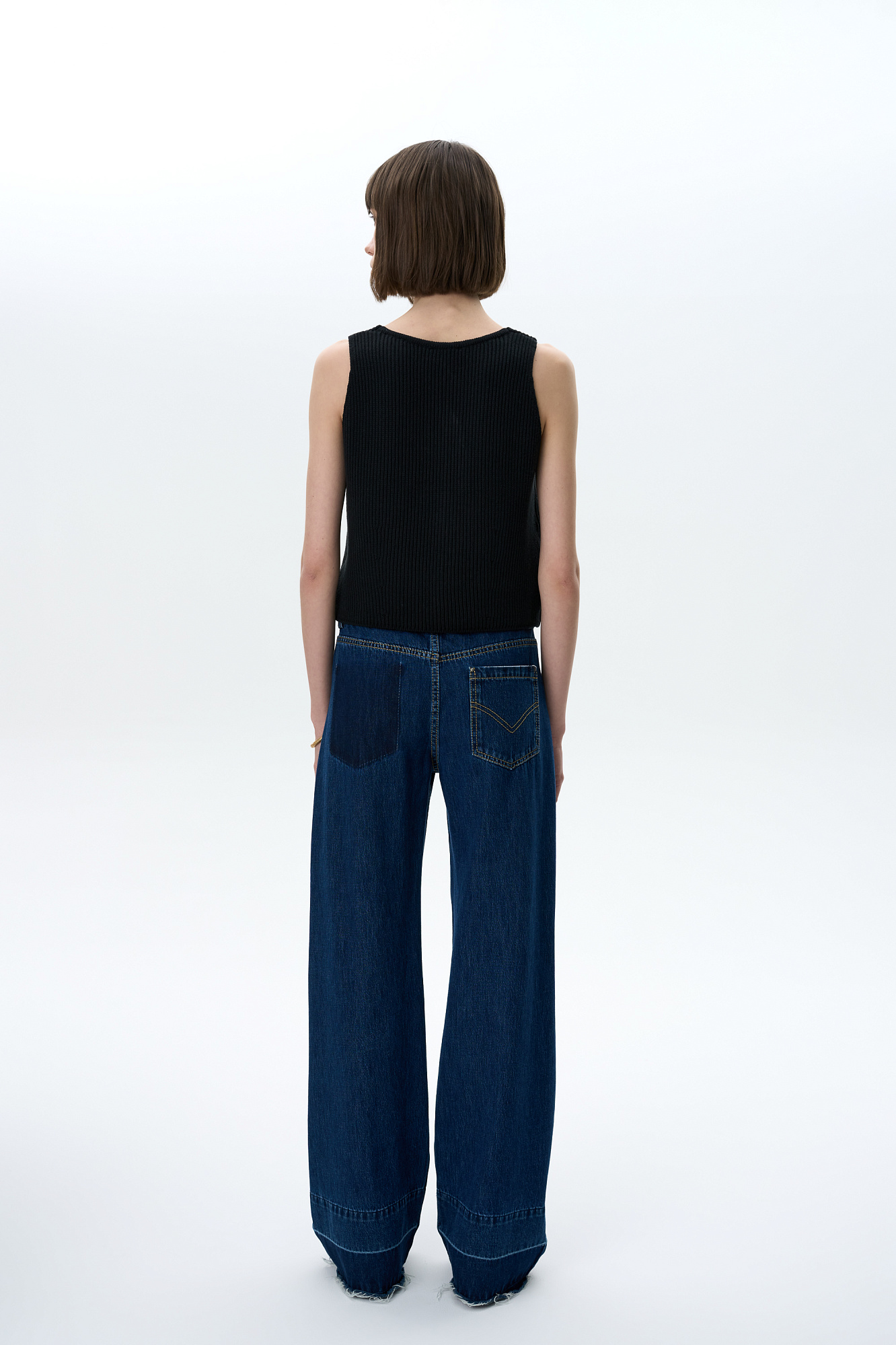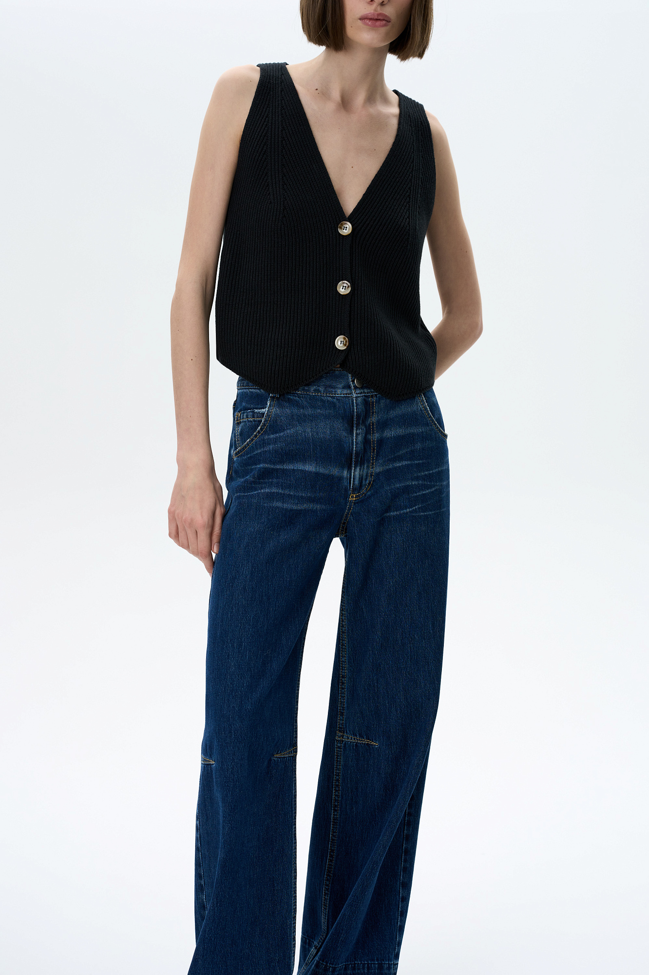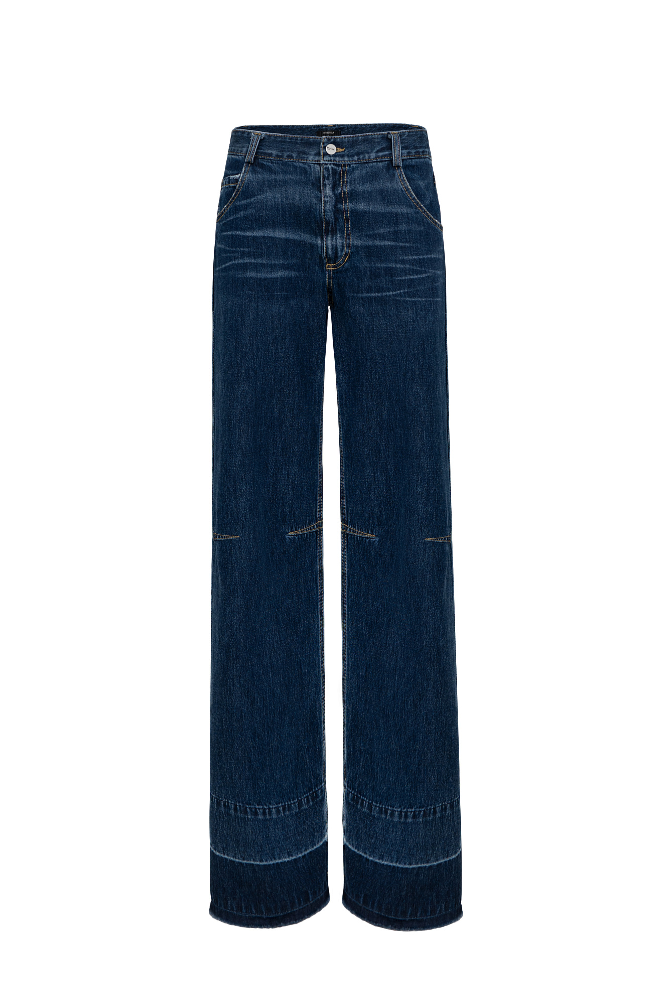 Прямые джинсы со средней посадкой с потертостями и контрастной отстрочкой. Потайная застежка на молнию и пуговицу. Необработанный низ. Четыре кармана.