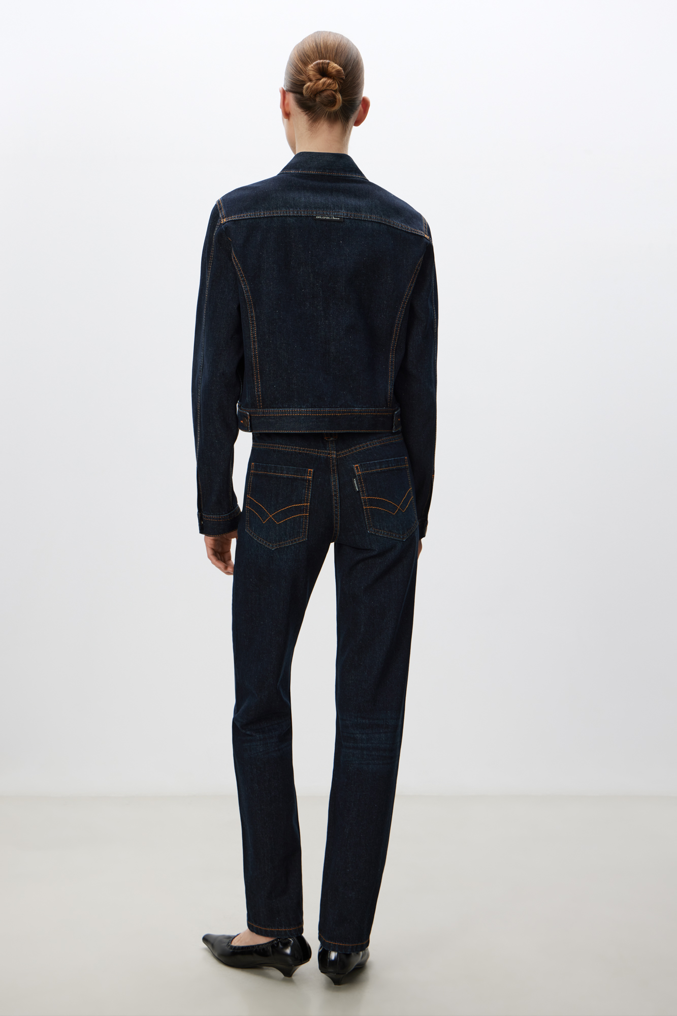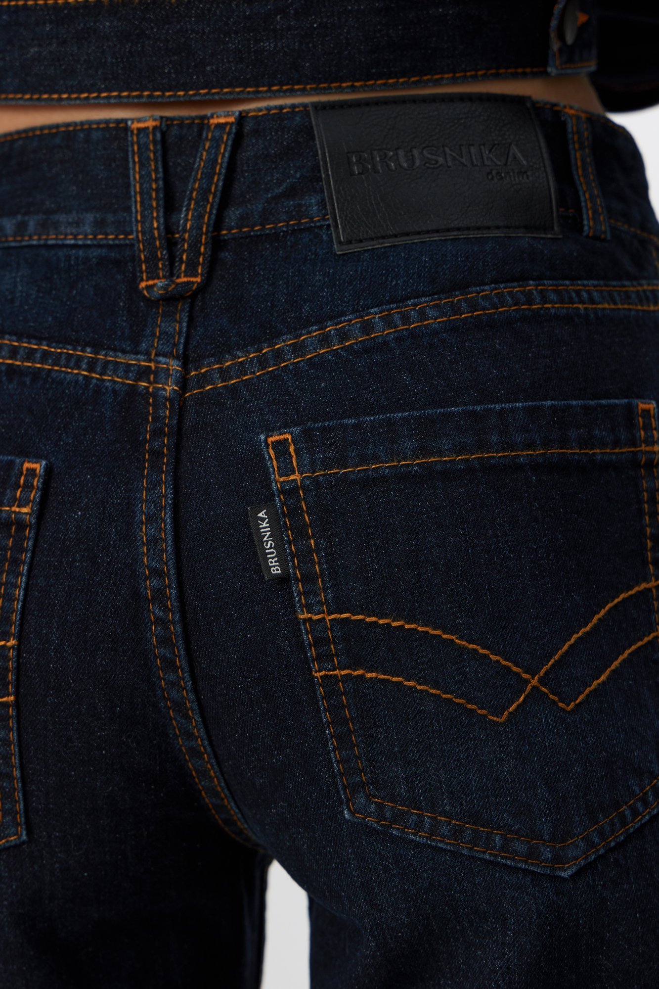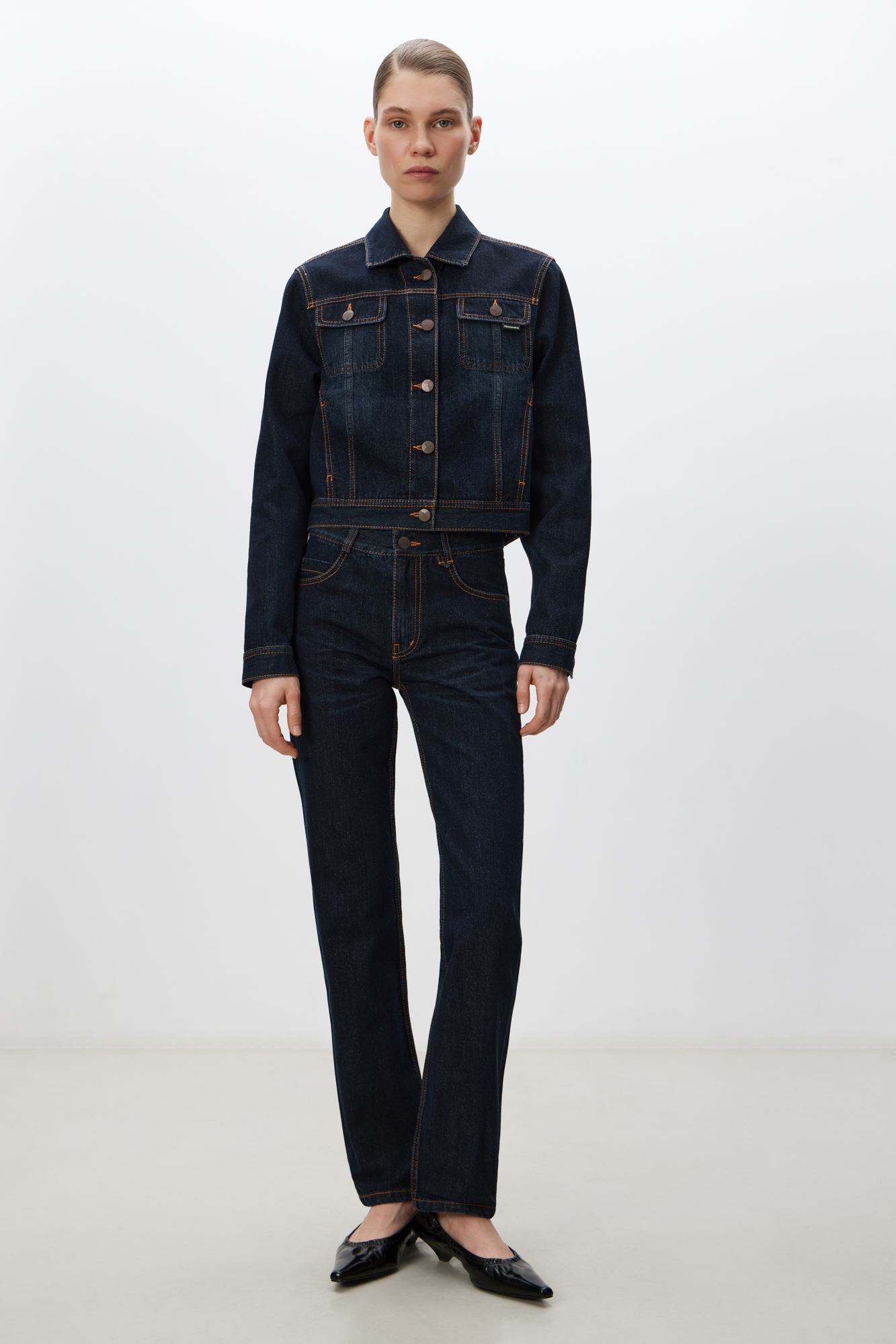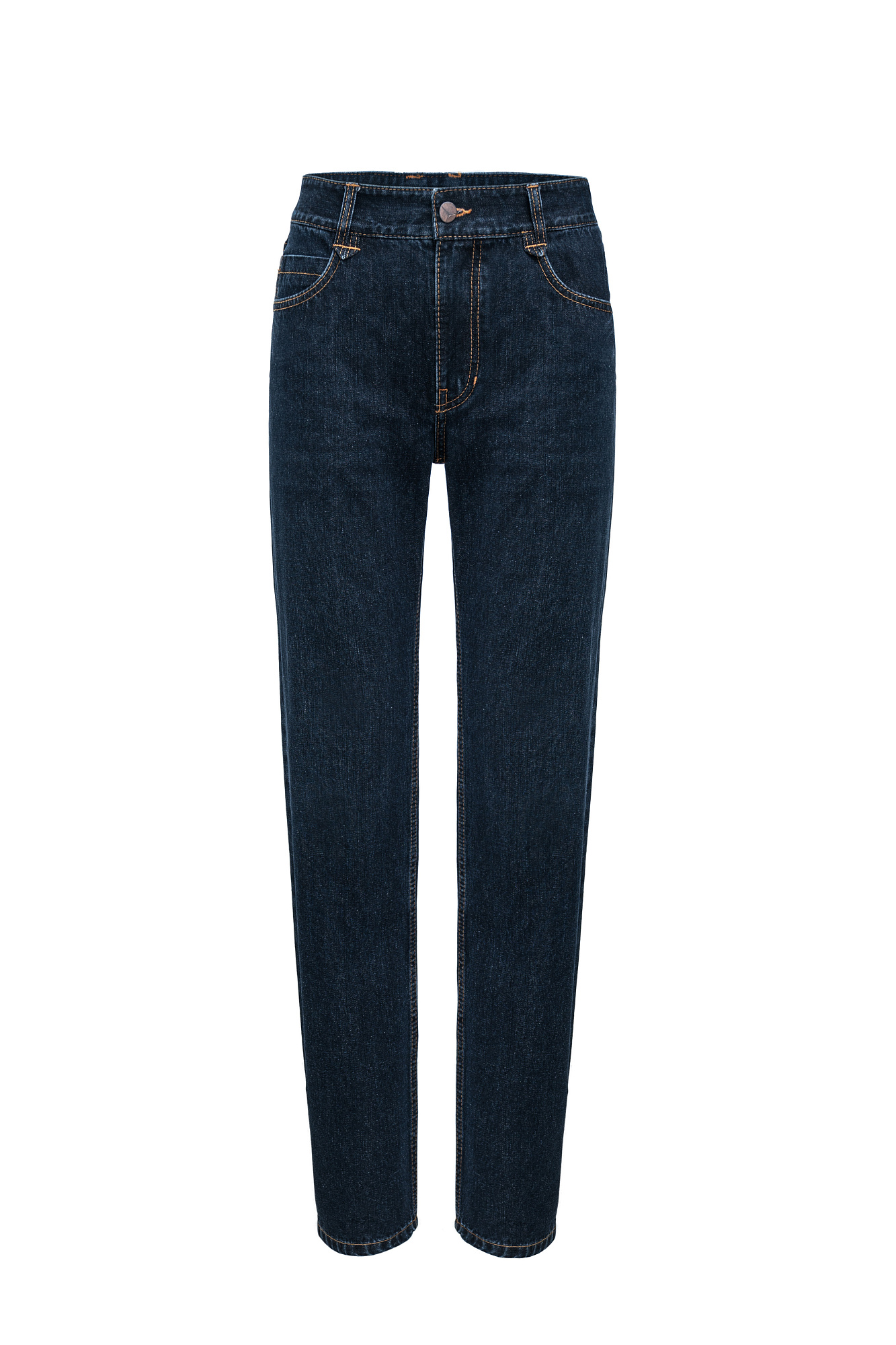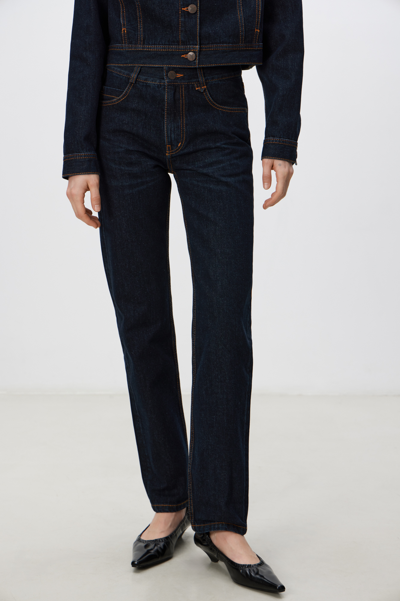 Джинсы облегающего кроя с контрастной строчкой терракотового цвета. Модель со средней посадкой и пятью карманами. Застежка на молнию и металлическую пуговицу.
