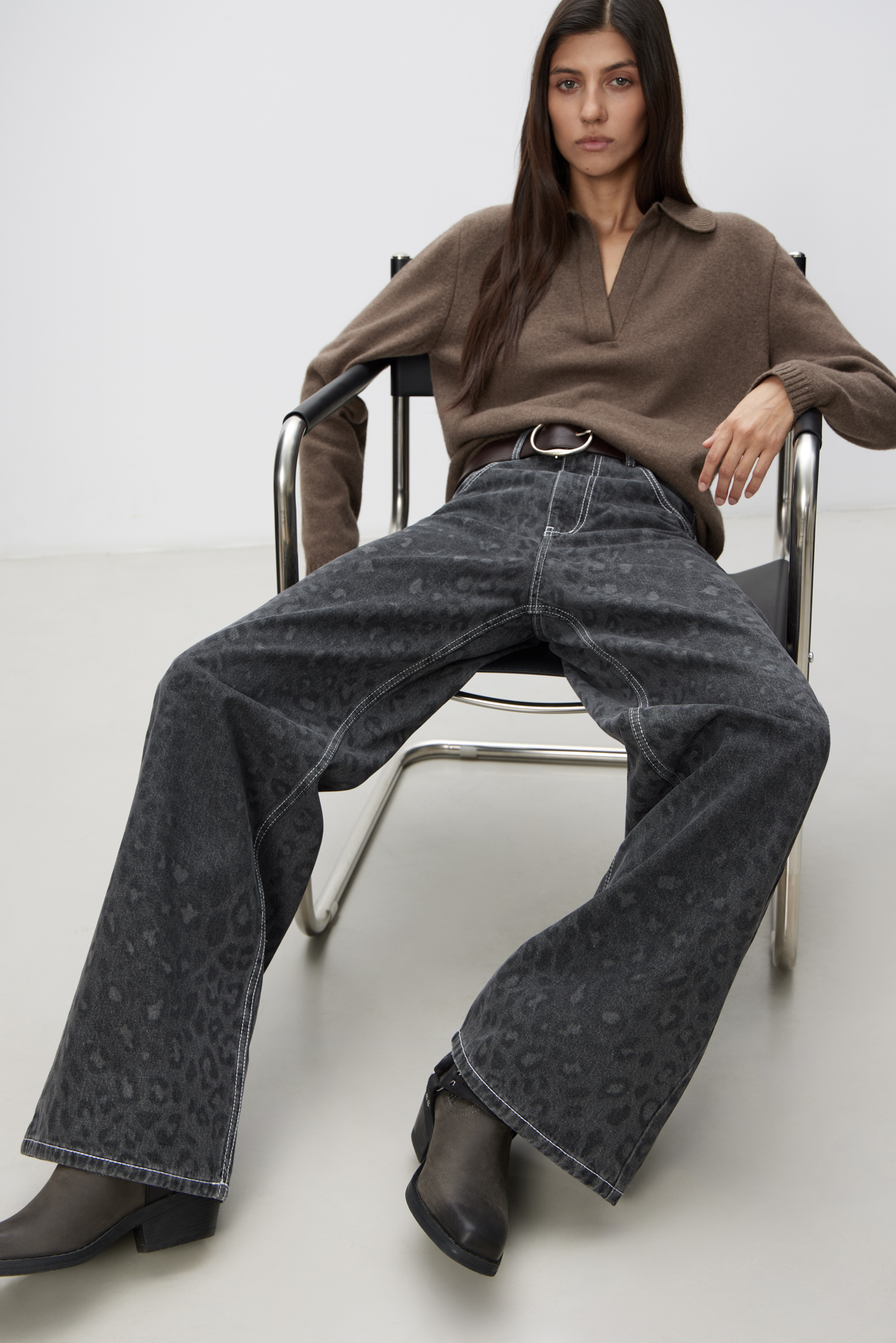 Джинсы с анималистичным принтом. Модель прямого силуэта со средней посадкой, пять карманов. Застежка на молнию и пуговицу.