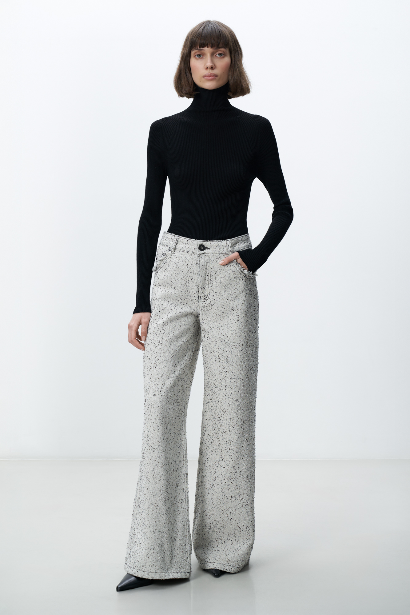 Прямые джинсы из 100% хлопка в крапинку. Модель со средней посадкой. Застежка на металлическую пуговицу и молнию, пять карманов. Изделие декорировано бахромой на карманах. Дополнить образ можно жакетом в таком же стиле.