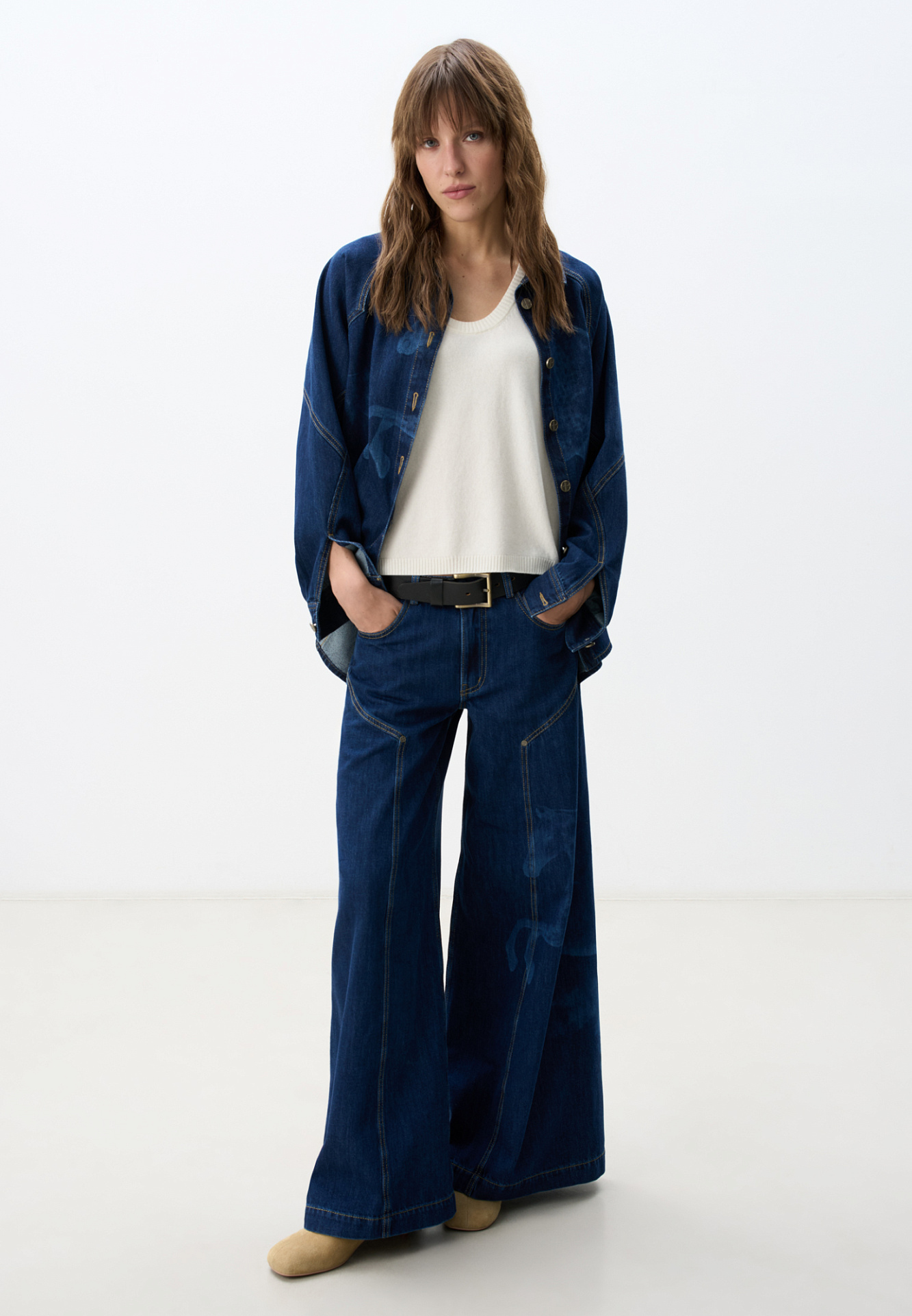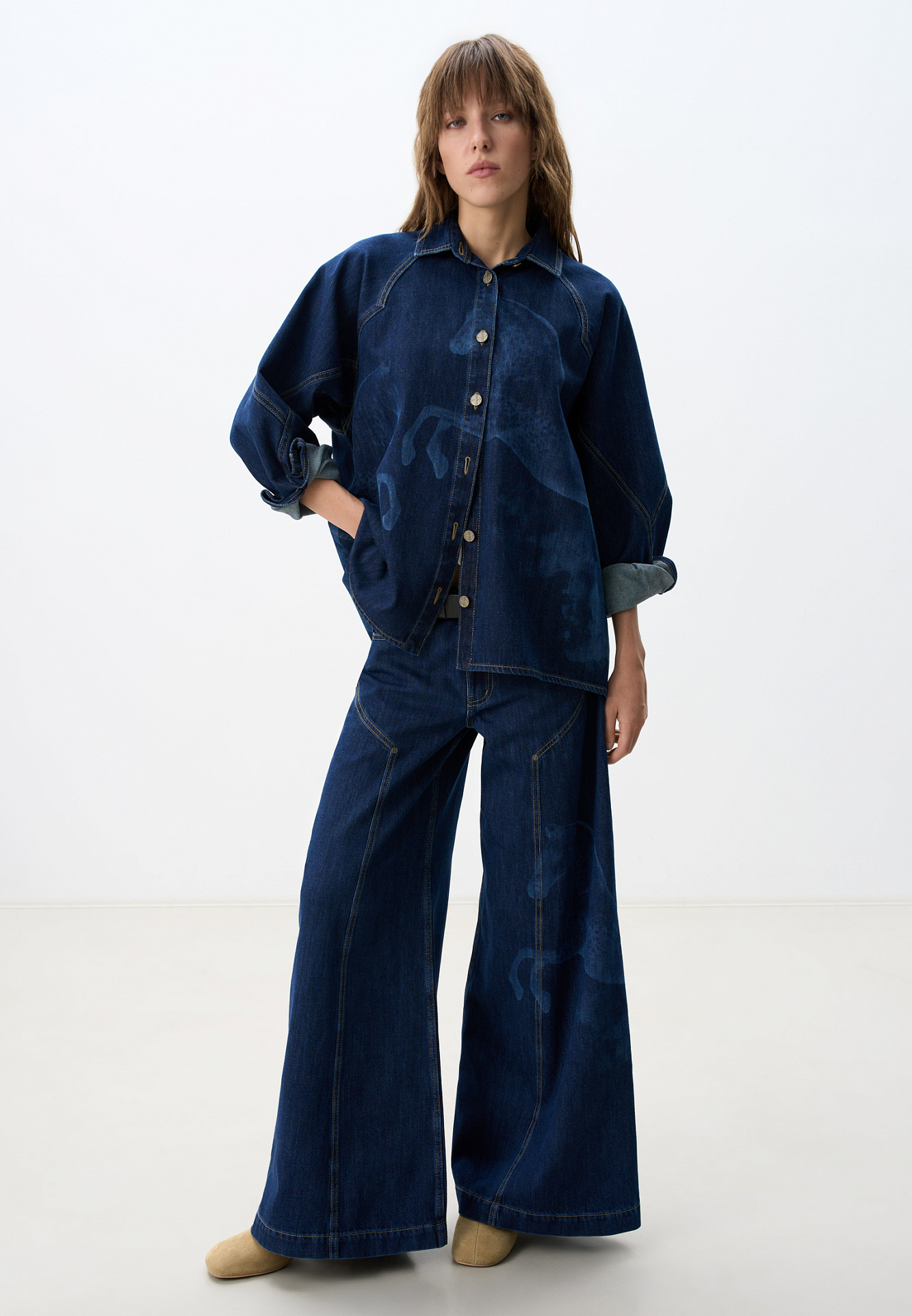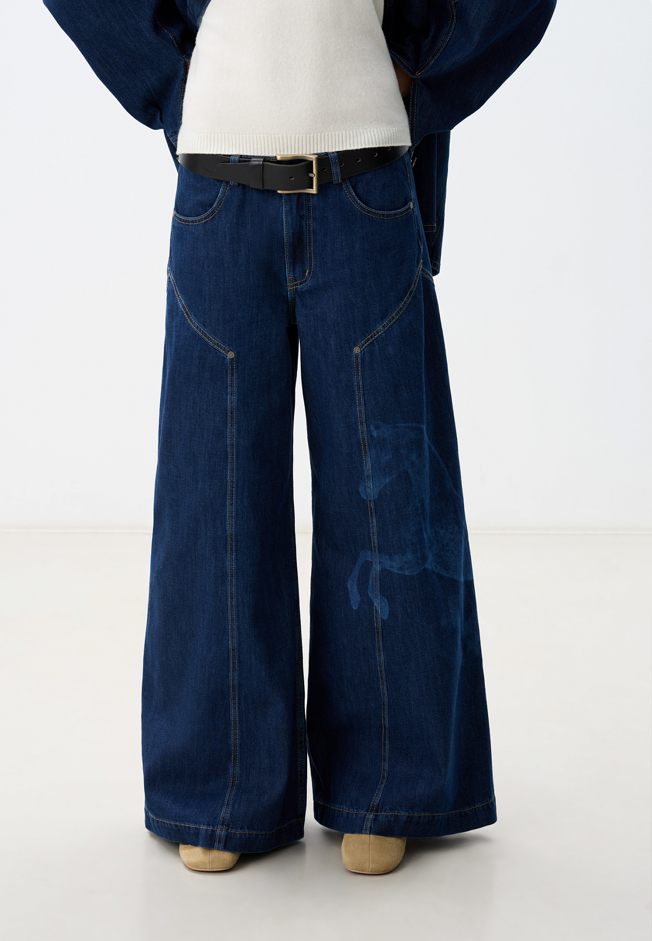 Широкие джинсы из 100% хлопка с принтом лошадей. Модель на средней посадке, с пятью карманами и шлевками на поясе для ремня. Застежка на молнию и пуговицу. На штанинах изделие декорировано принтом лошадей, выполненным лазером, и объемными геометрическими вытачками с заклепками.