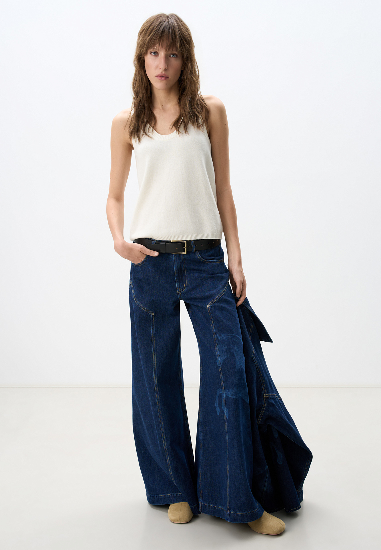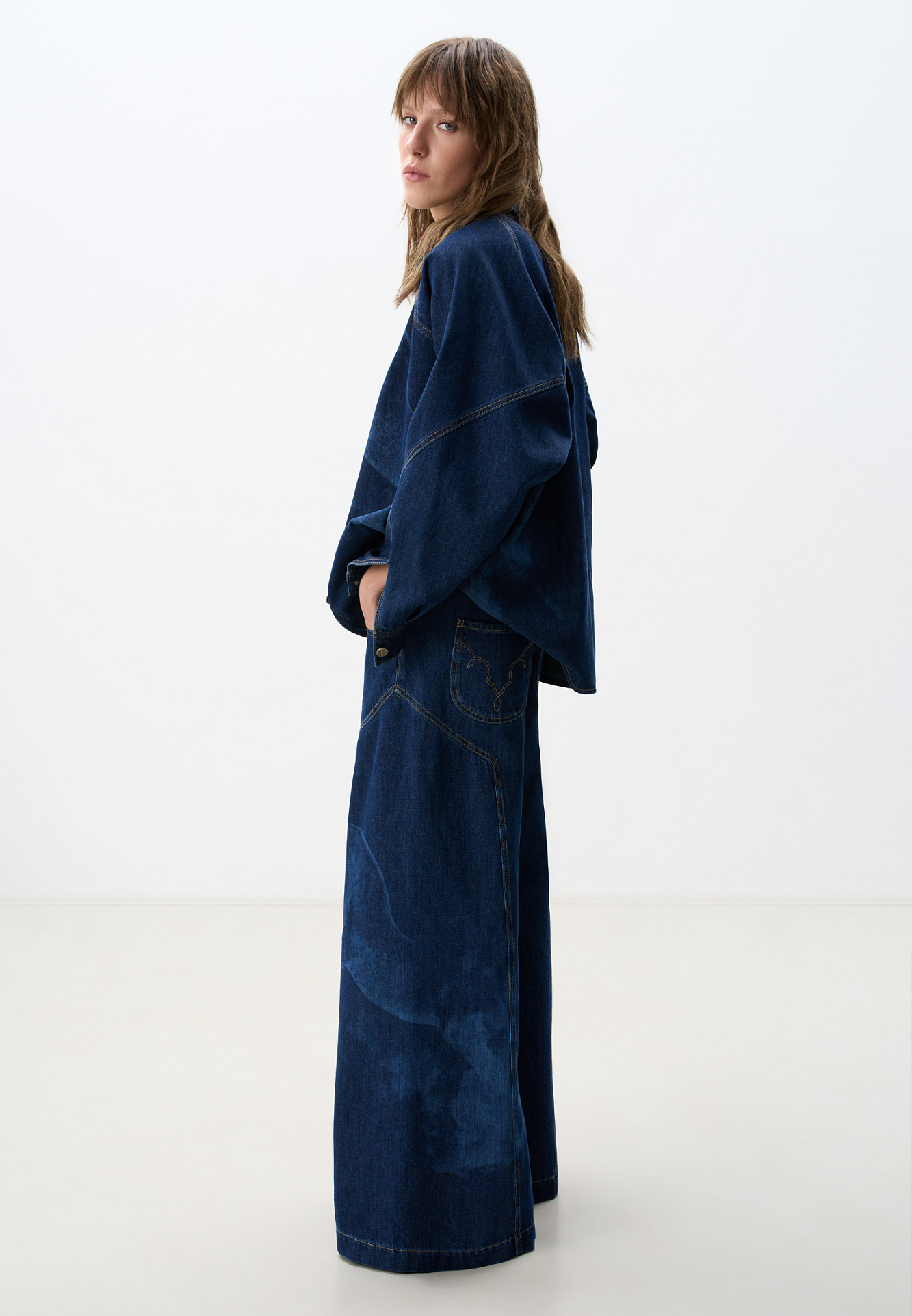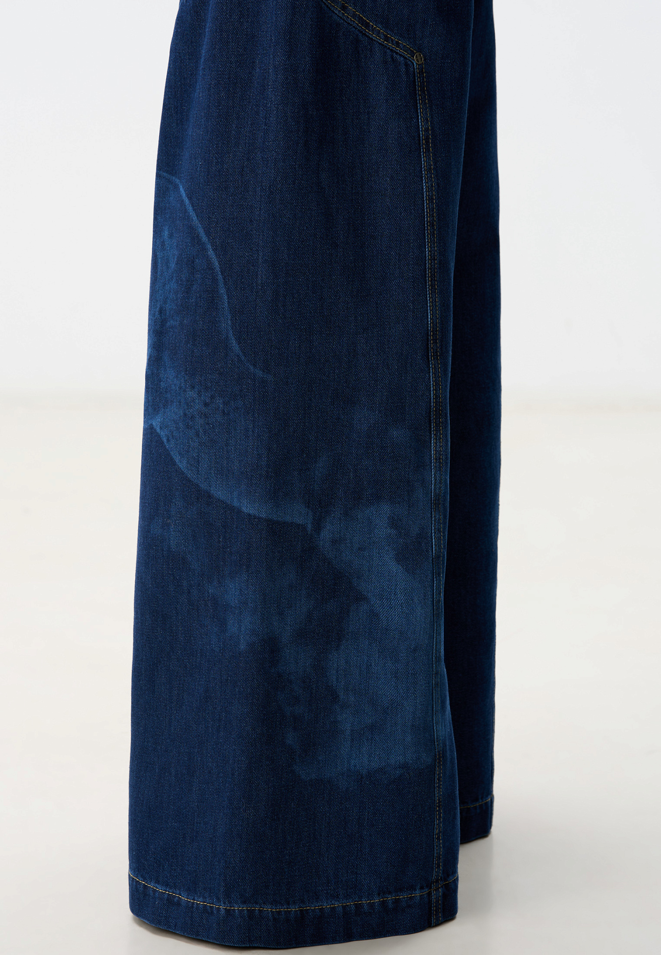 Широкие джинсы из 100% хлопка с принтом лошадей. Модель на средней посадке, с пятью карманами и шлевками на поясе для ремня. Застежка на молнию и пуговицу. На штанинах изделие декорировано принтом лошадей, выполненным лазером, и объемными геометрическими вытачками с заклепками.