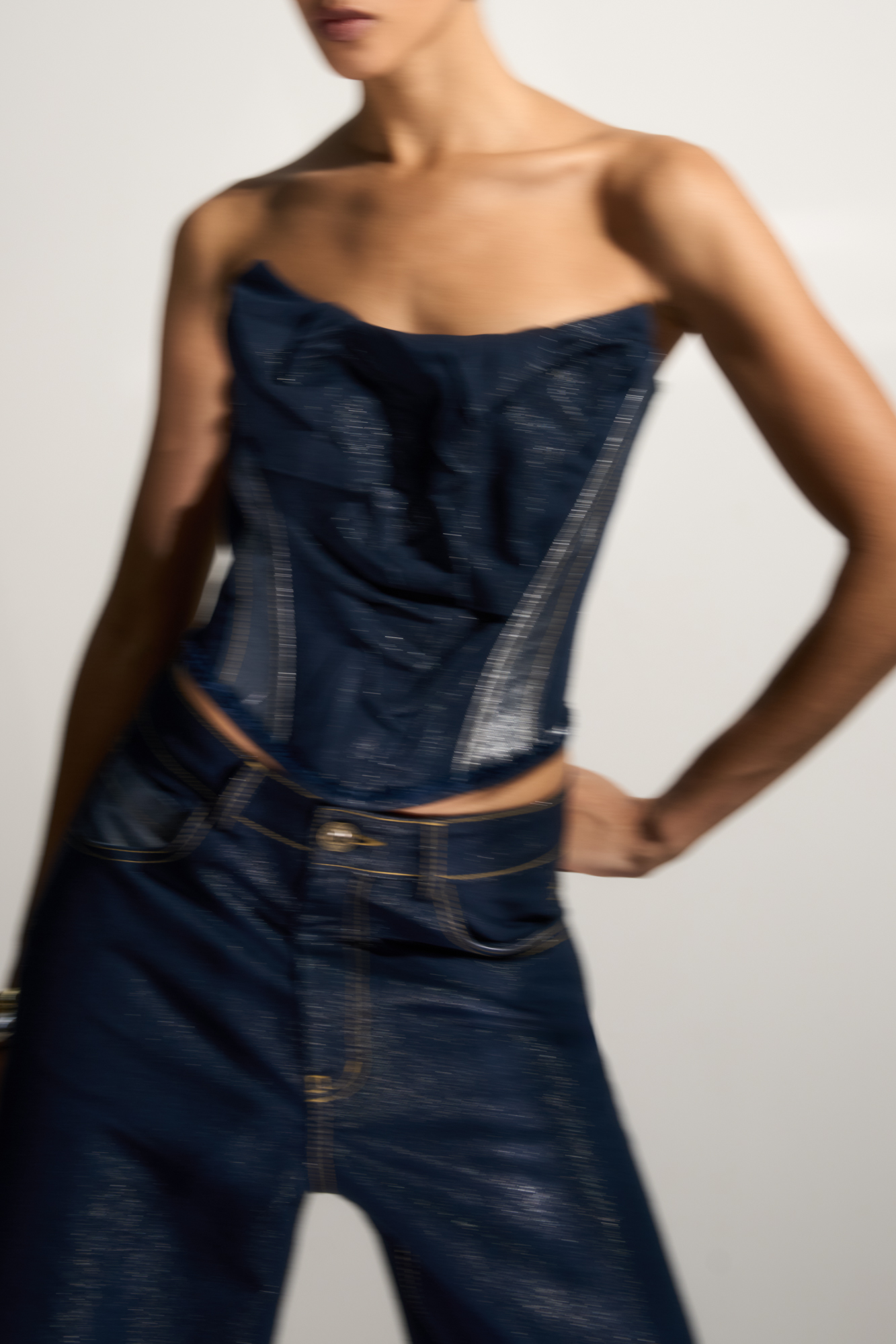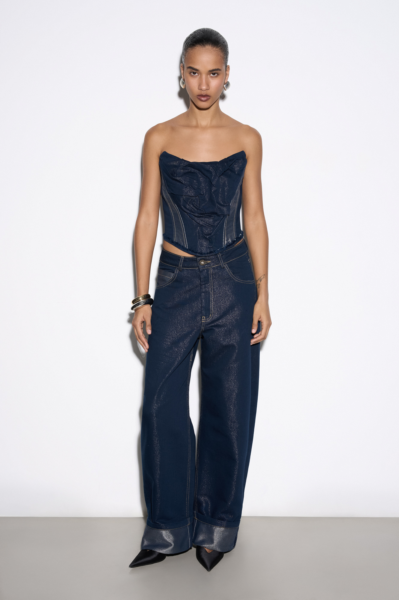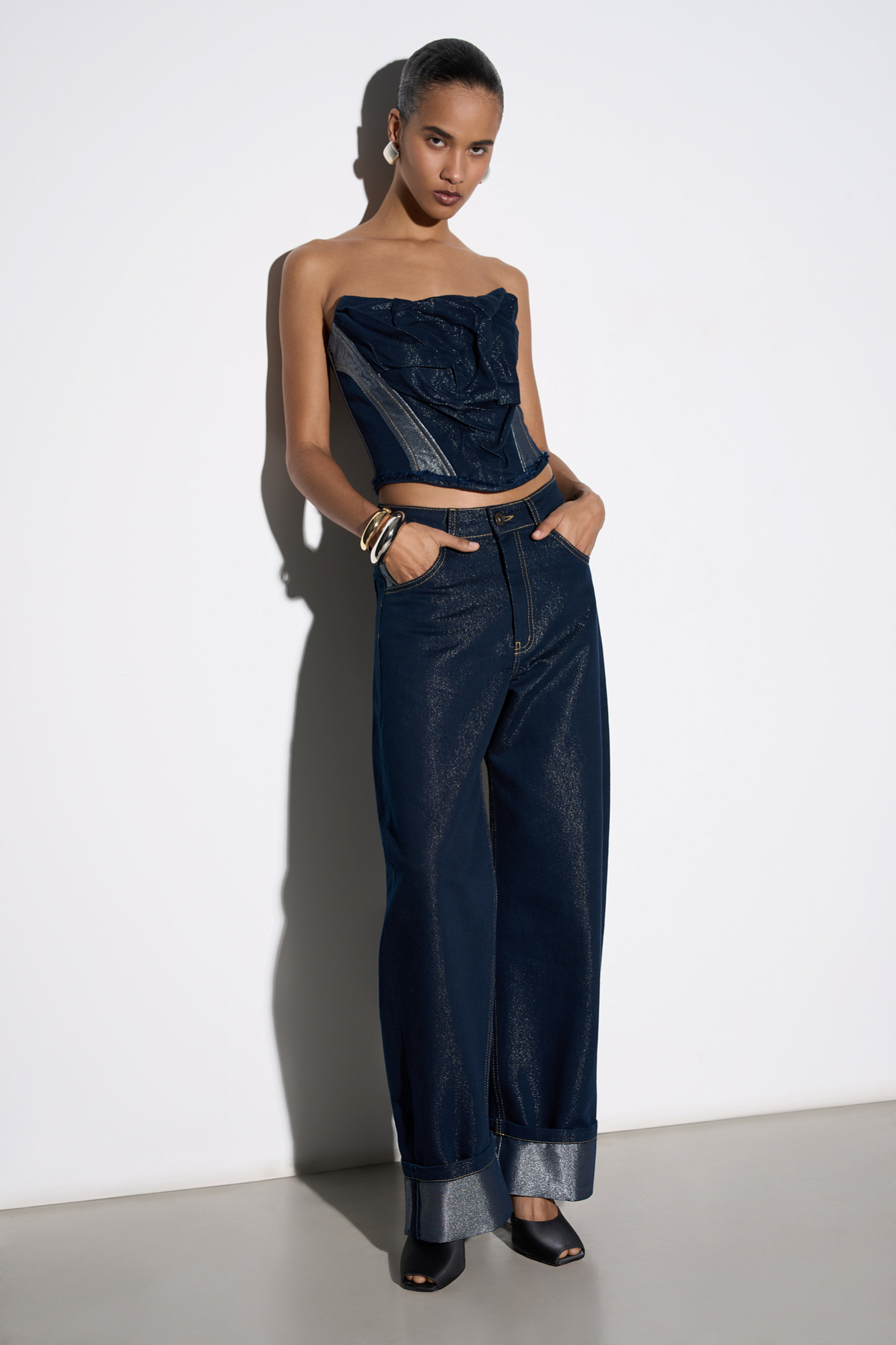 Джинсы relaxed fit из хлопка с добавлением металлизированной нити. Модель с пятью карманами, шлевками на поясе для ремня и застежкой на молнию и кнопку. Изделие декорировано высокими подворотами.