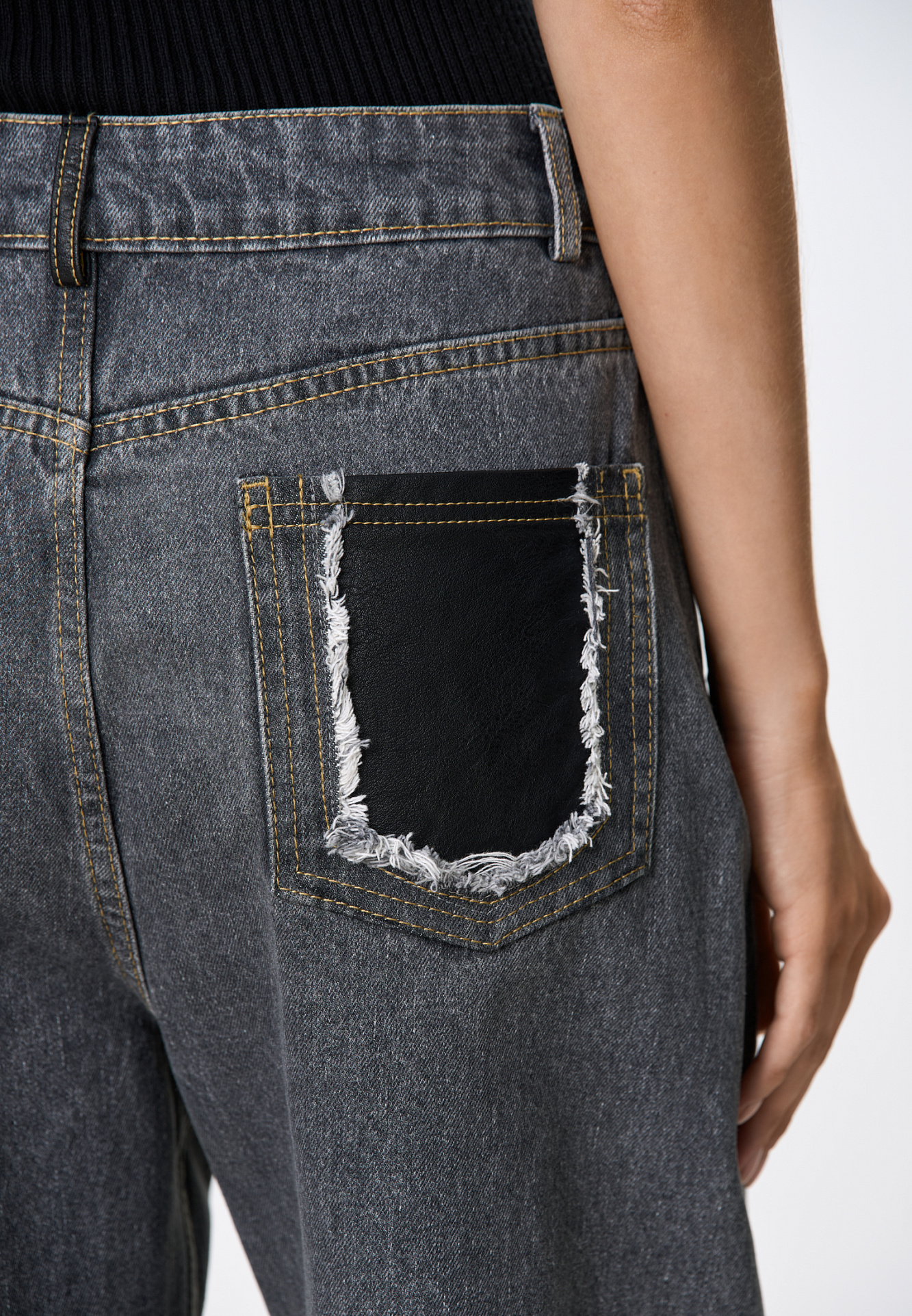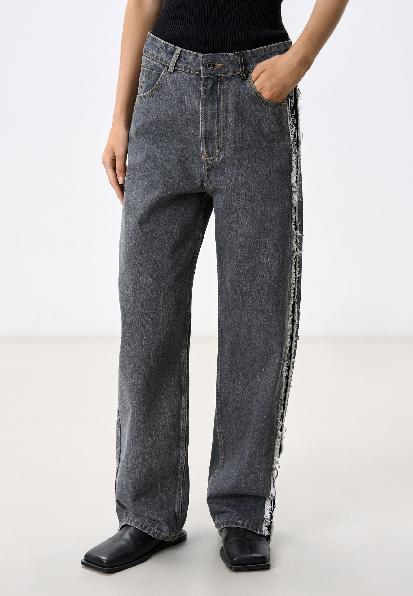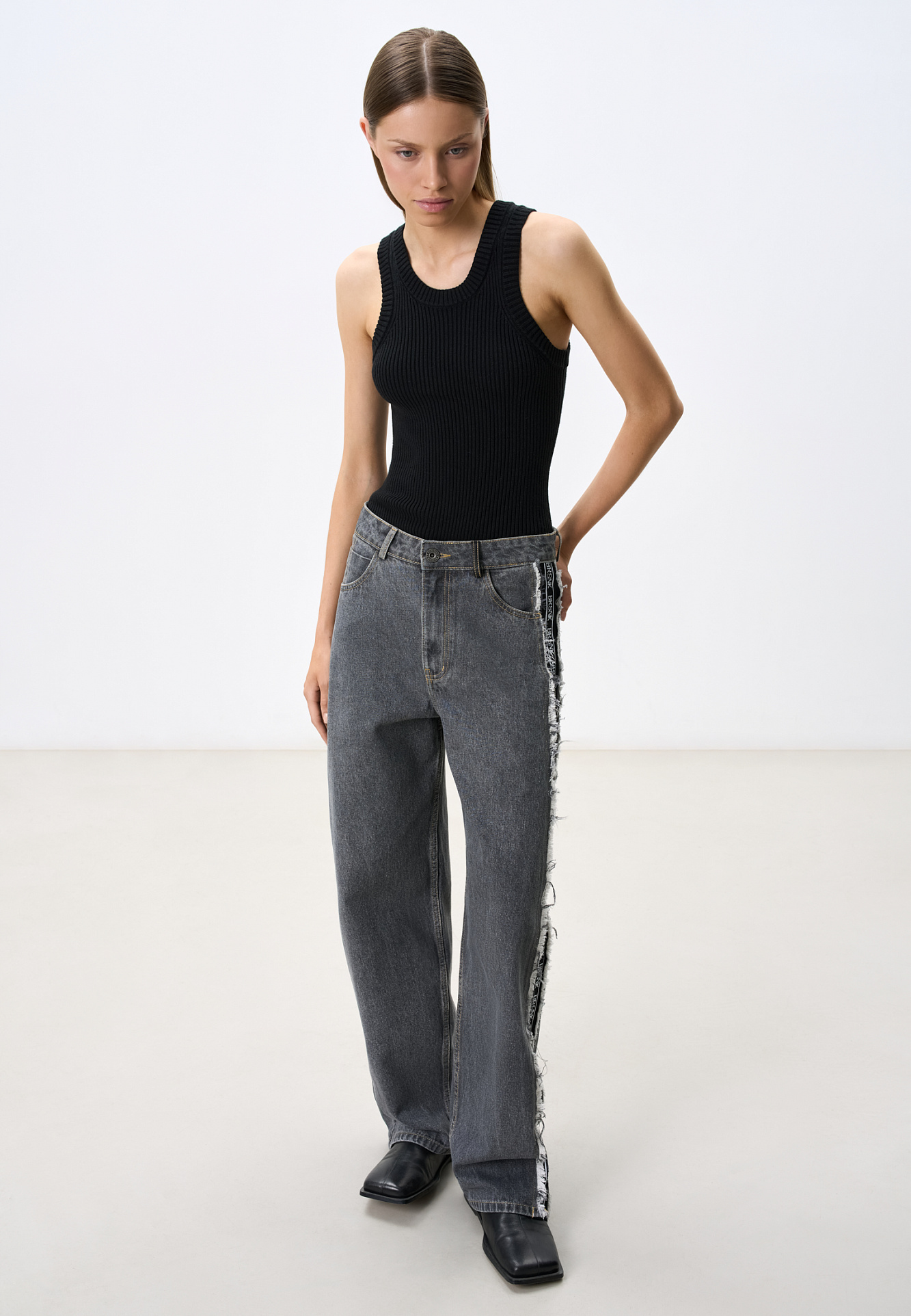 Джинсы из хлопка с деталями из экокожи и трикотажным лампасом. Модель прямого силуэта, с боковыми карманами, шлевками из джинсы и экокожи на поясе для ремня. Застежка на молнию и пуговицу. Изделие декорировано рваной текстурой.