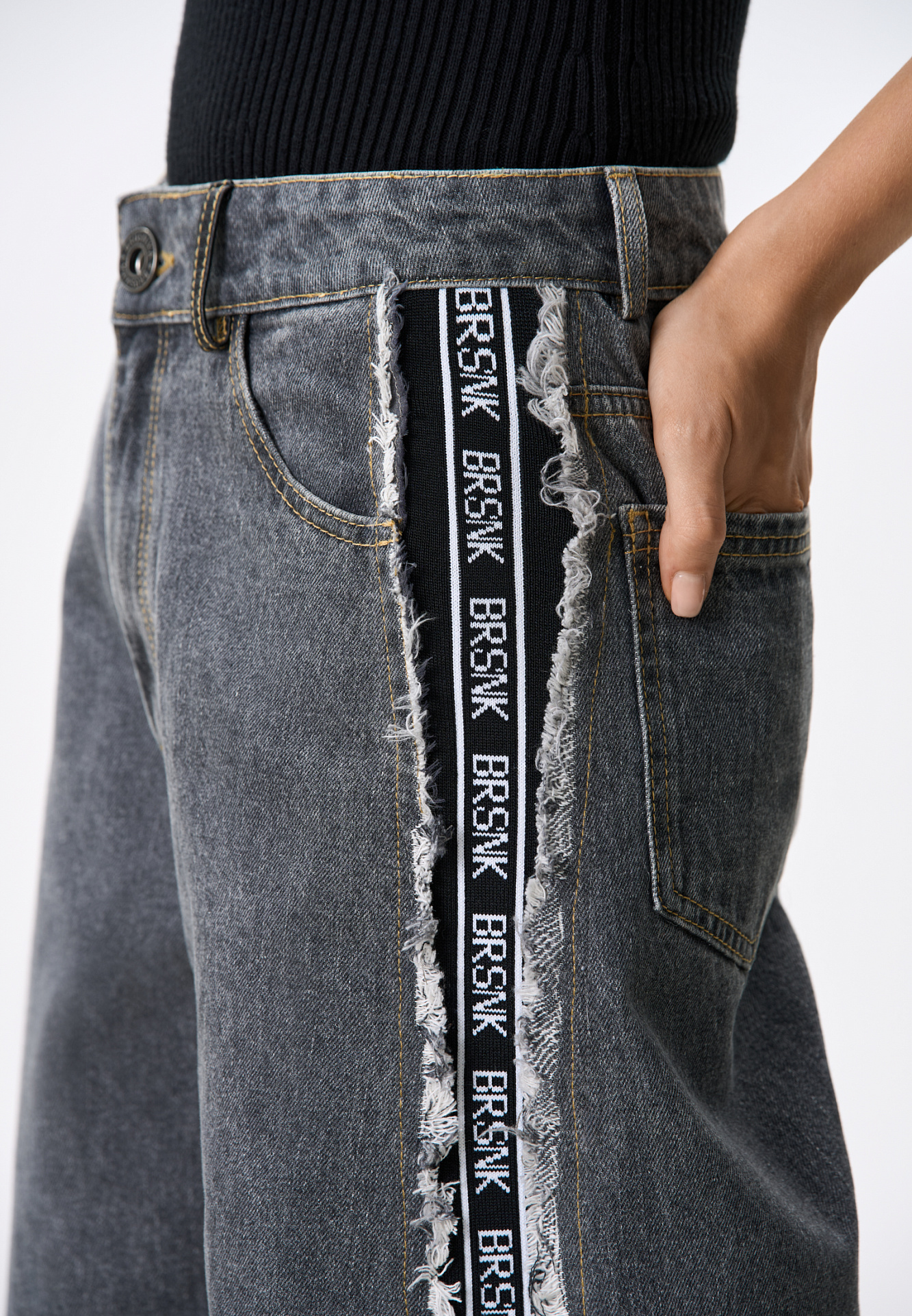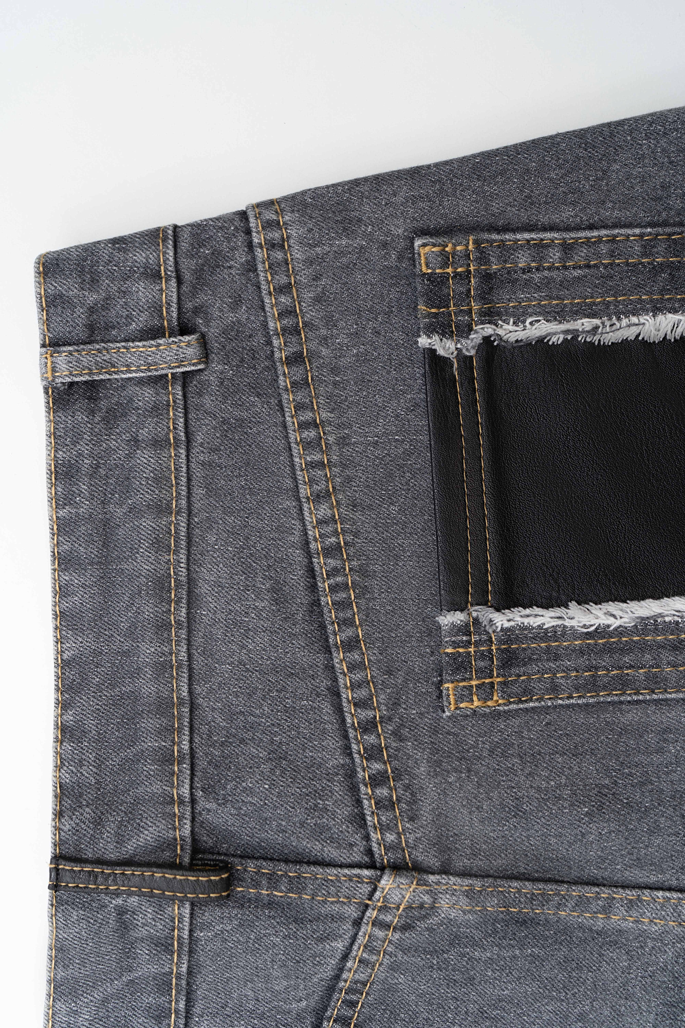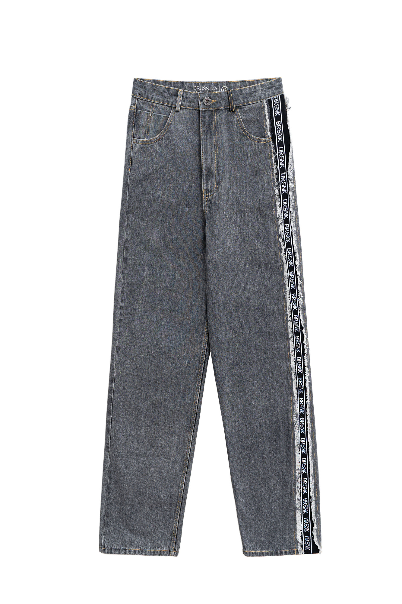 Джинсы из хлопка с деталями из экокожи и трикотажным лампасом. Модель прямого силуэта, с боковыми карманами, шлевками из джинсы и экокожи на поясе для ремня. Застежка на молнию и пуговицу. Изделие декорировано рваной текстурой.