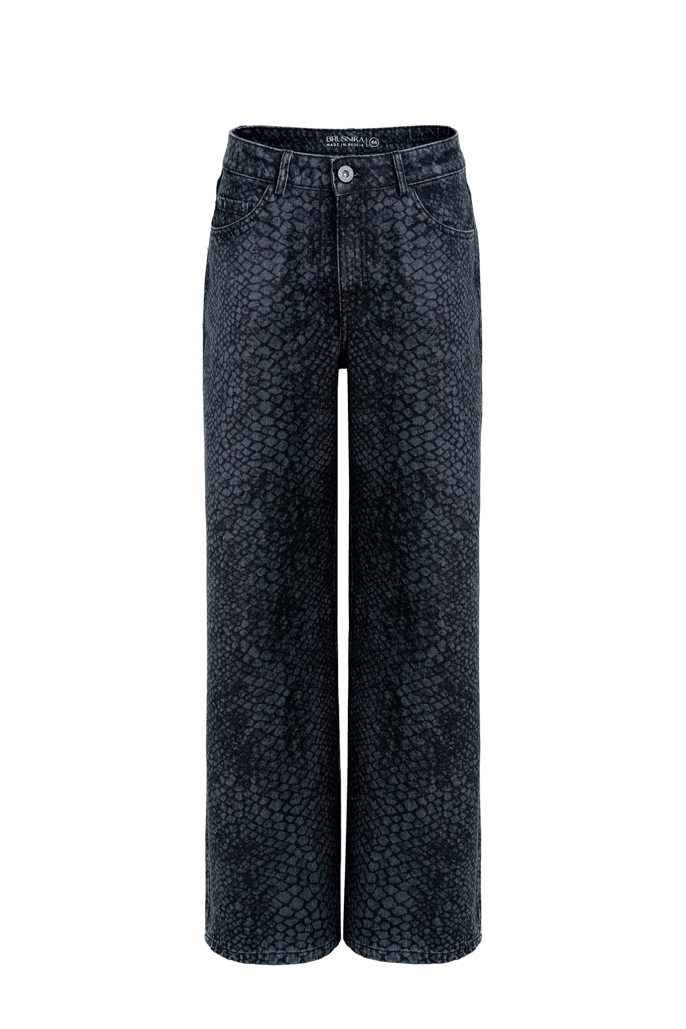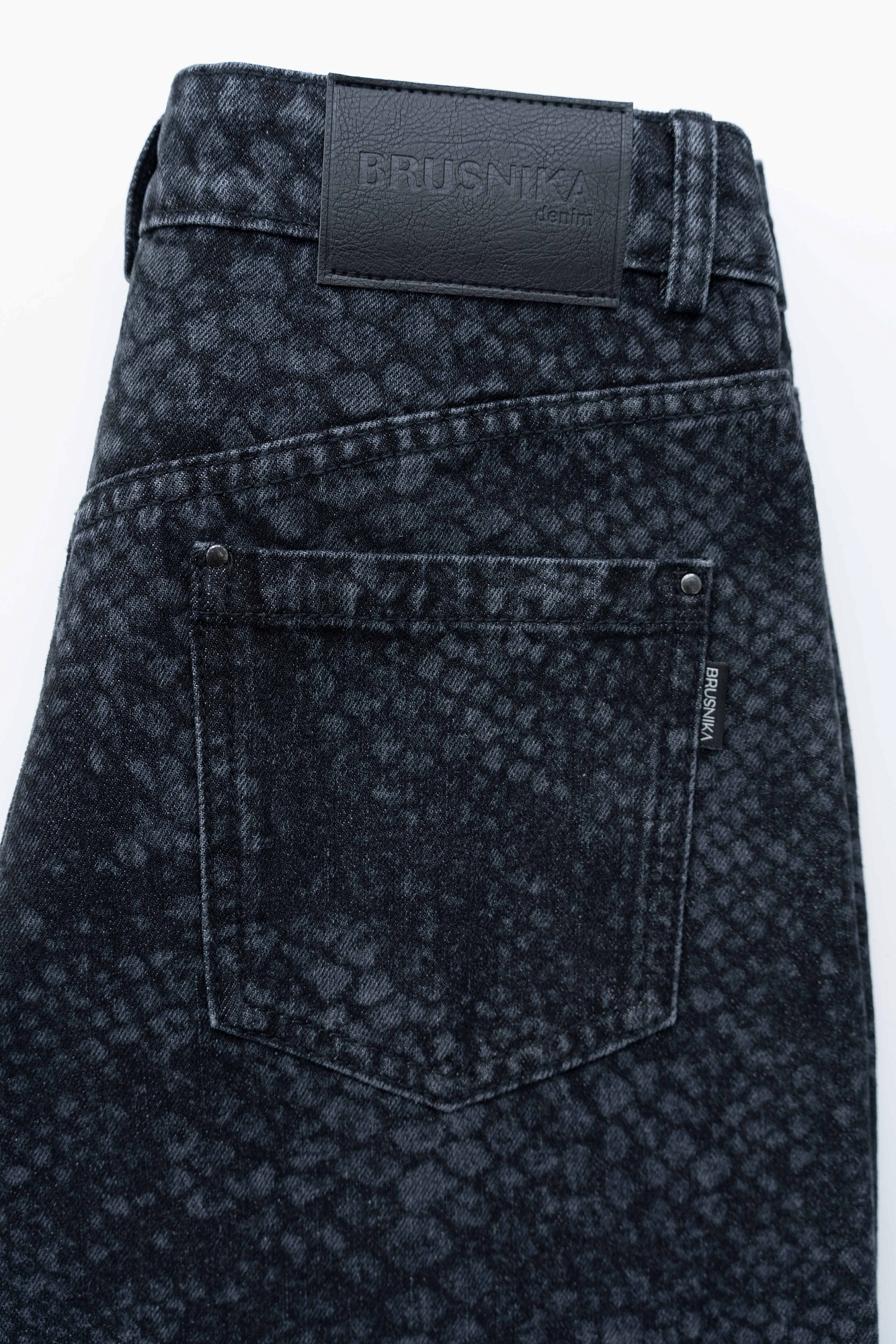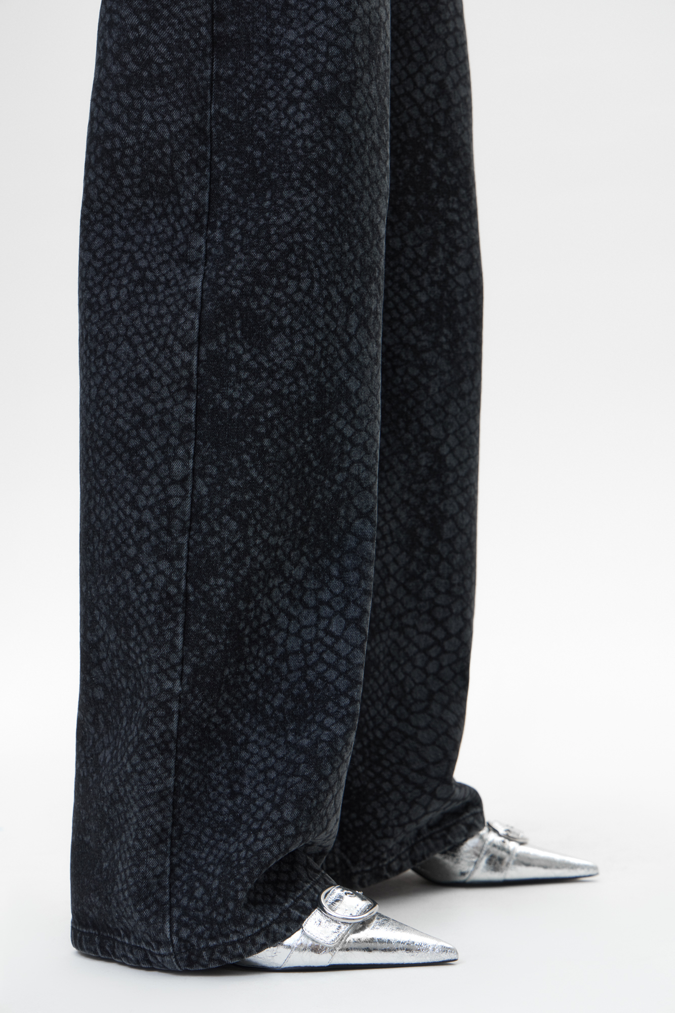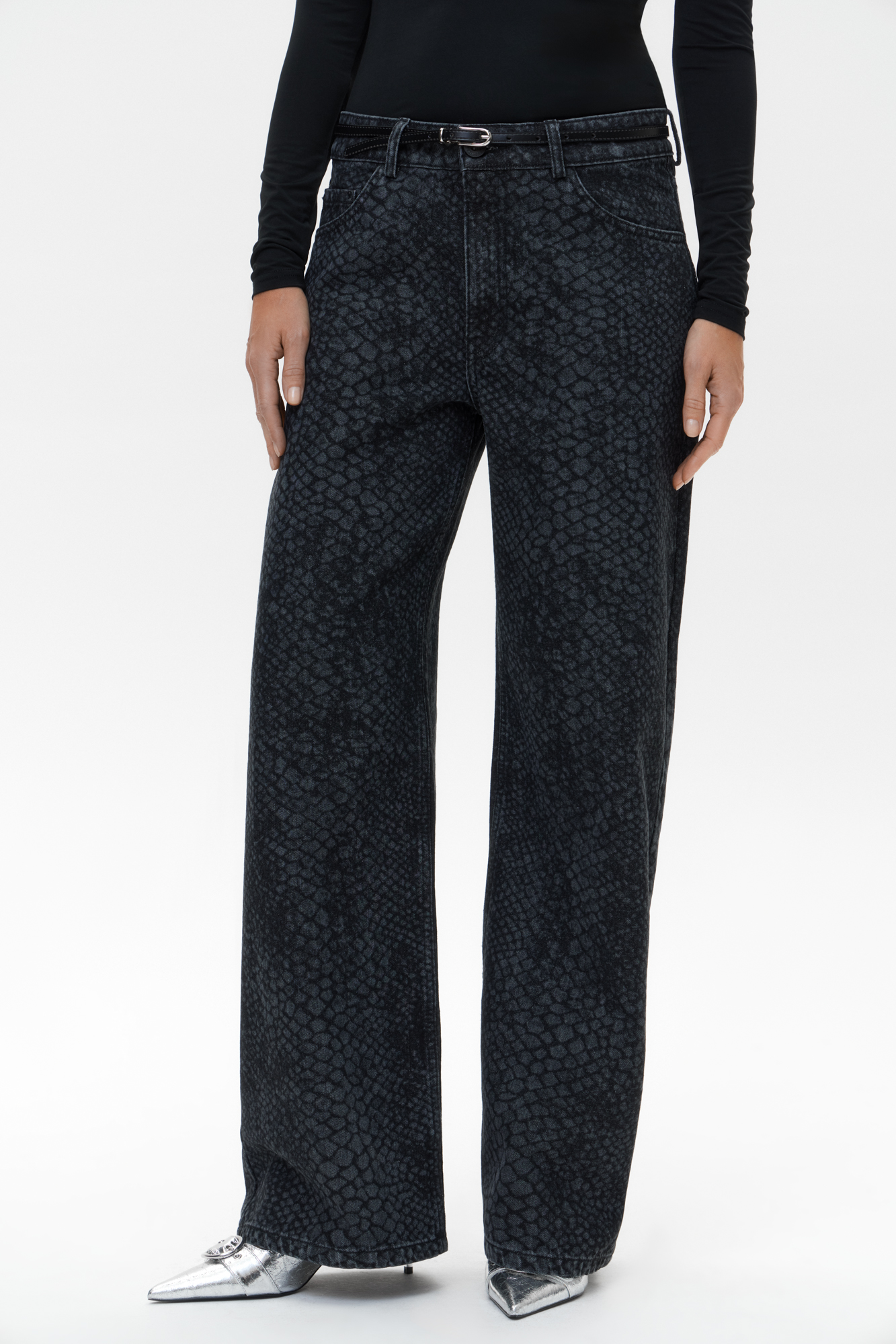 Джинсы с анималистичным принтом чешуи змеи. Модель прямого силуэта со средней посадкой, пять карманов. Застежка на молнию и пуговицу.