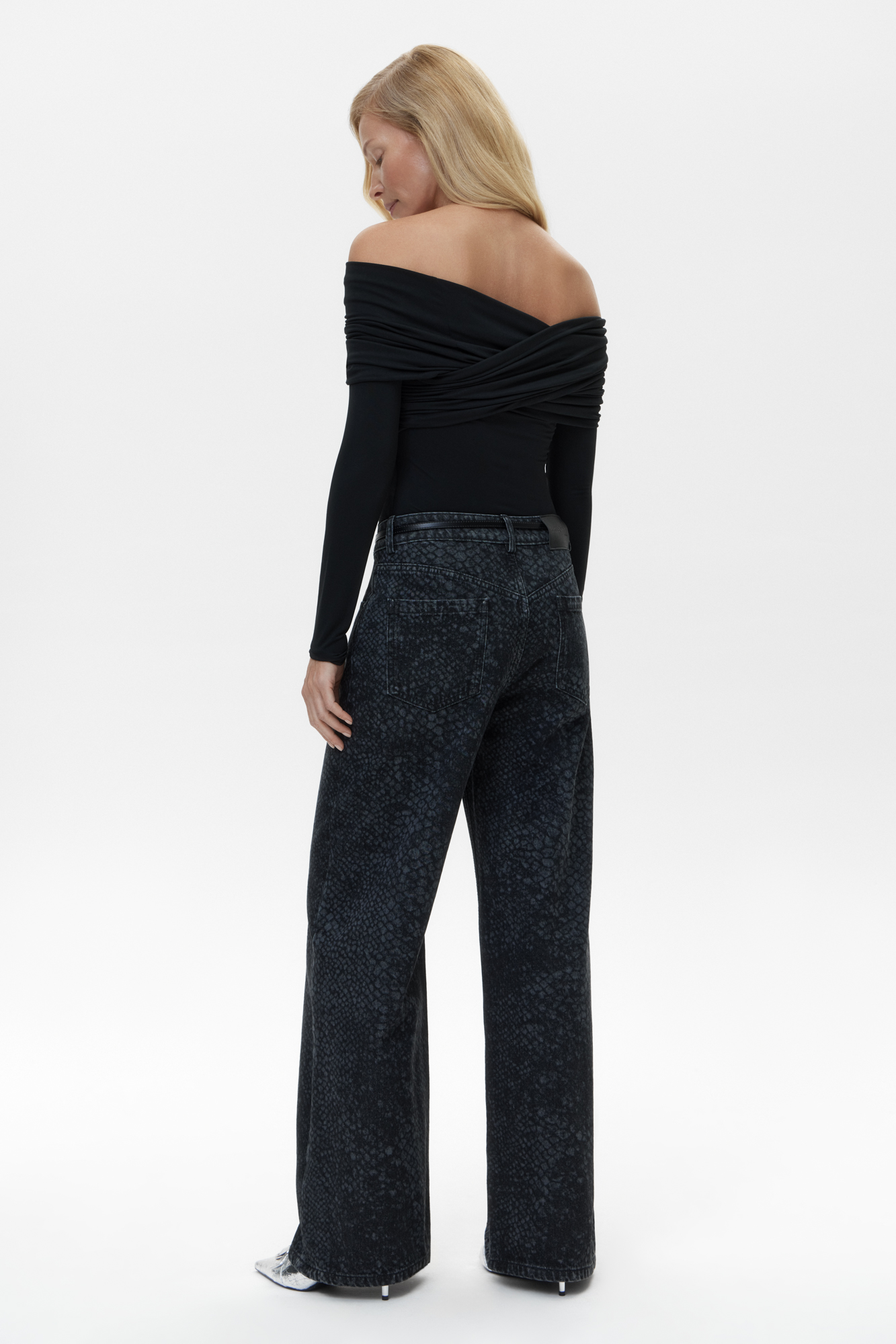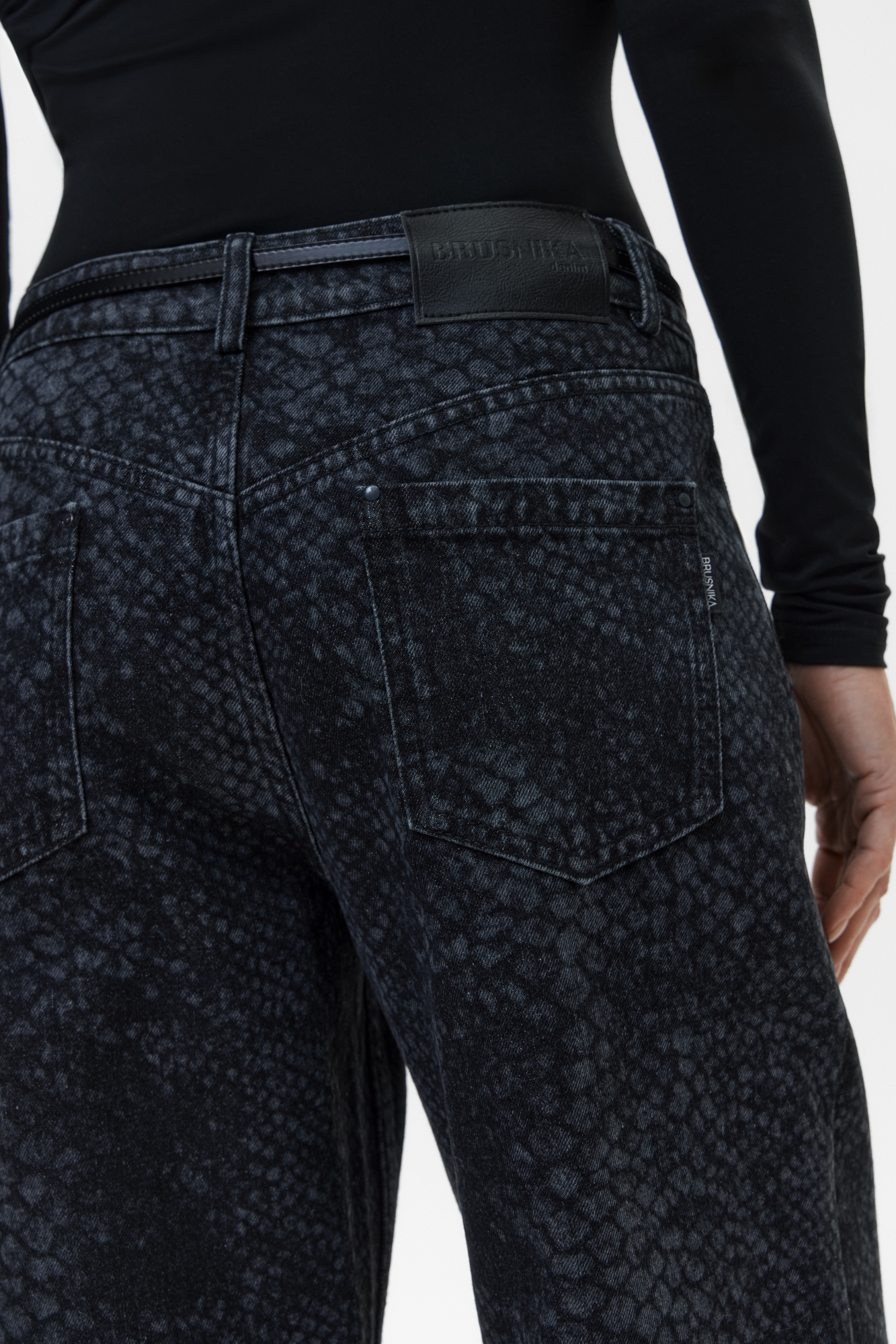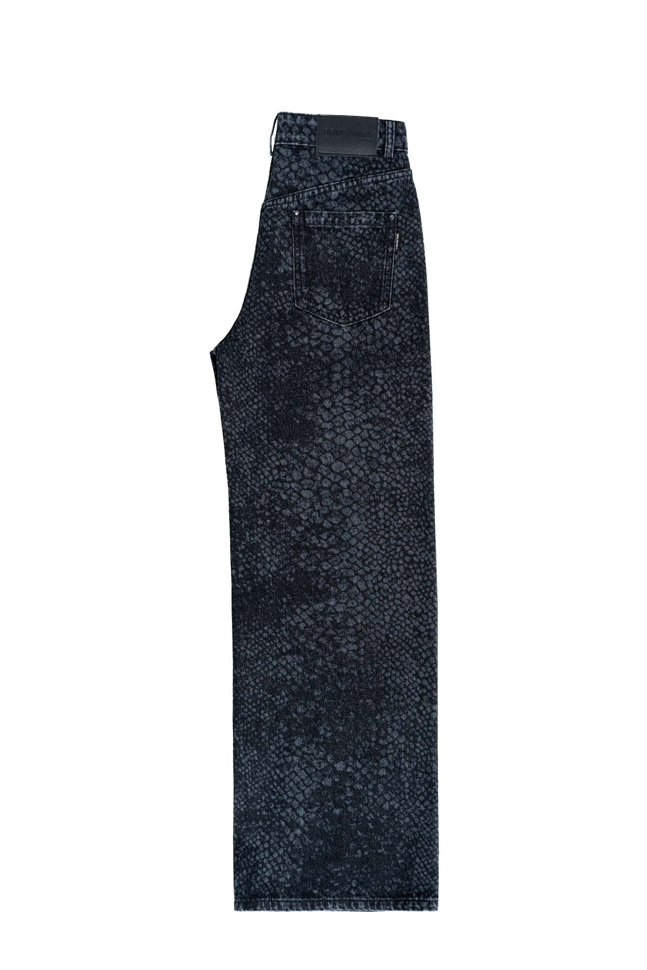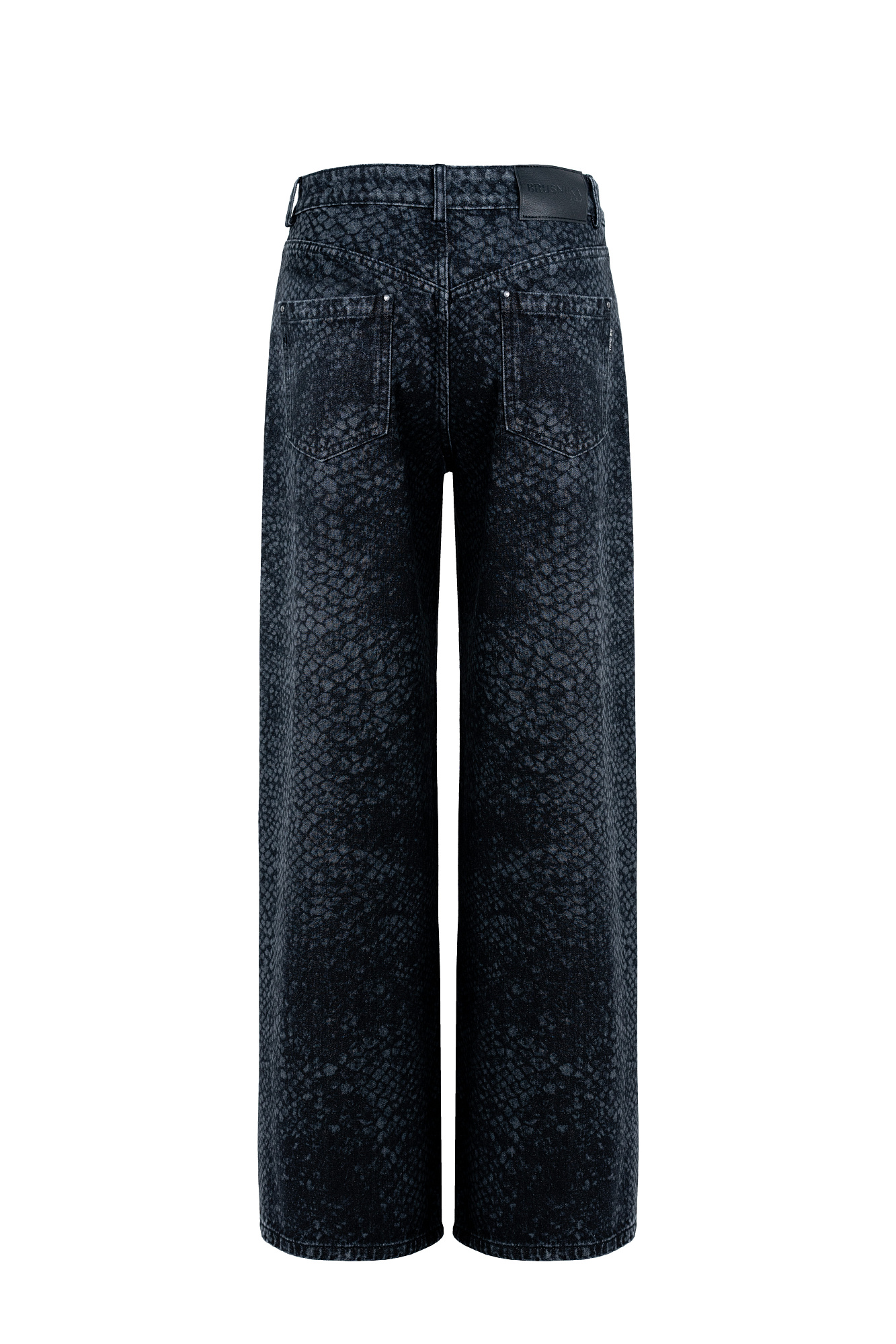Джинсы с анималистичным принтом чешуи змеи. Модель прямого силуэта со средней посадкой, пять карманов. Застежка на молнию и пуговицу.