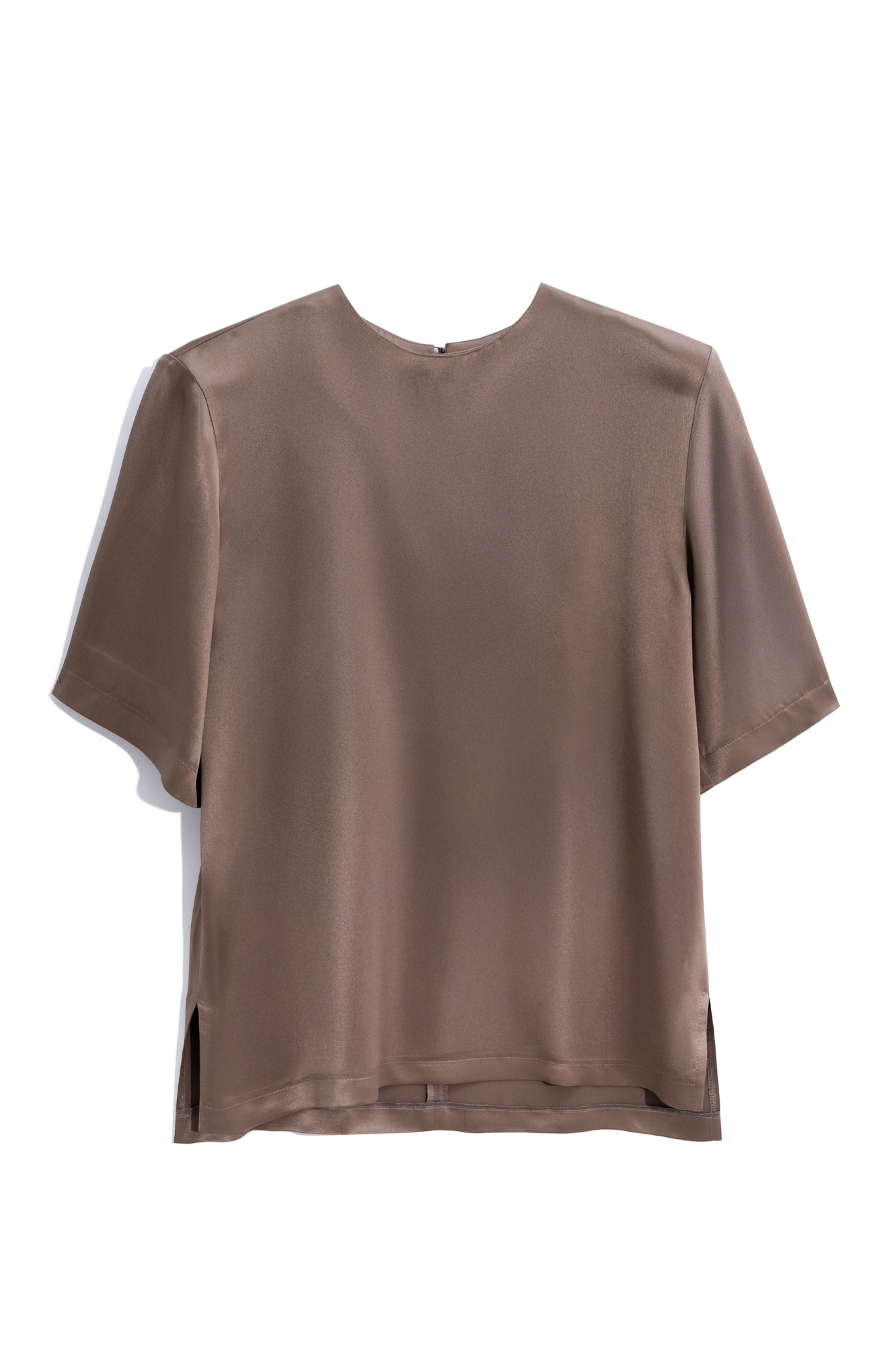 Удлиненная футболка из 100% атласной вискозы. Модель свободного силуэта с подплечниками и широкими рукавами.