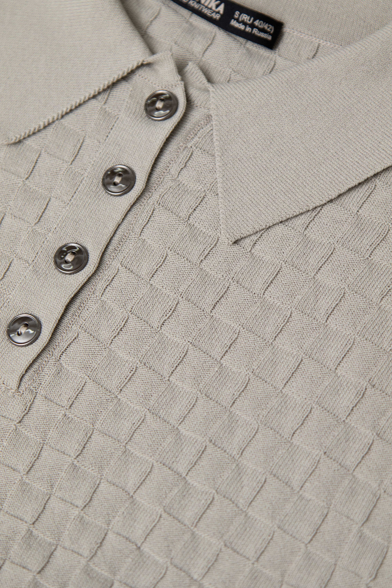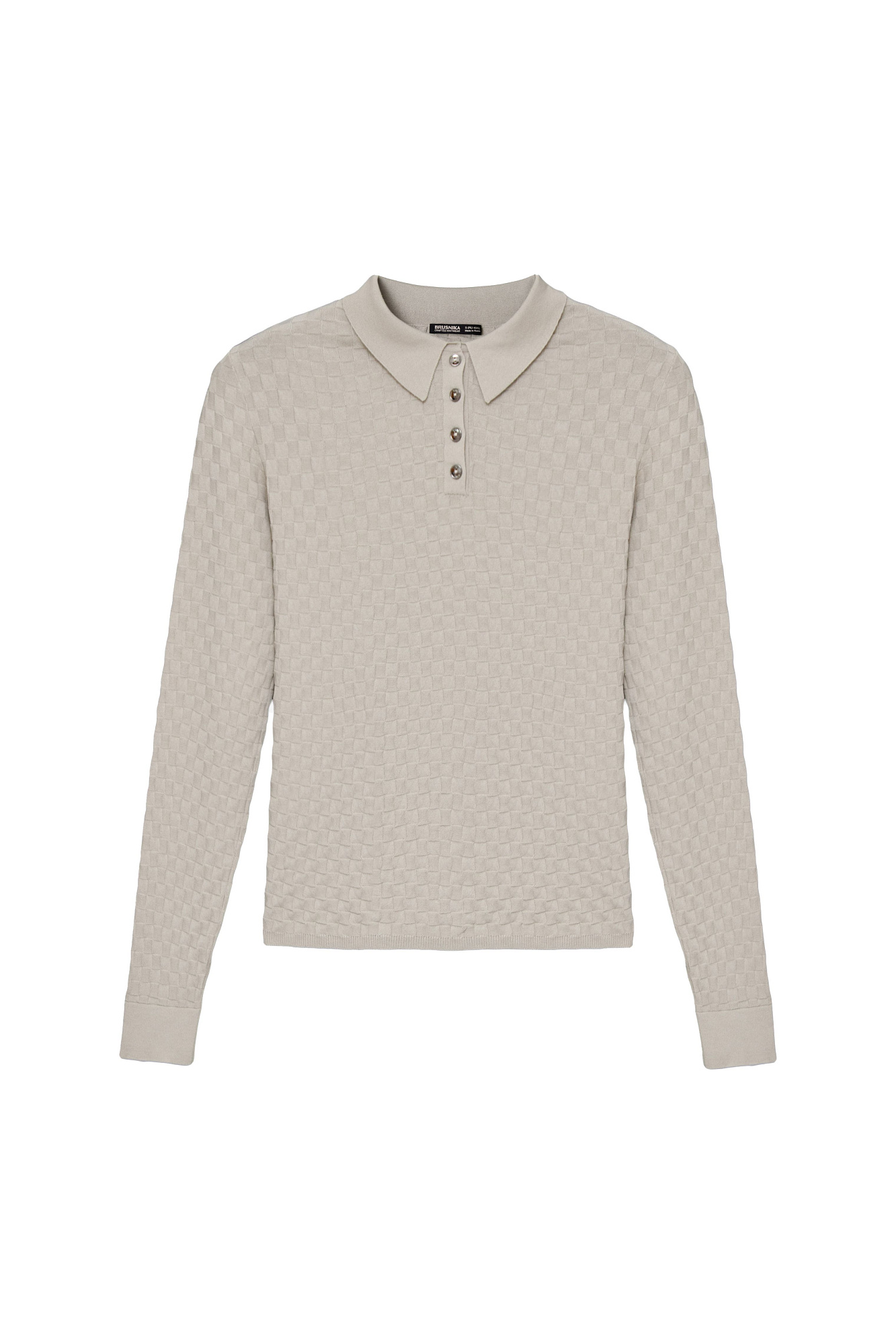 Трикотажная футболка с длинными рукавами, выполненная в клетку. Модель с воротником поло и пуговицами на планке.